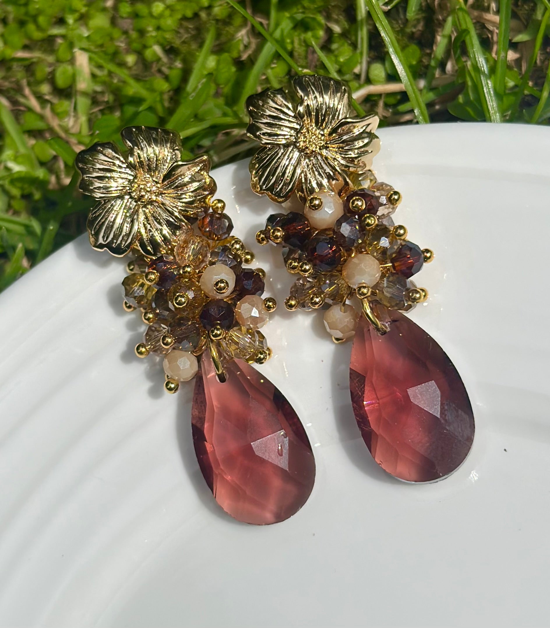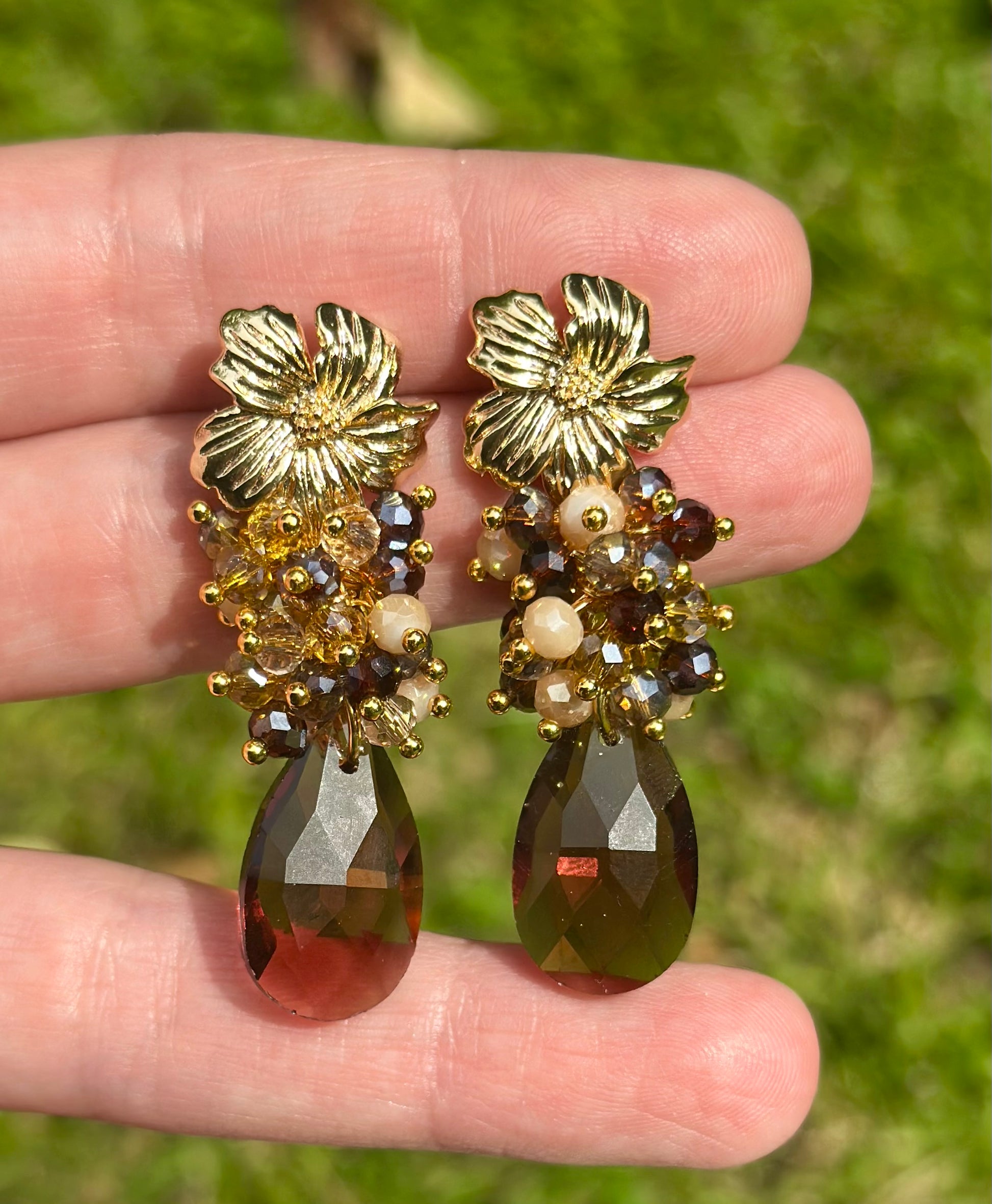 Unos aros clásicos, elegantes y livianos, ideales para un evento especial o para una tenida diaria. Versátiles y modernos, hechos con base de flor chapada en oro, racimo de cristales facetados y cristal final en forma de gota.