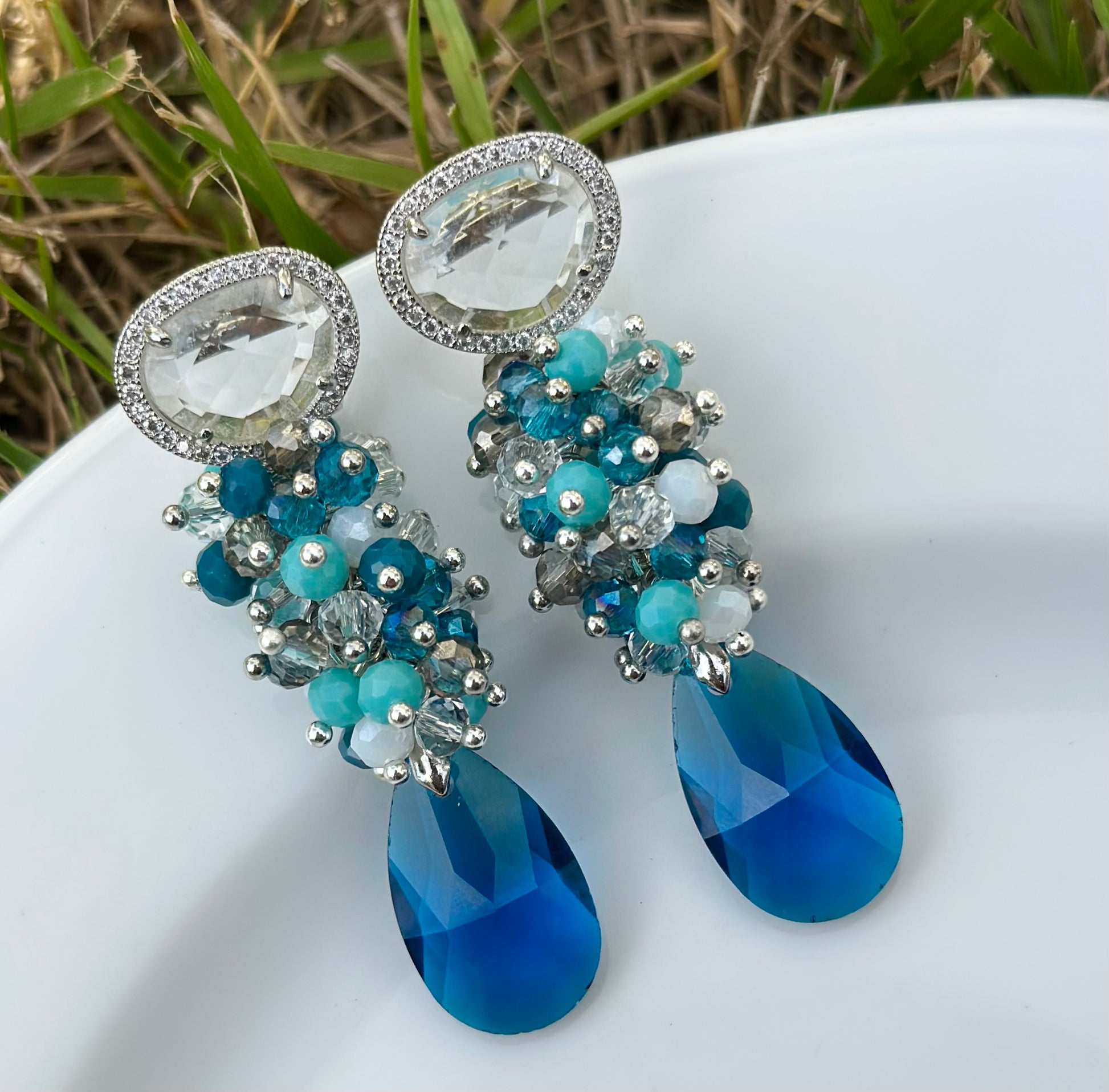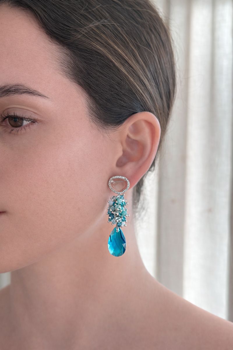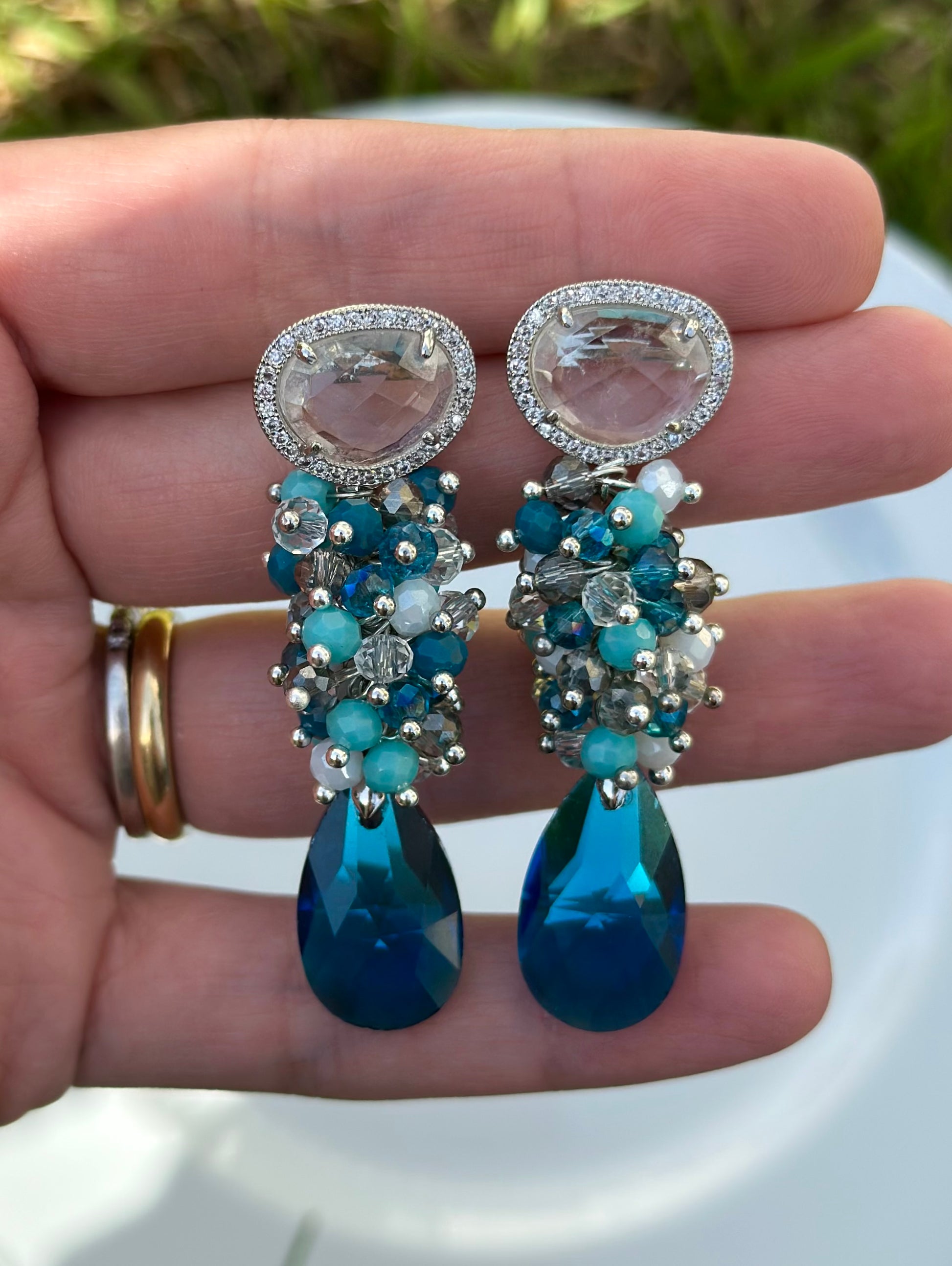 Aros largos y luminosos, compuestos por una base ovalada de cuarzo transparente , rodeada de delicados circones que aportan brillo sutil. Racimo de cristales facetados en tonos turquesas y culmina en un cristal en forma de gota. Un diseño femenino y sofisticado, perfecto para ocasiones especiales o para elevar un look con luz y carácter.