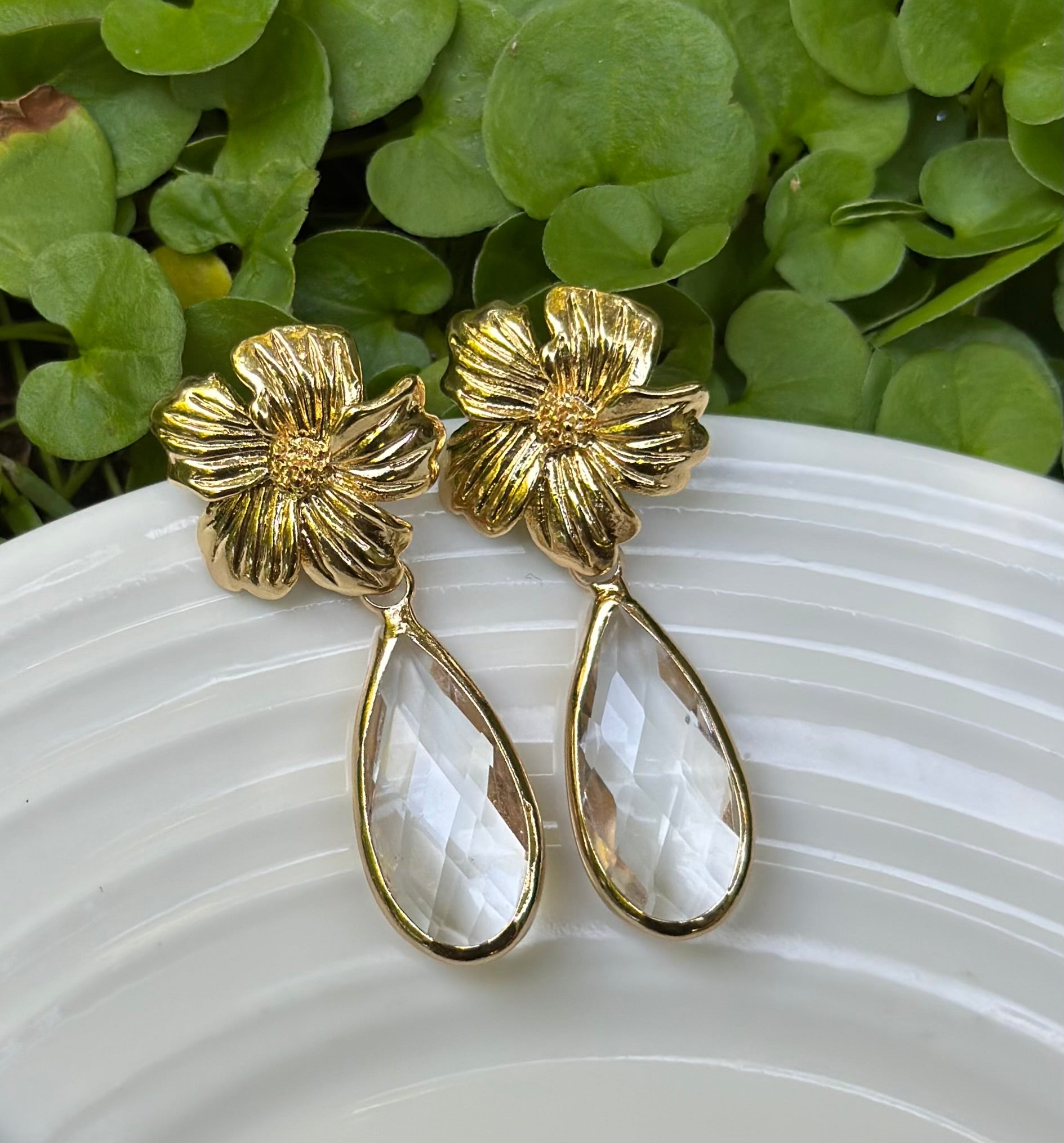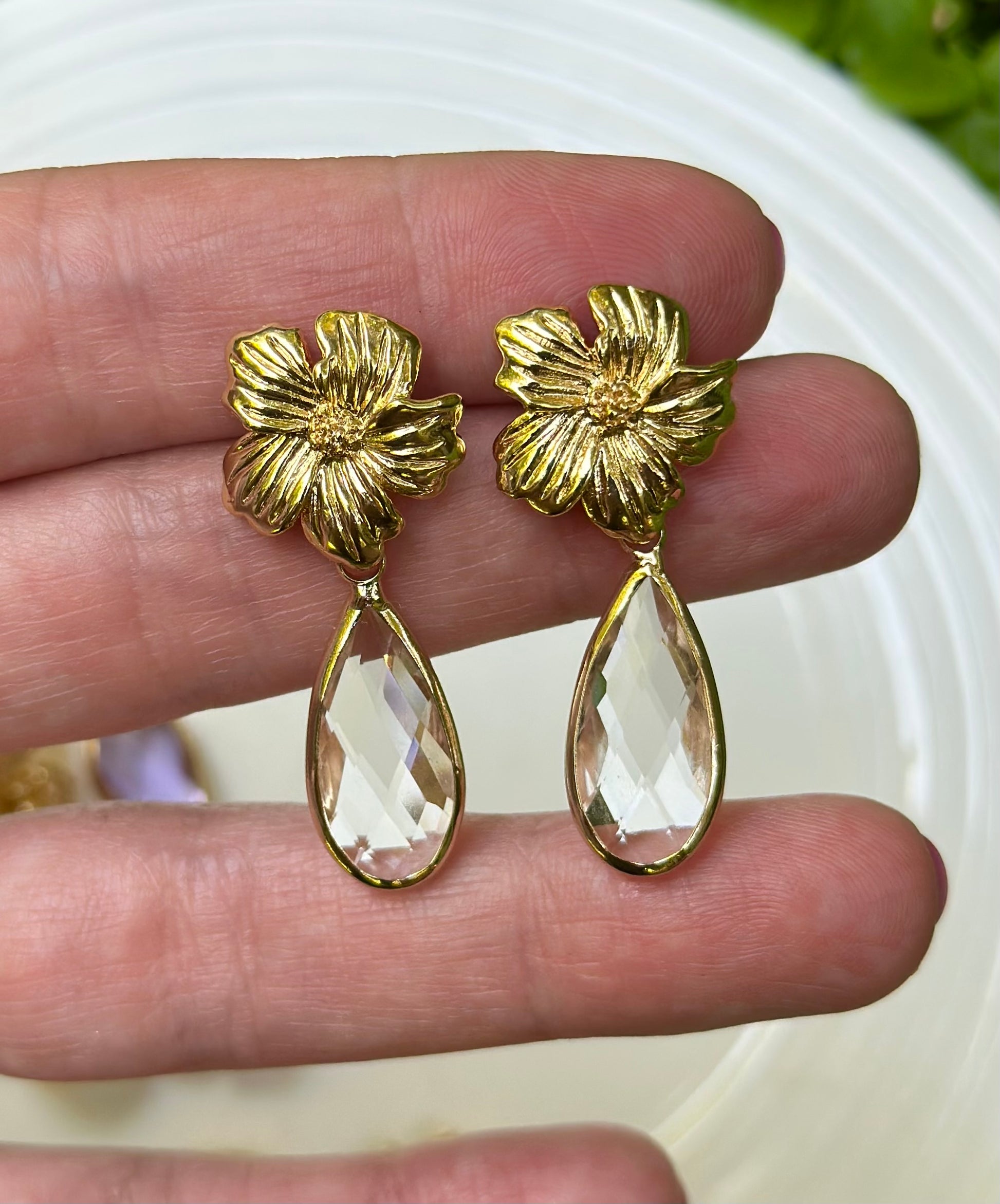 Aros delicados ideales para usar todos los días, para un evento único e incluso para tu matrimonio. Con base de flor bañada en oro y cristal transparente en forma de gota, también bañada en oro.