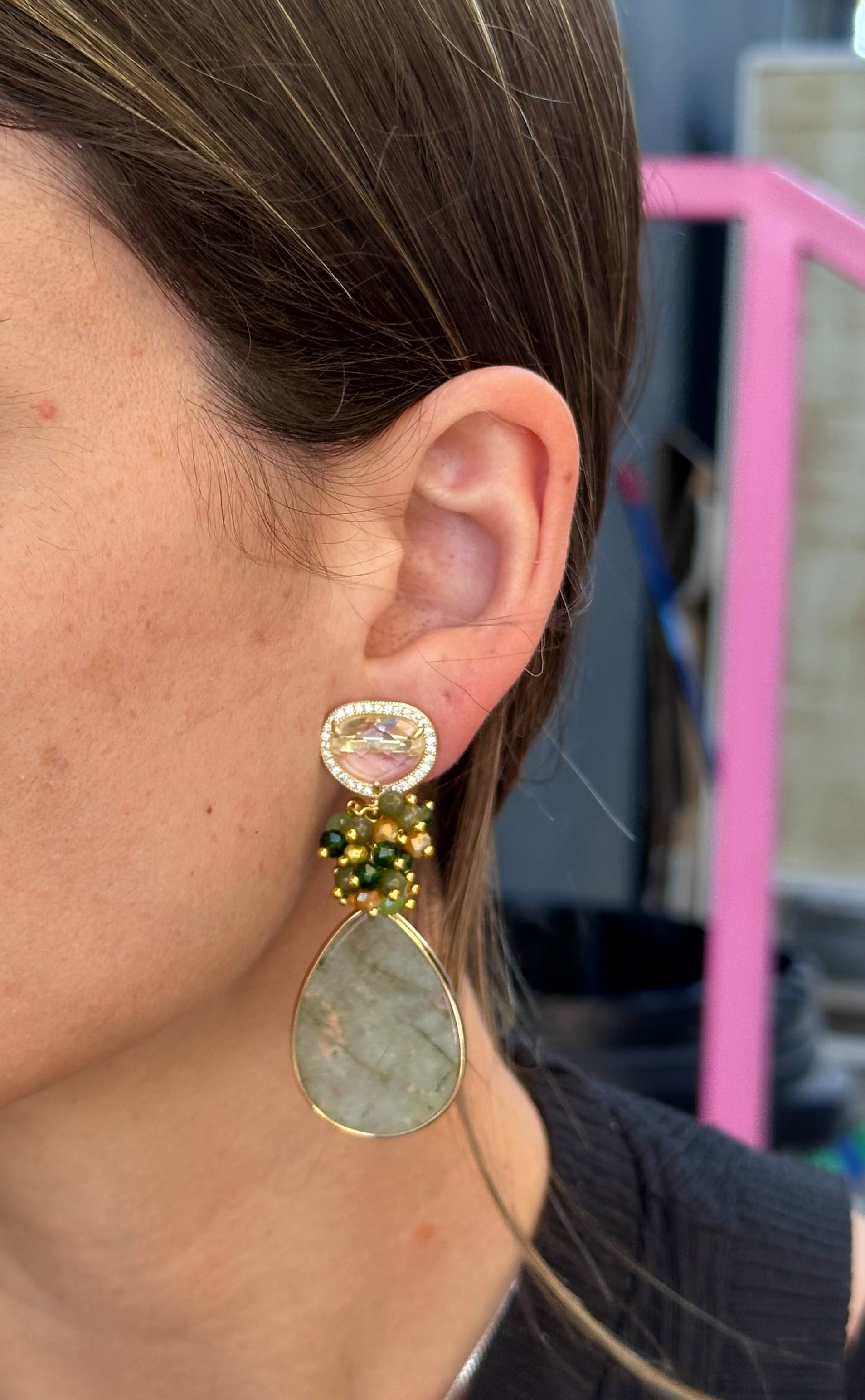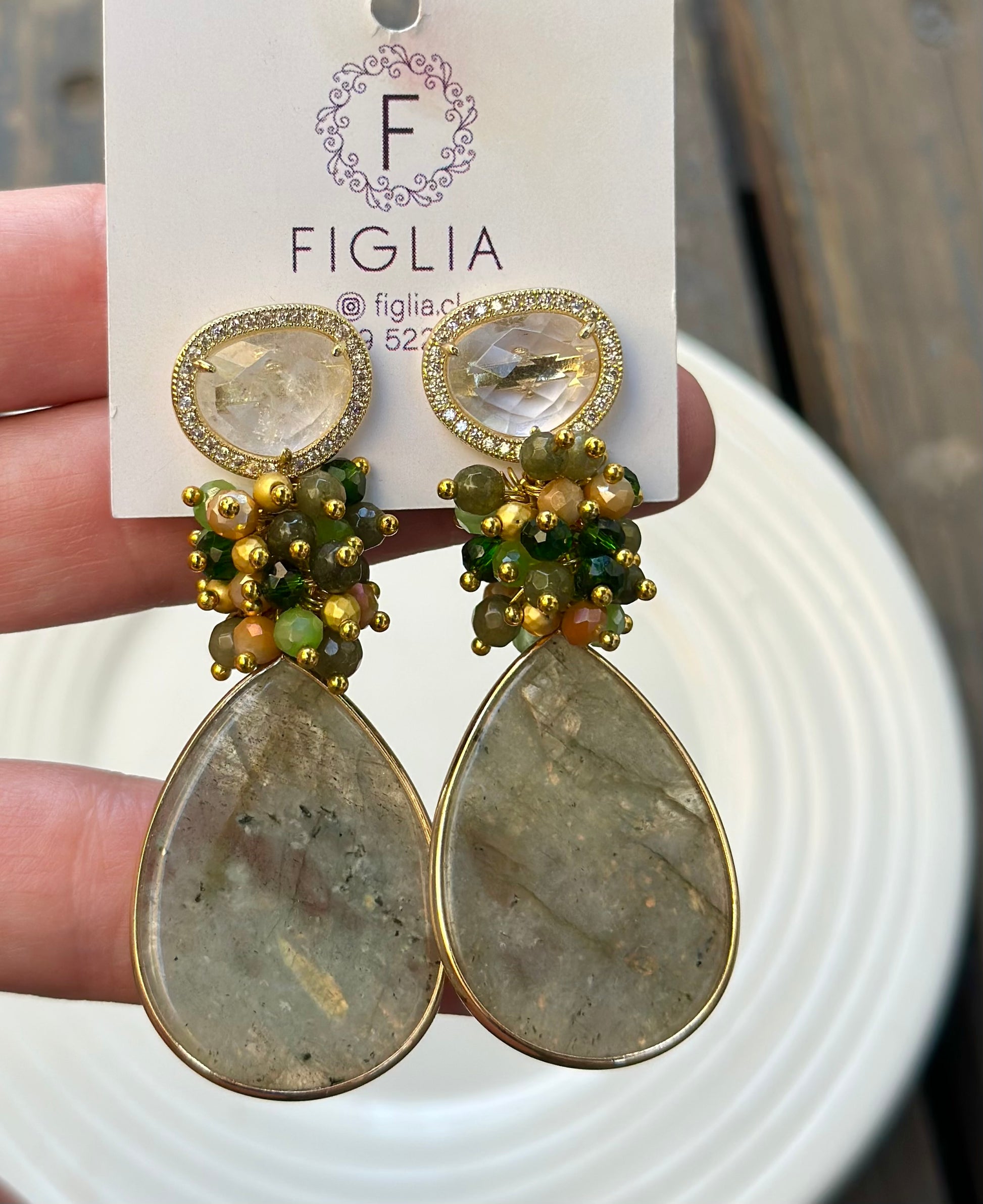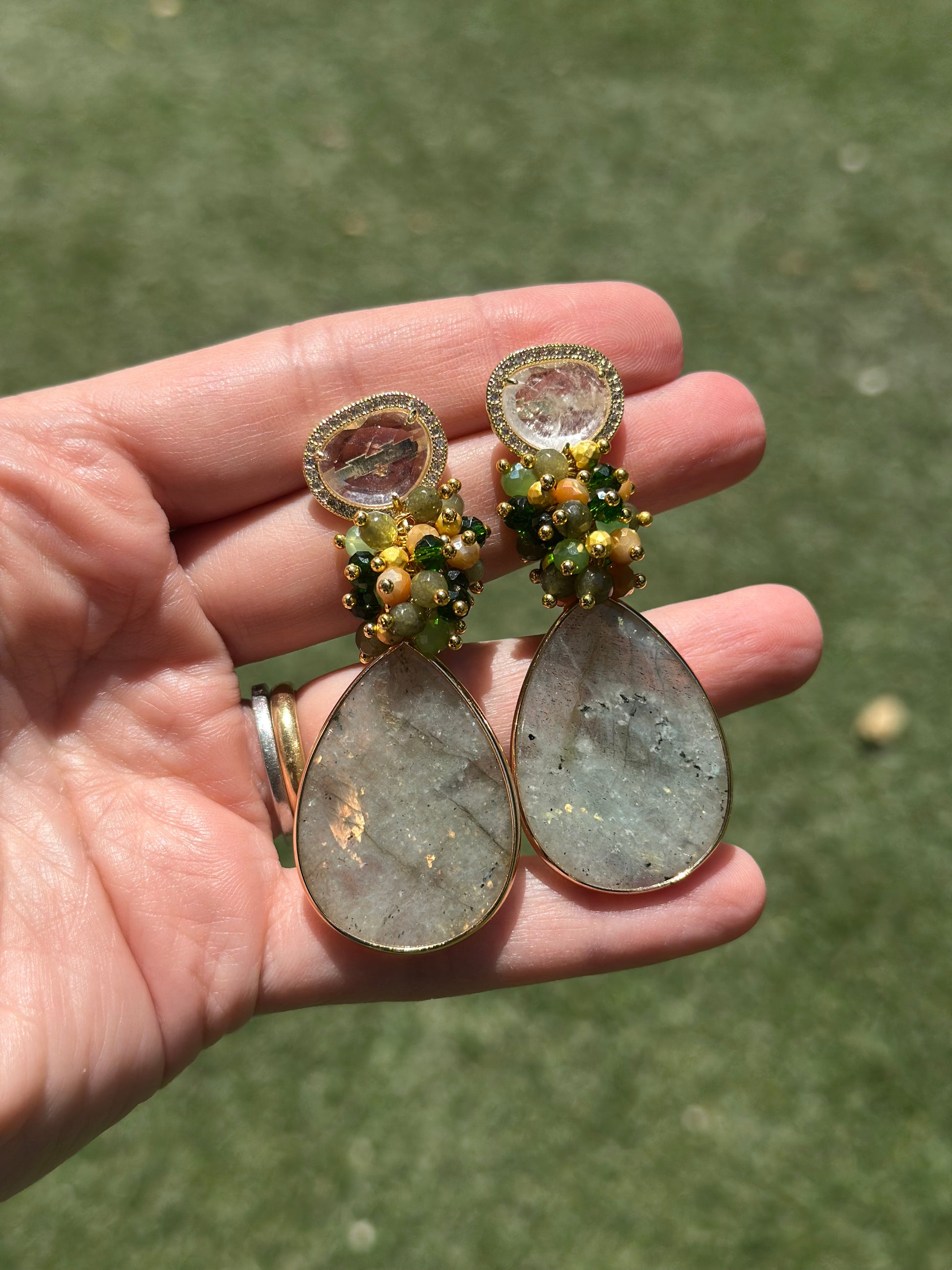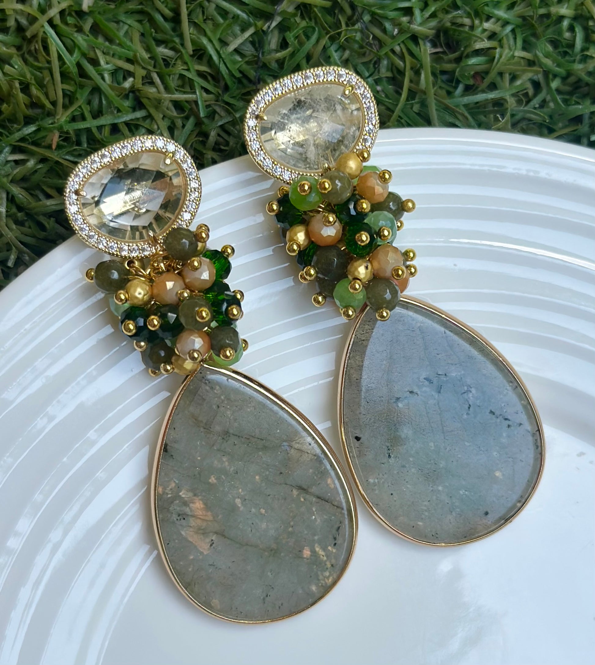Un aro maravilloso y protagonista. Chapado en oro en su totalidad, base de cuarzo blanco rodeado de circones, racimo de cristales fascetados y piedra final labradorita.