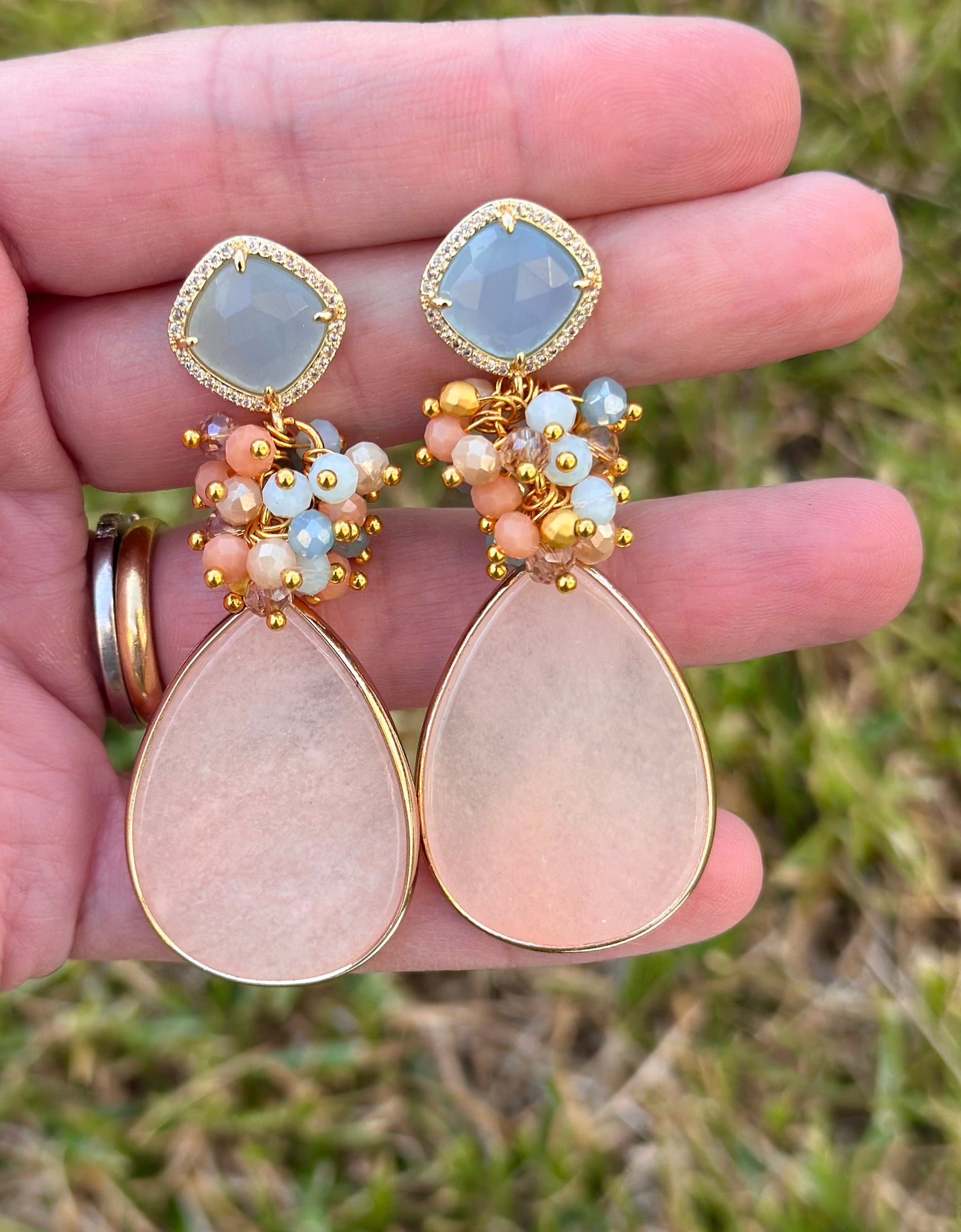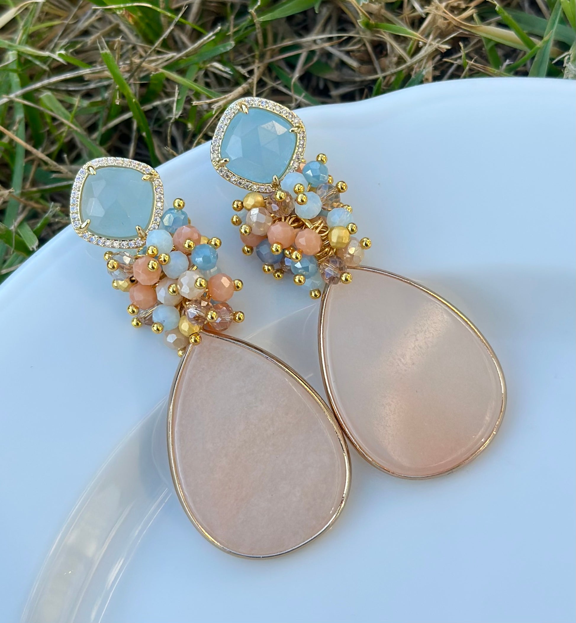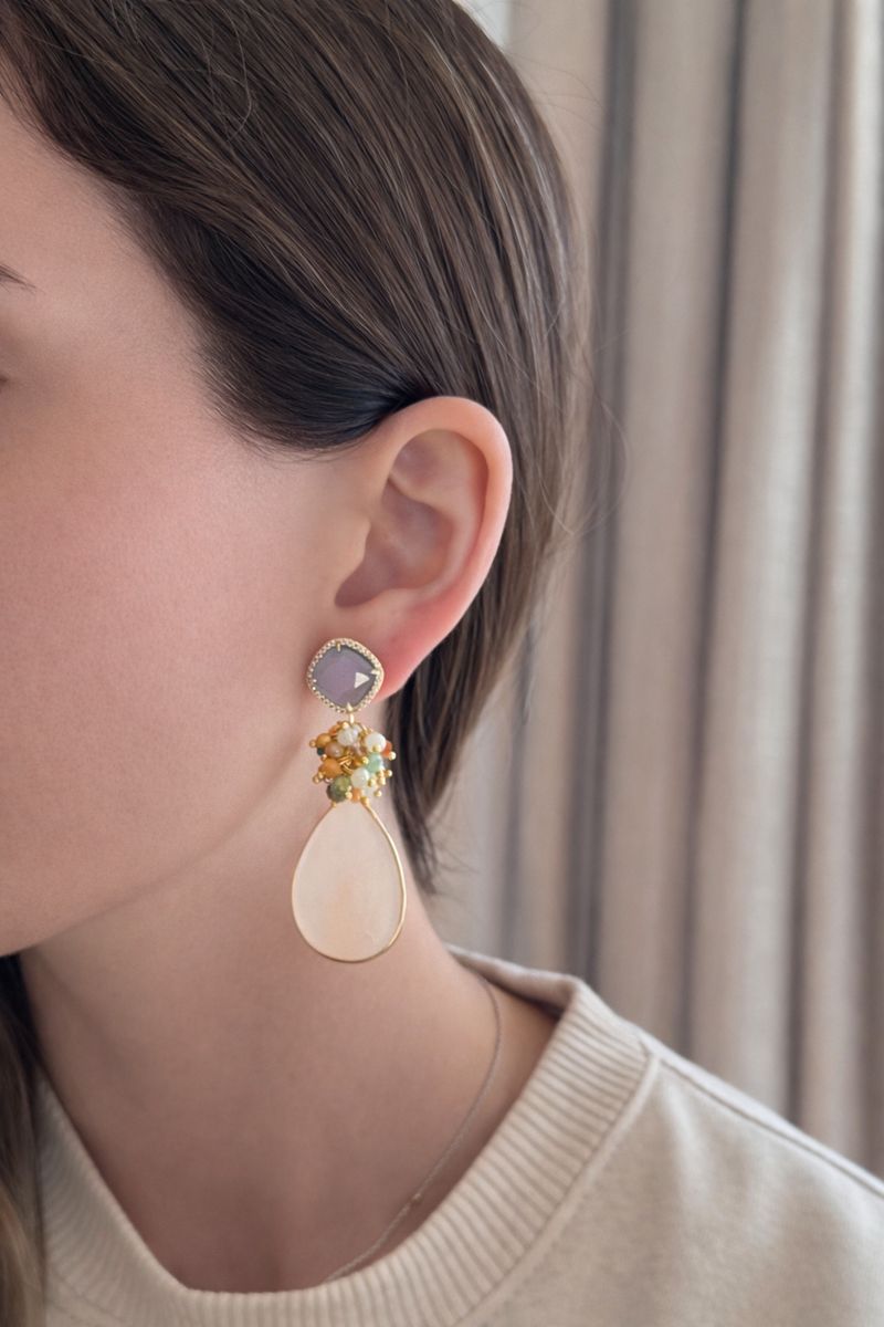 Un aro maravilloso y protagonista. Chapado en oro en su totalidad, base de cuarzo celeste rodeado de circones, racimo de cristales facetados y piedra final calcedonia.