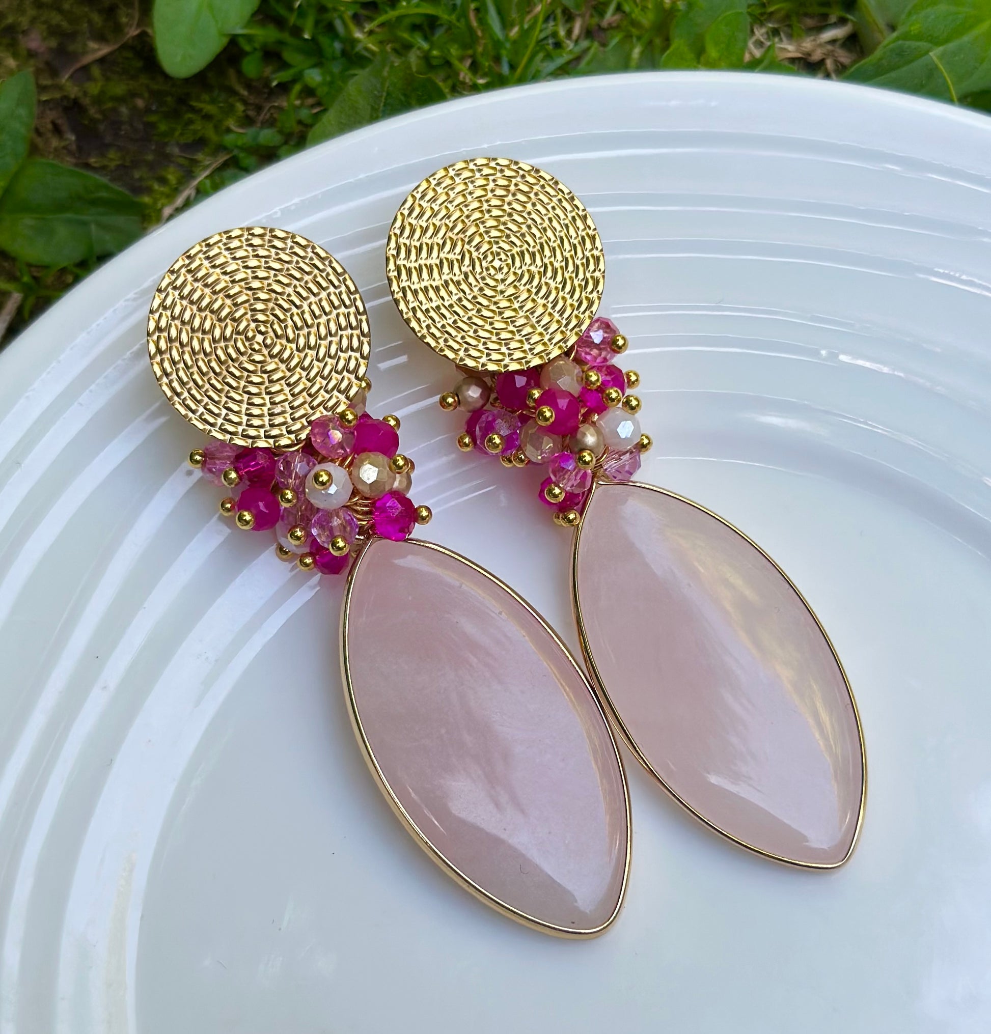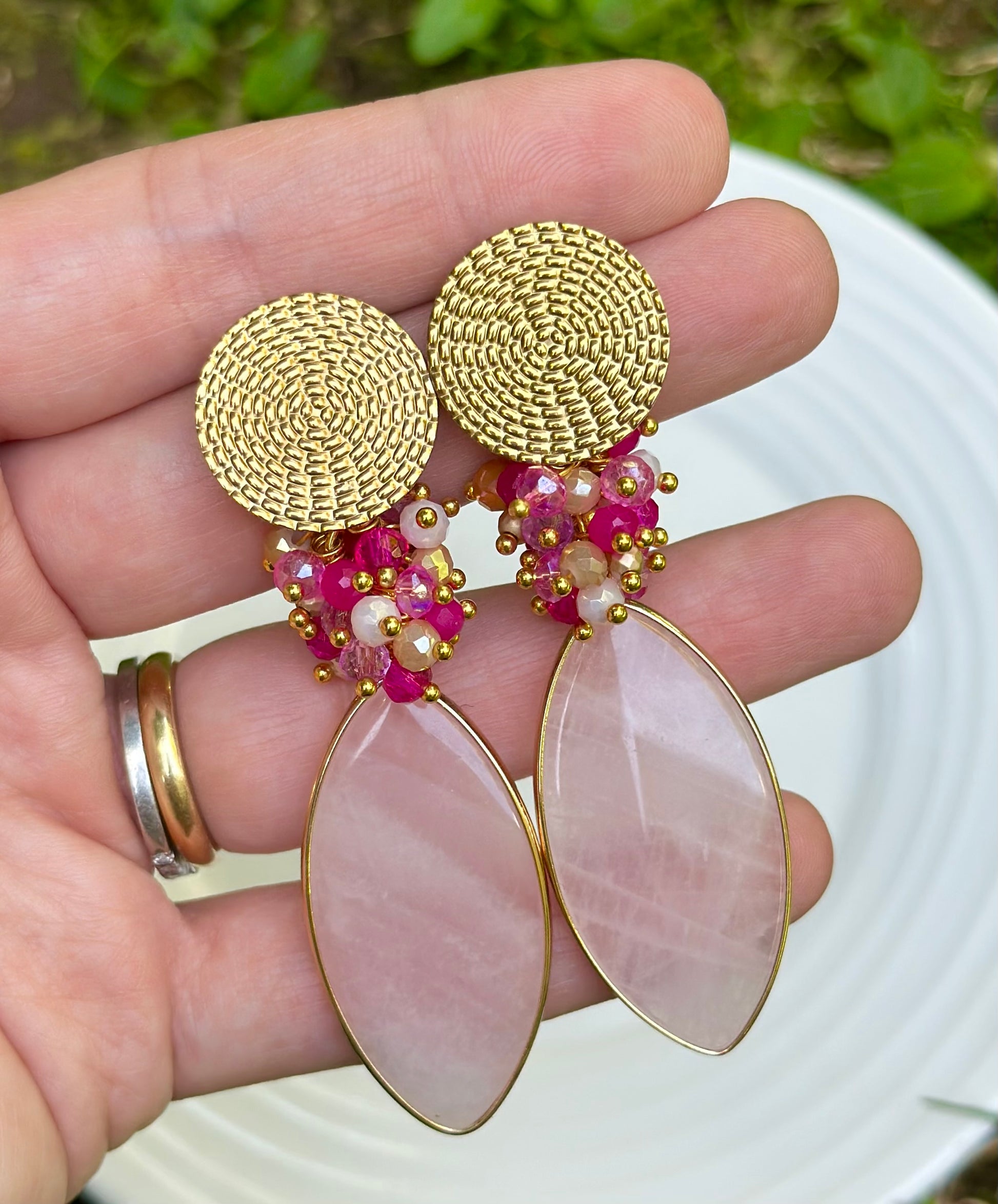Aro con base redonda chapada en oro, racimo de cristales facetados y piedra cuarzo rosado.