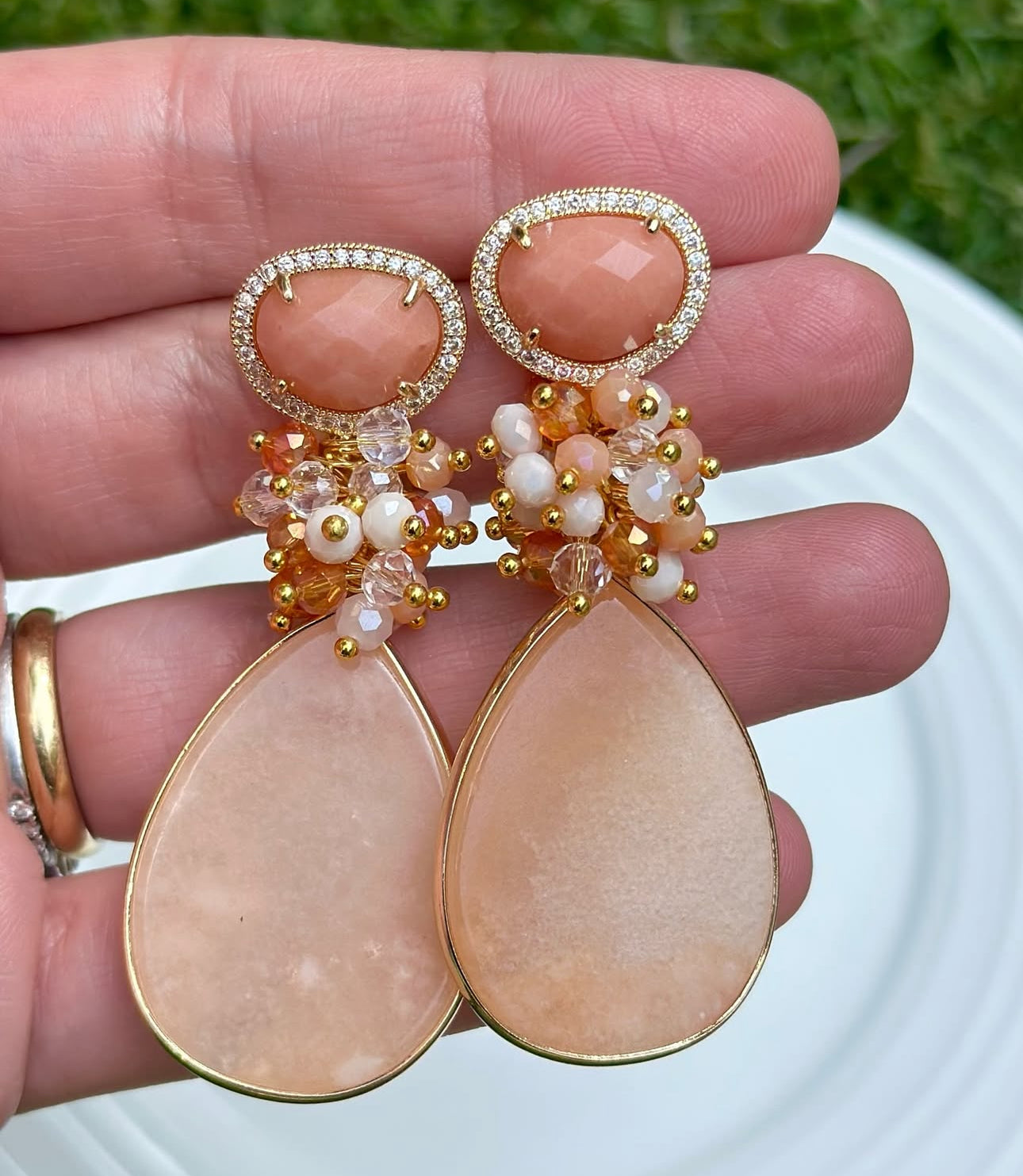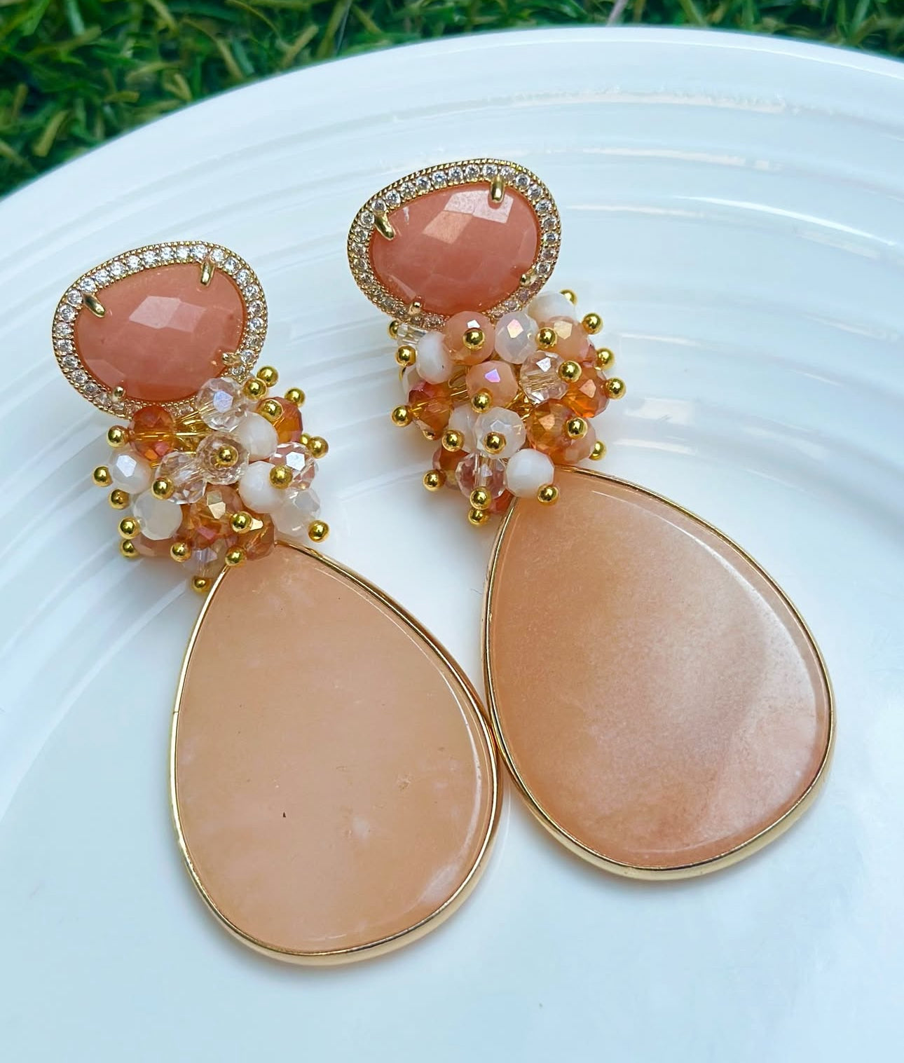 Aros largos y luminosos, compuestos por una base ovalada de piedra sol , rodeada de delicados circones que aportan brillo sutil. Desde el centro cae un racimo artesanal de cristales facetados en tonos nude, marfil y ámbar, que culmina en una piedra final calcedonia en forma de gota, creando movimiento y armonía. Un diseño femenino y sofisticado, perfecto para ocasiones especiales o para elevar un look con luz y carácter.