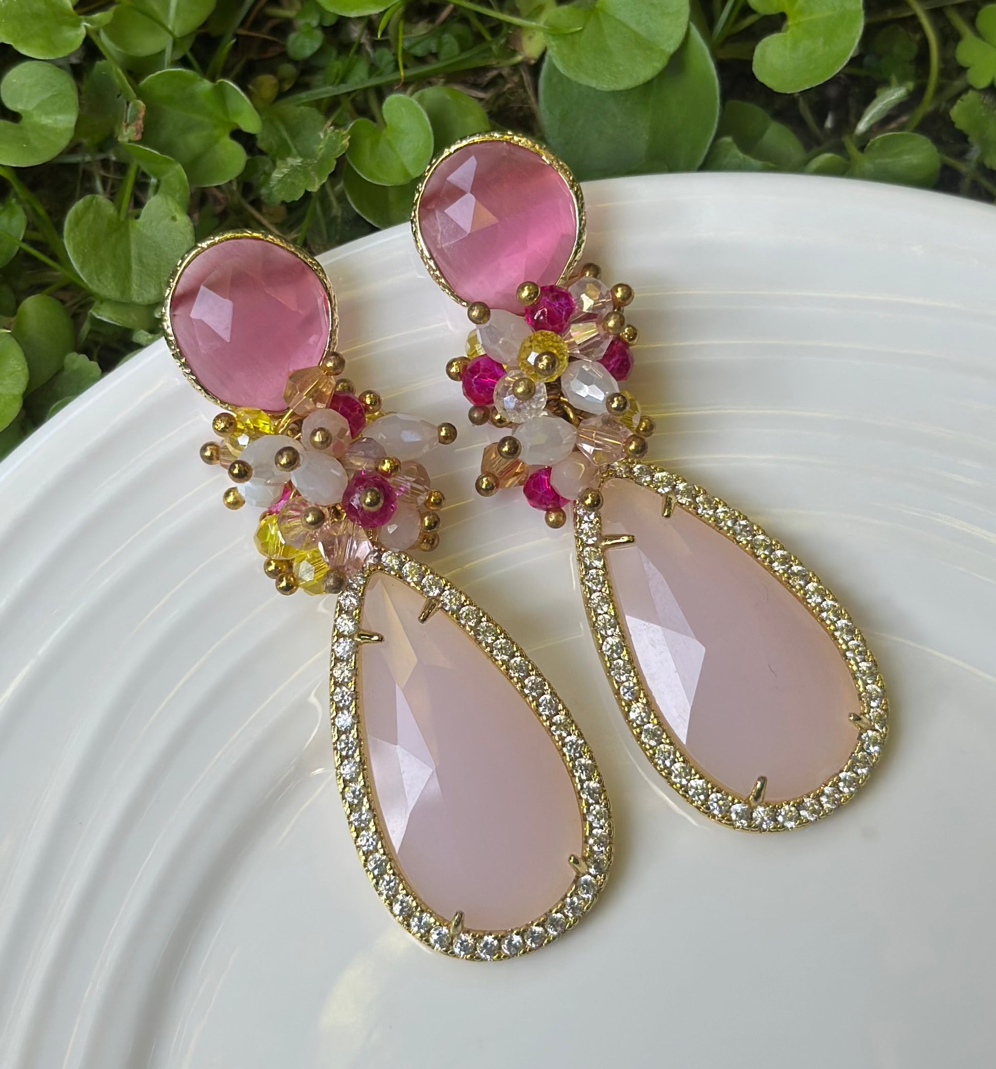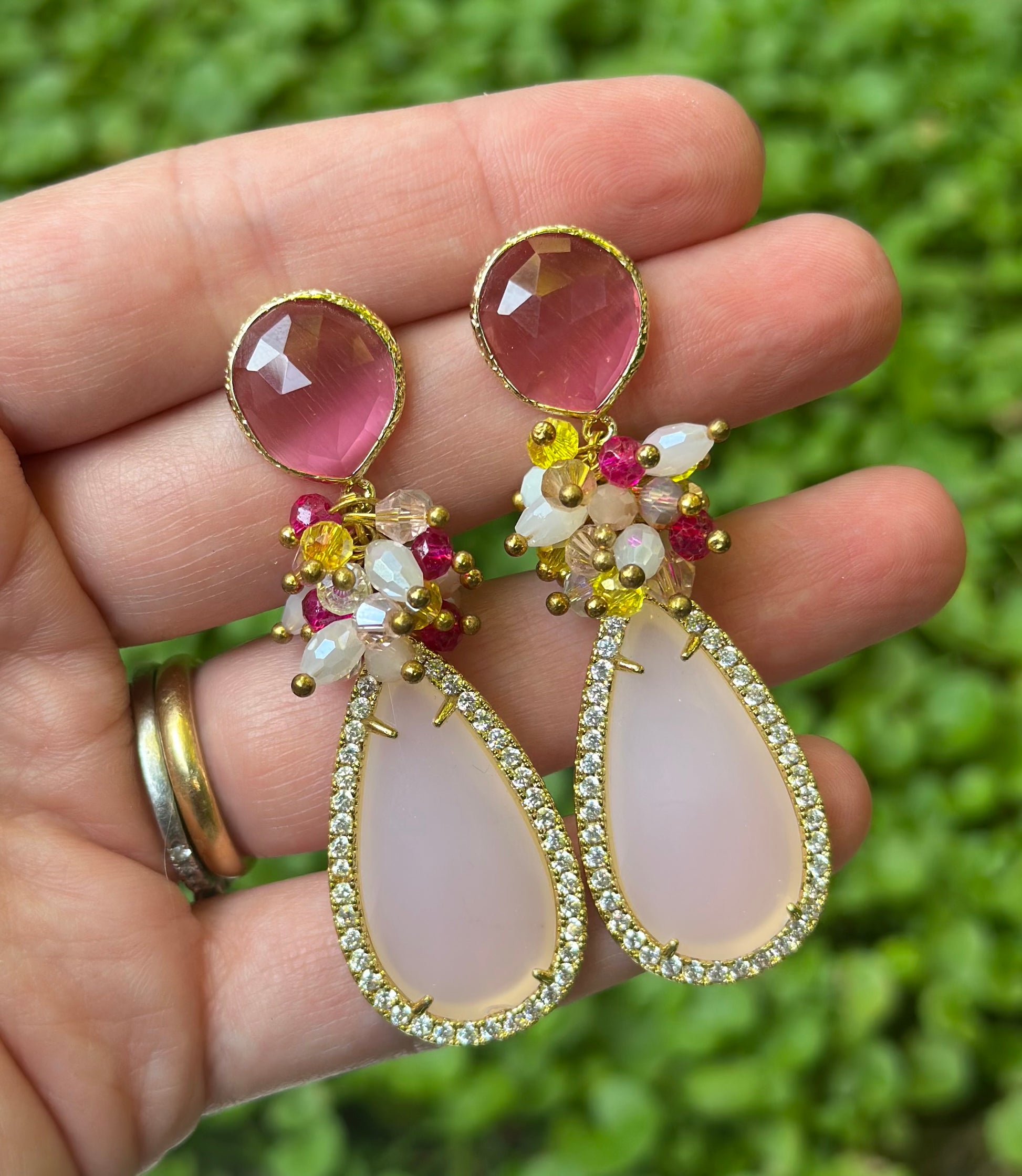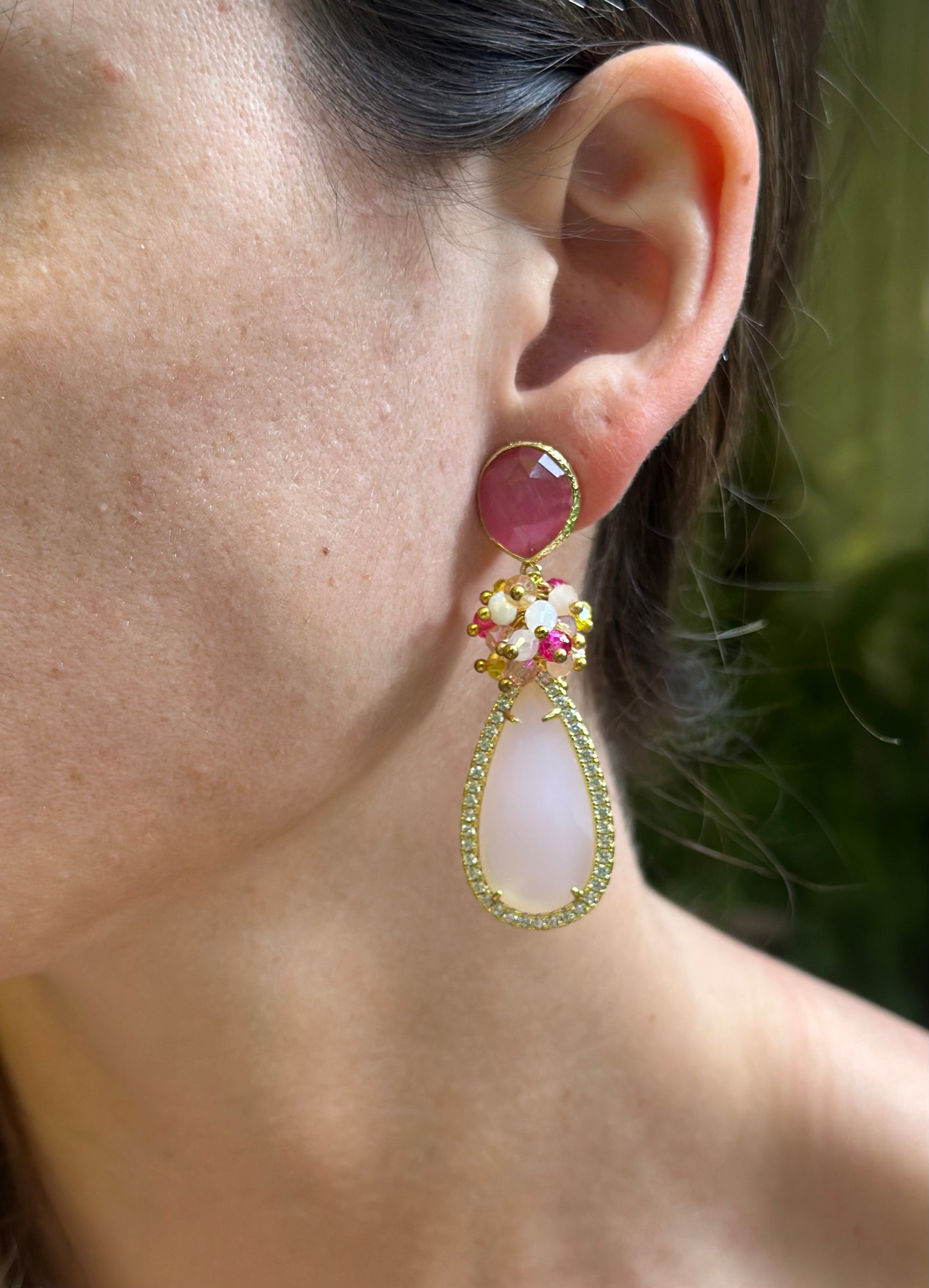 Aros en tonalidades rosa con una base de piedra ojo gato, racimo de cristales facetados y piedra final ojo de gato rodeada de circones. Un aro elegante, clásico y protagonista. Chapado en oro.
