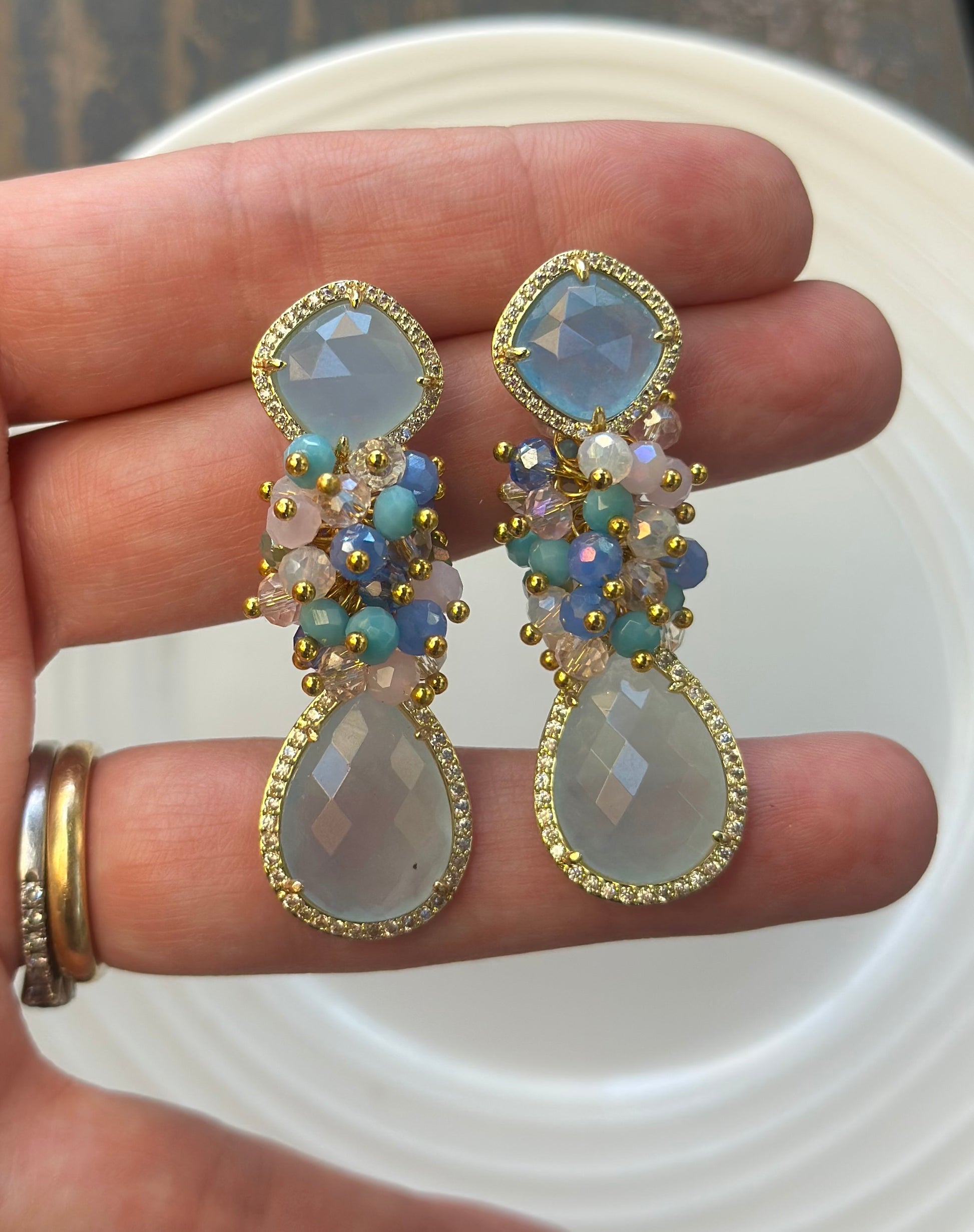 Si buscas un aro armónico, protagonista y lleno de luz, este es! Jade celeste rodeado de circones con un racimo de cristales facetados entre medio.