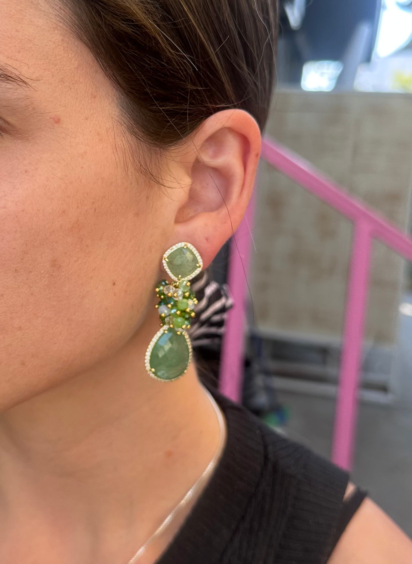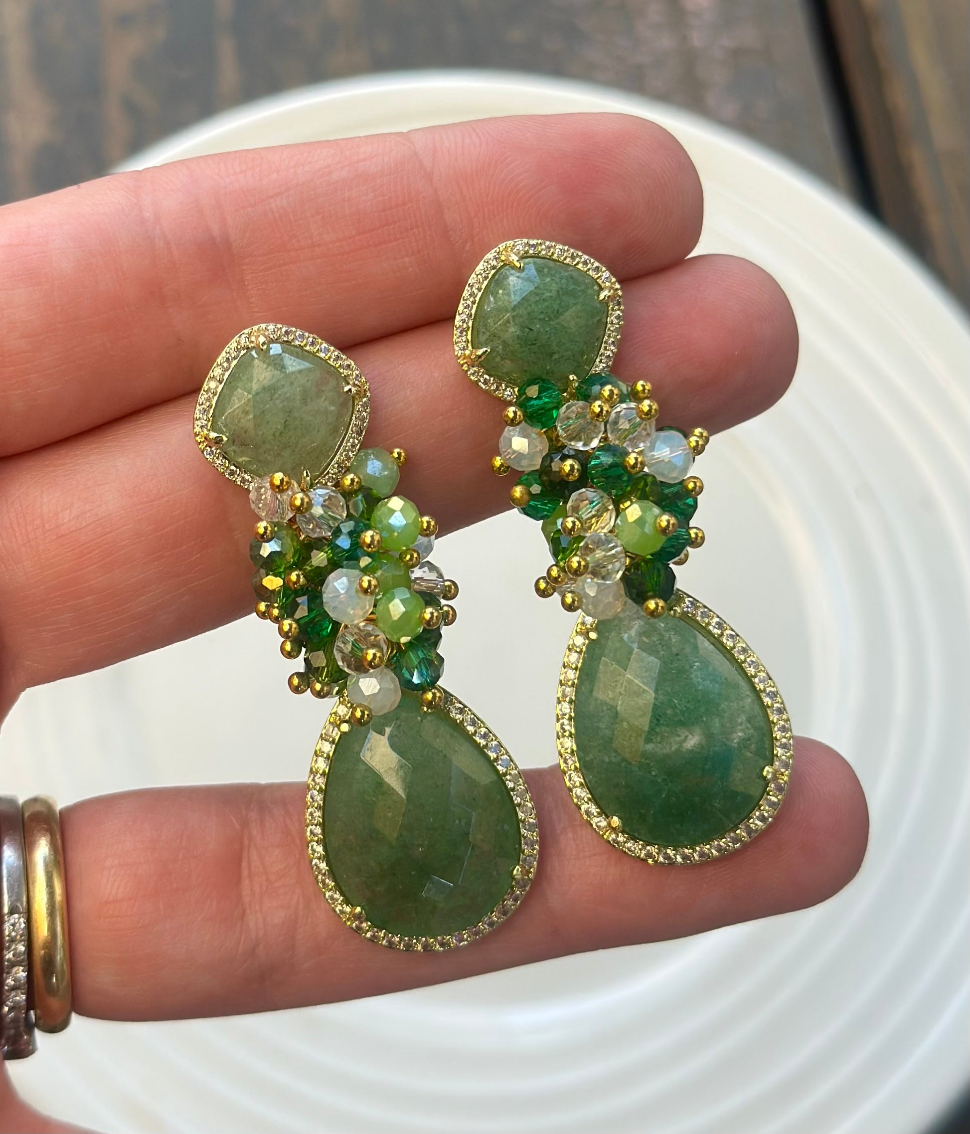 Si buscas un aro armónico, protagonista y lleno de luz, este es! Amazonita rodeado de circones con un racimo de cristales facetados entre medio.