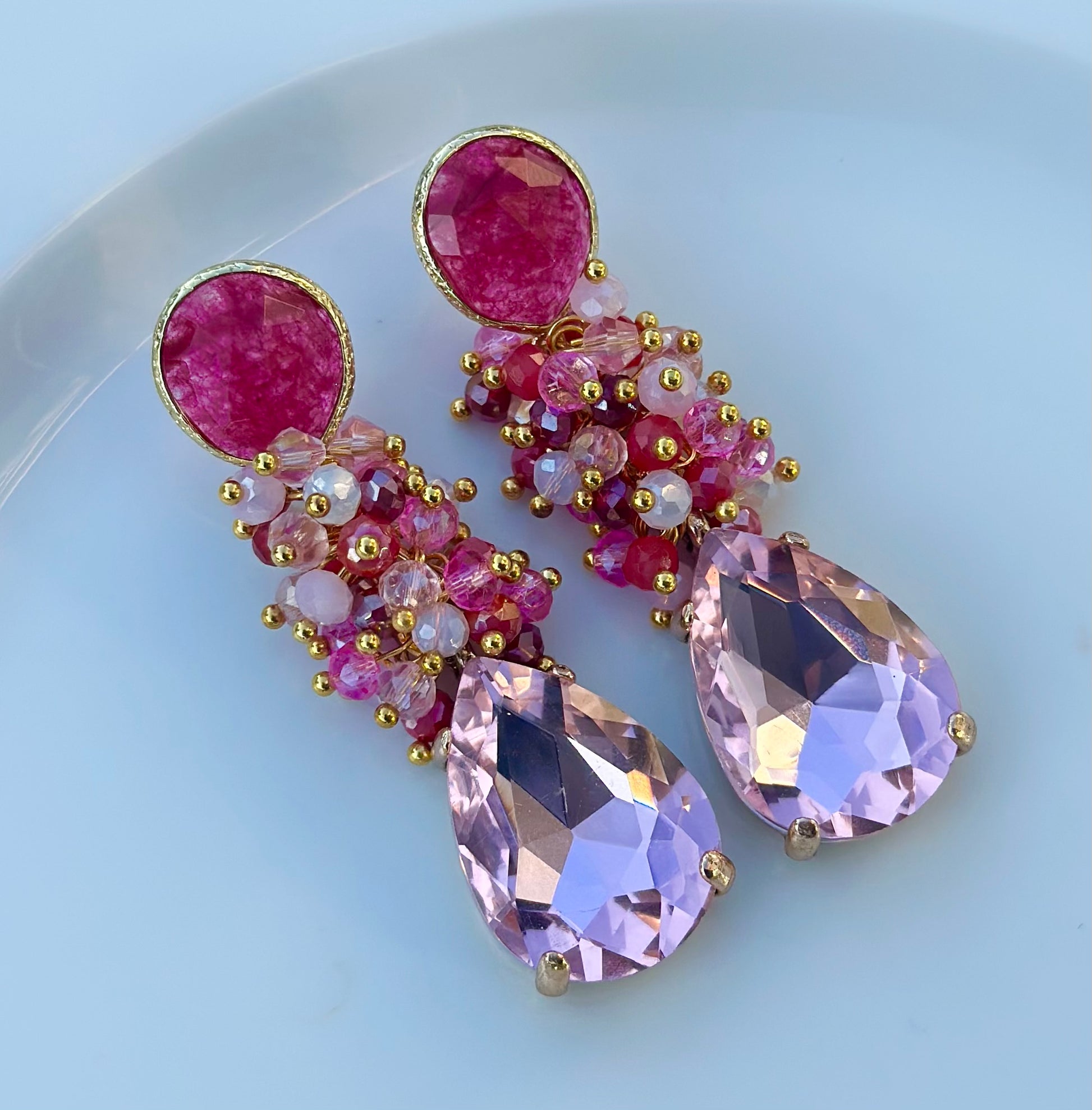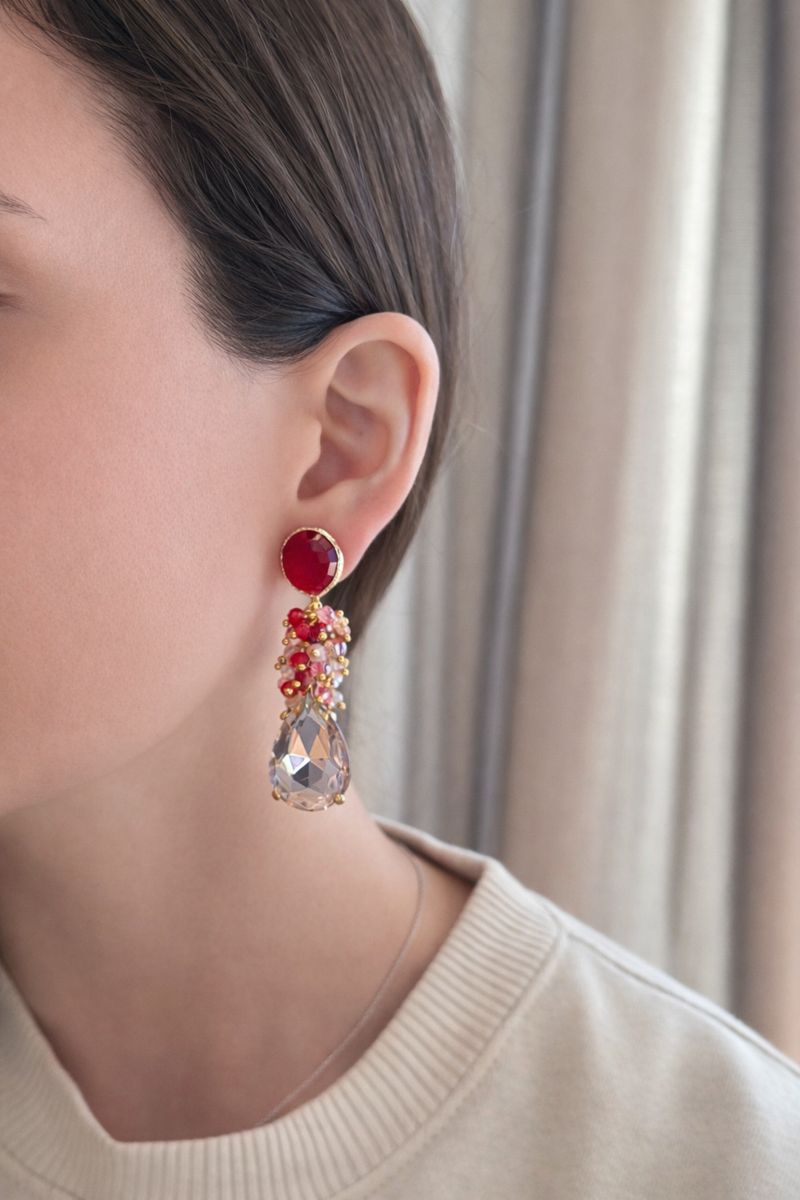 Aro con base piedra frambuesa chapada en oro, con maxi racimo de cristales facetados y cristal final rosado. Un aro único, protagonista, alegre, con el cual no pasarás desapercibida!!
