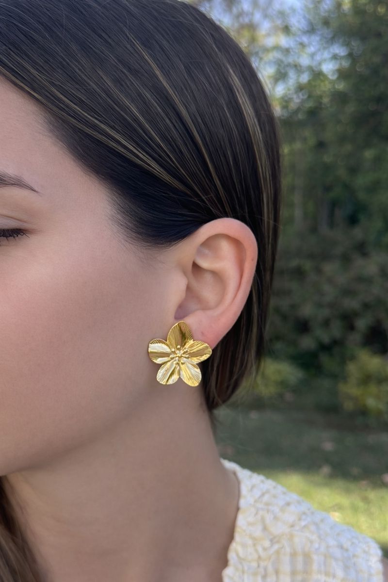 Estos aros en forma de flor, chapados en oro, destacan por su diseño texturizado y su brillo cálido, que aporta carácter y elegancia al look.