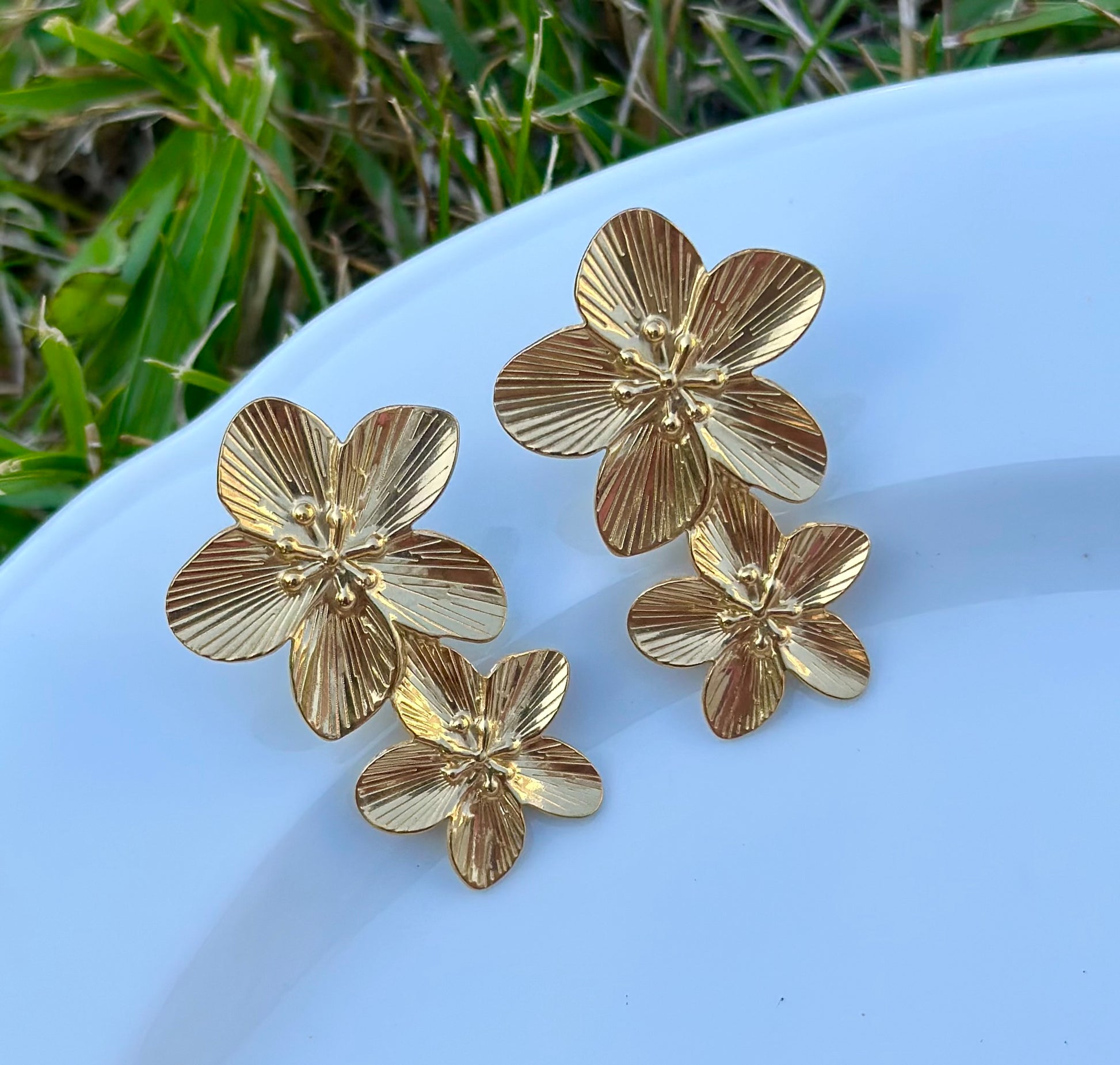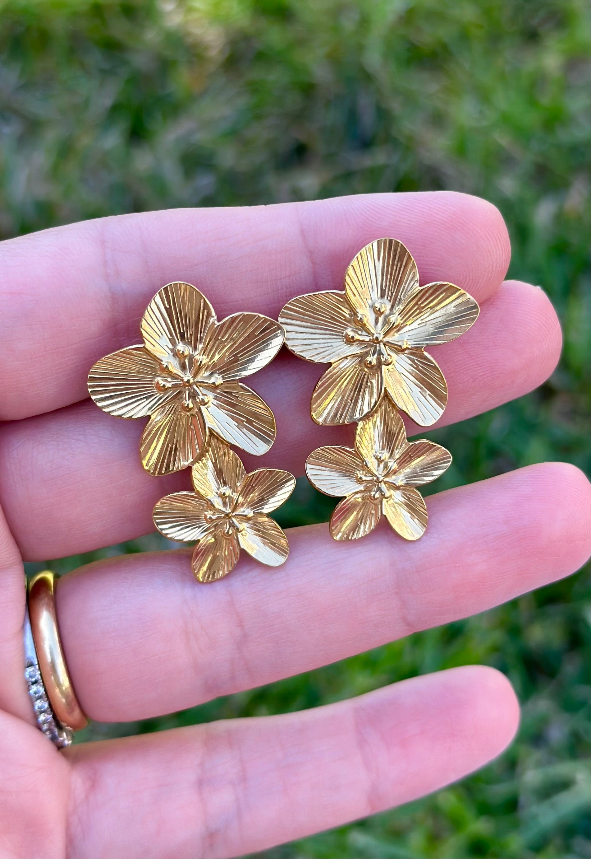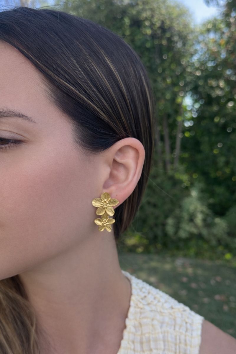 Estos aros en forma de flor doble, chapados en oro, destacan por su diseño texturizado y su brillo cálido, que aporta carácter y elegancia al look.