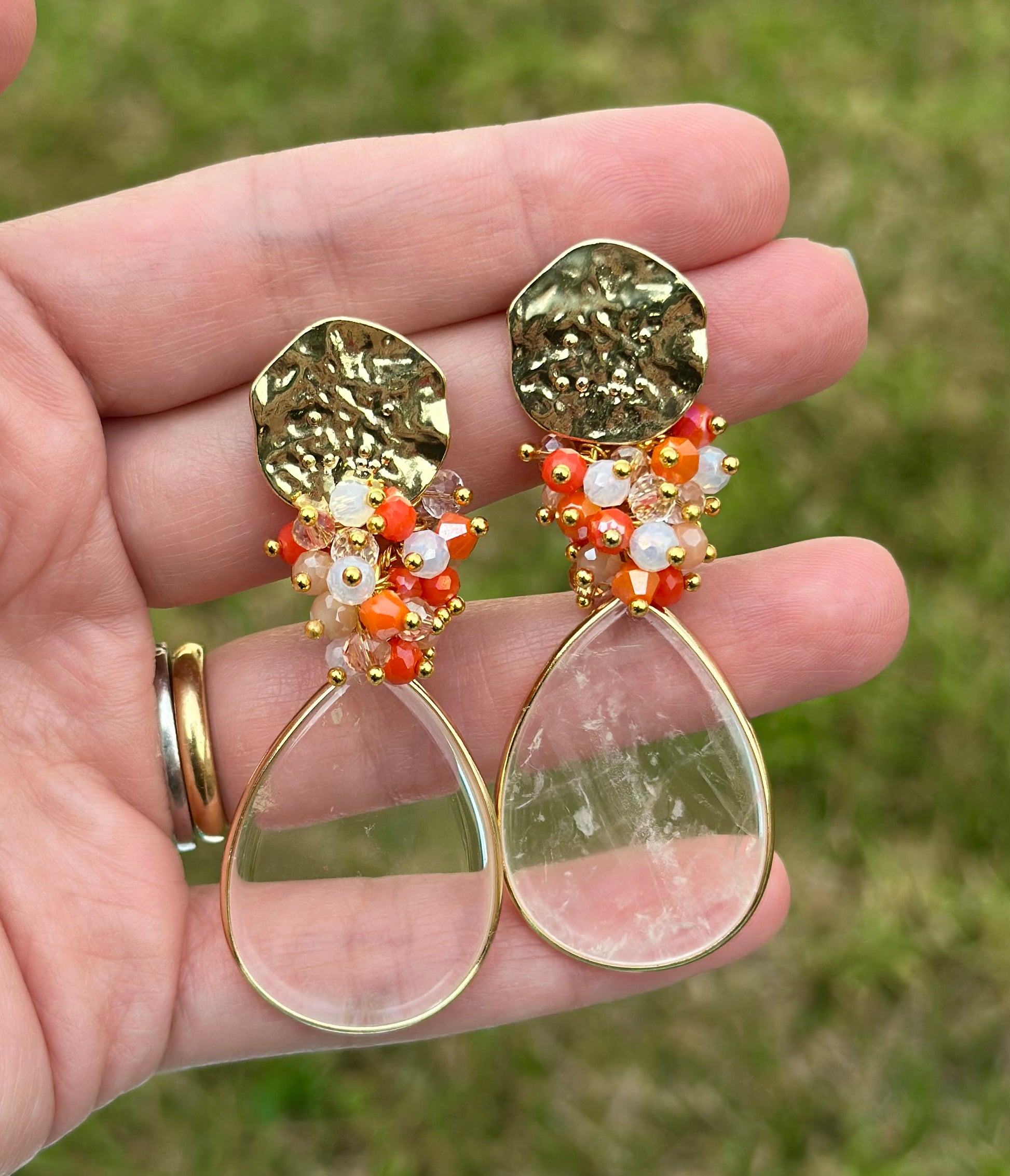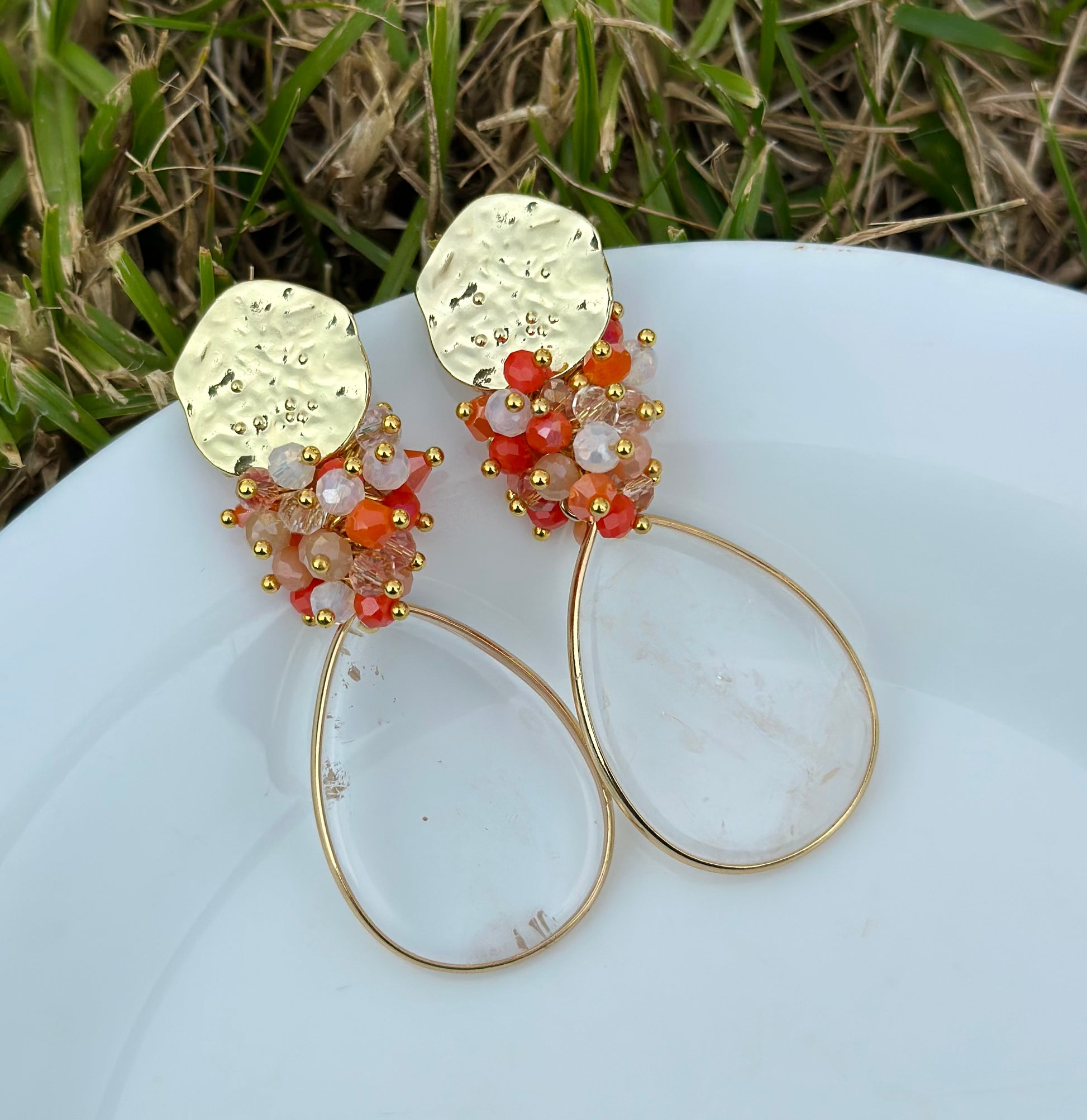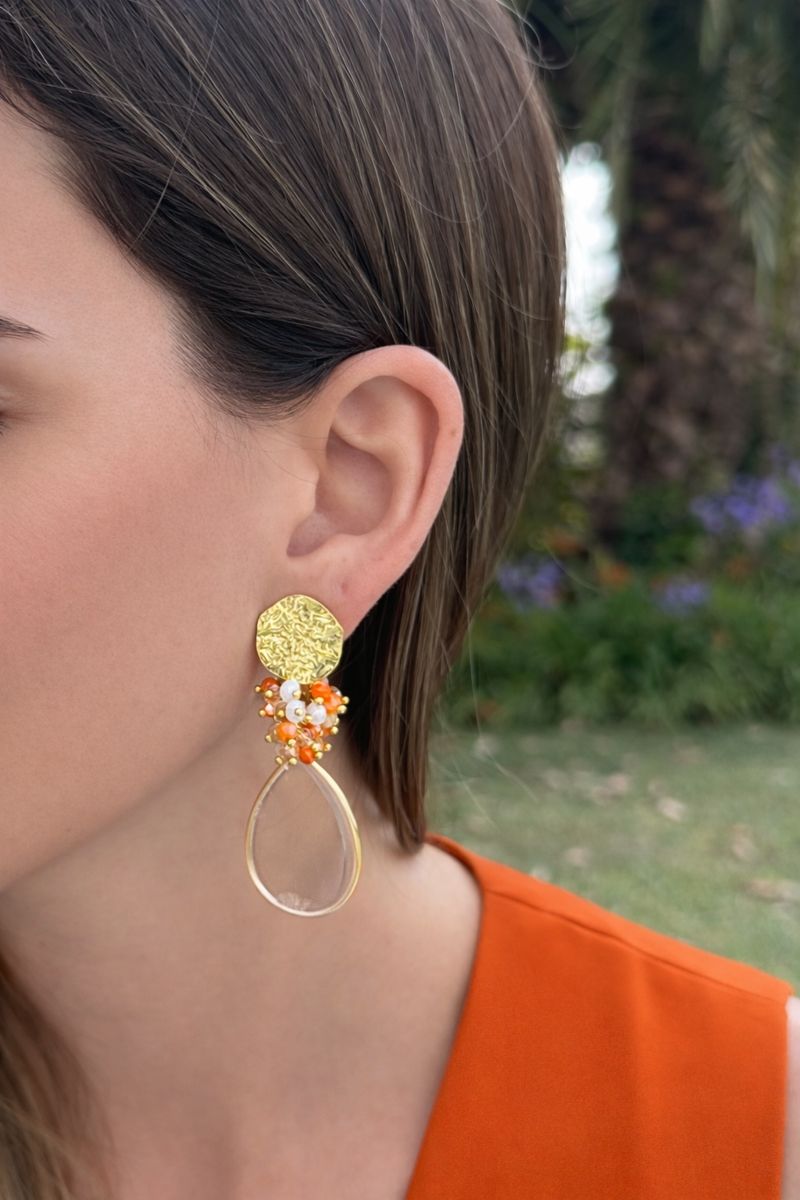 Un aro único, armónico, elegante. Colores cristalinos y naranjas, una combinación para robarse todas las miradas. Base redonda chapada en oro y piedra final cristal blanco.