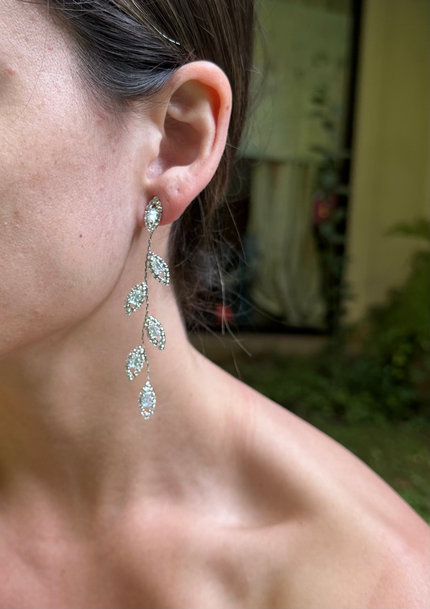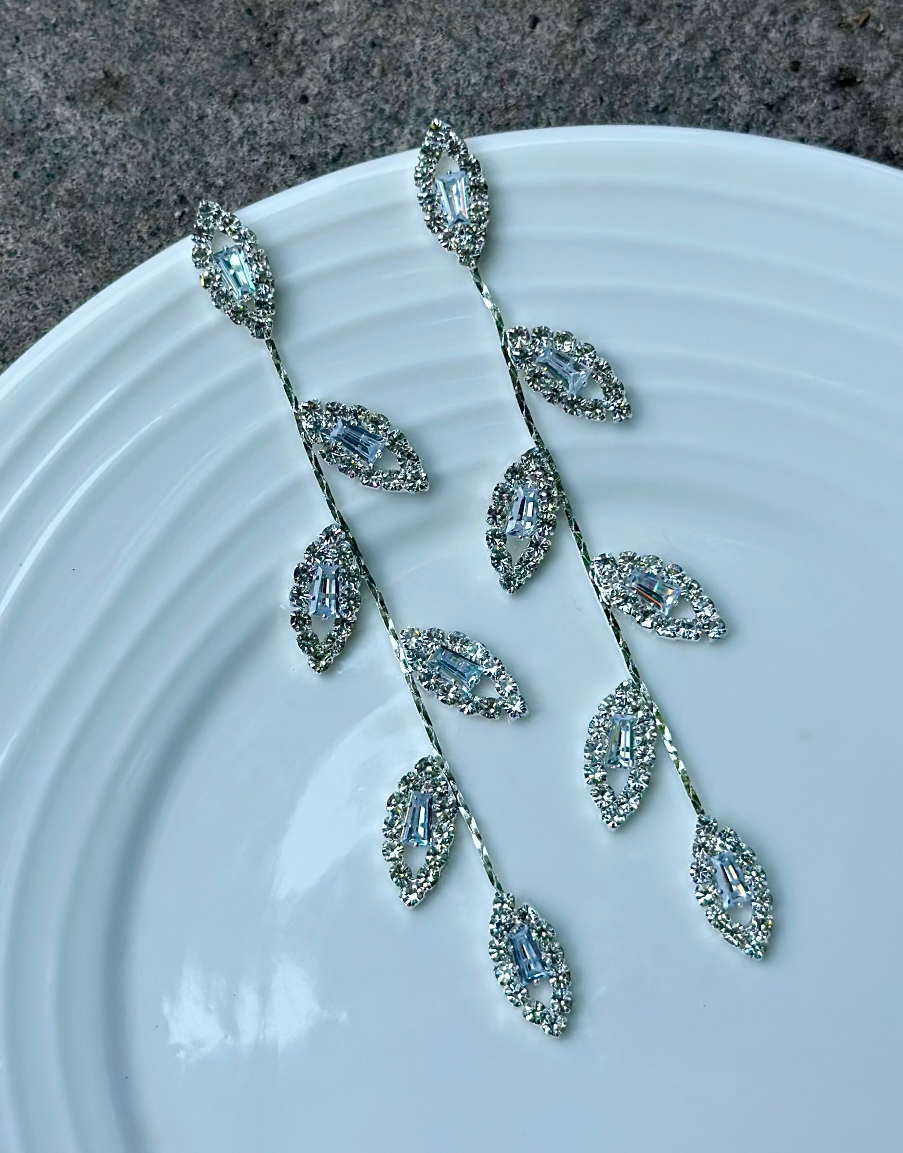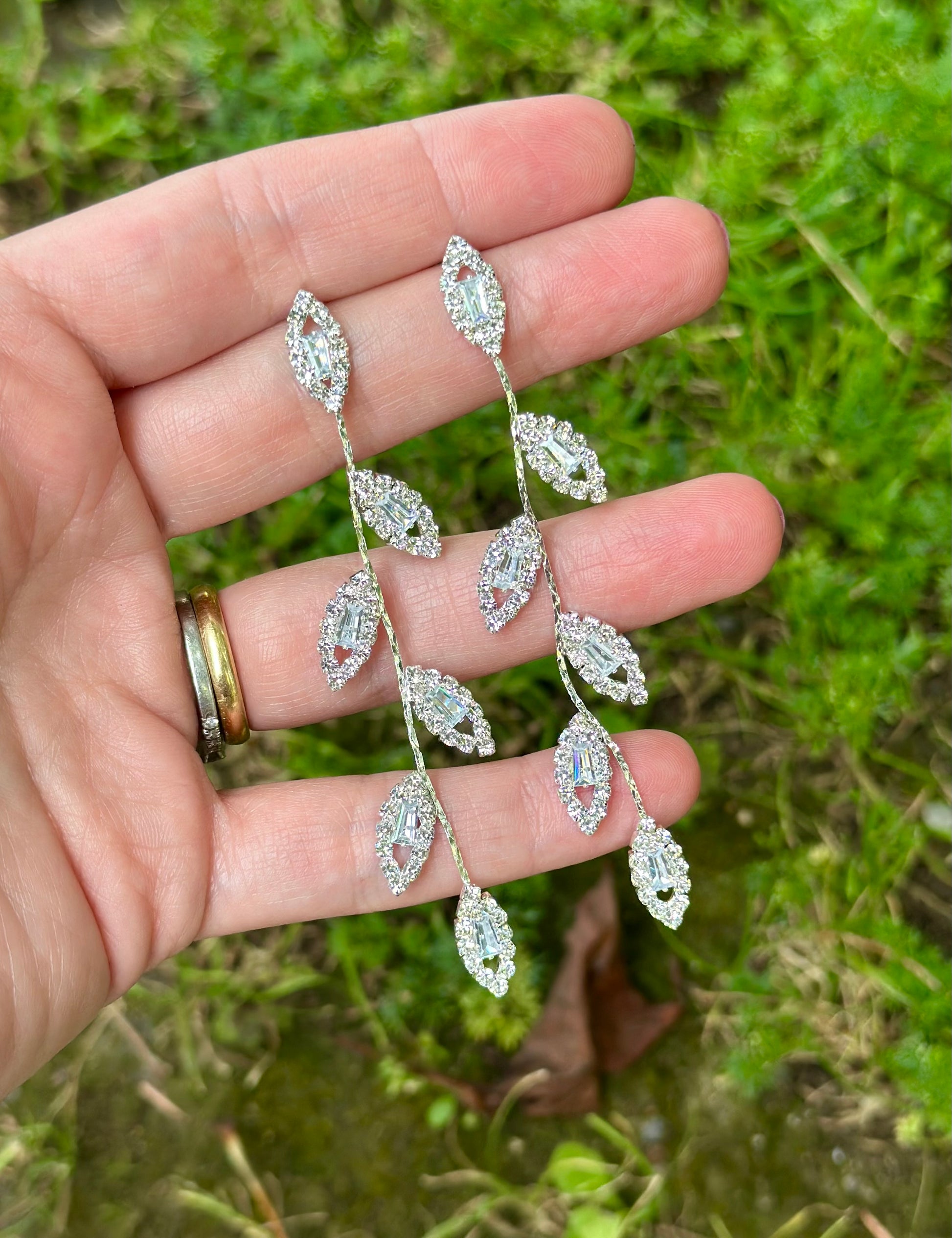 Aros colgantes de diseño delicado y sofisticado, compuestos por una fina cadena flexible adornada con piezas en forma de hoja, engastadas con circonias cúbicas de alto brillo. Su caída liviana y movimiento sutil aportan luz y elegancia al rostro, convirtiéndolos en el complemento perfecto para ocasiones especiales o looks más formales. Disponibles en dorado y plateado. Enchape plata 925.
