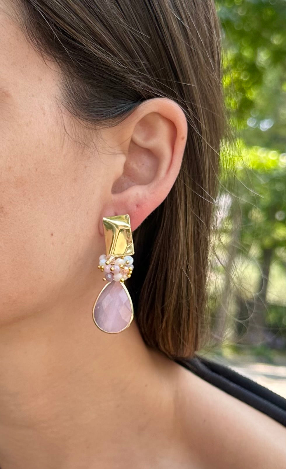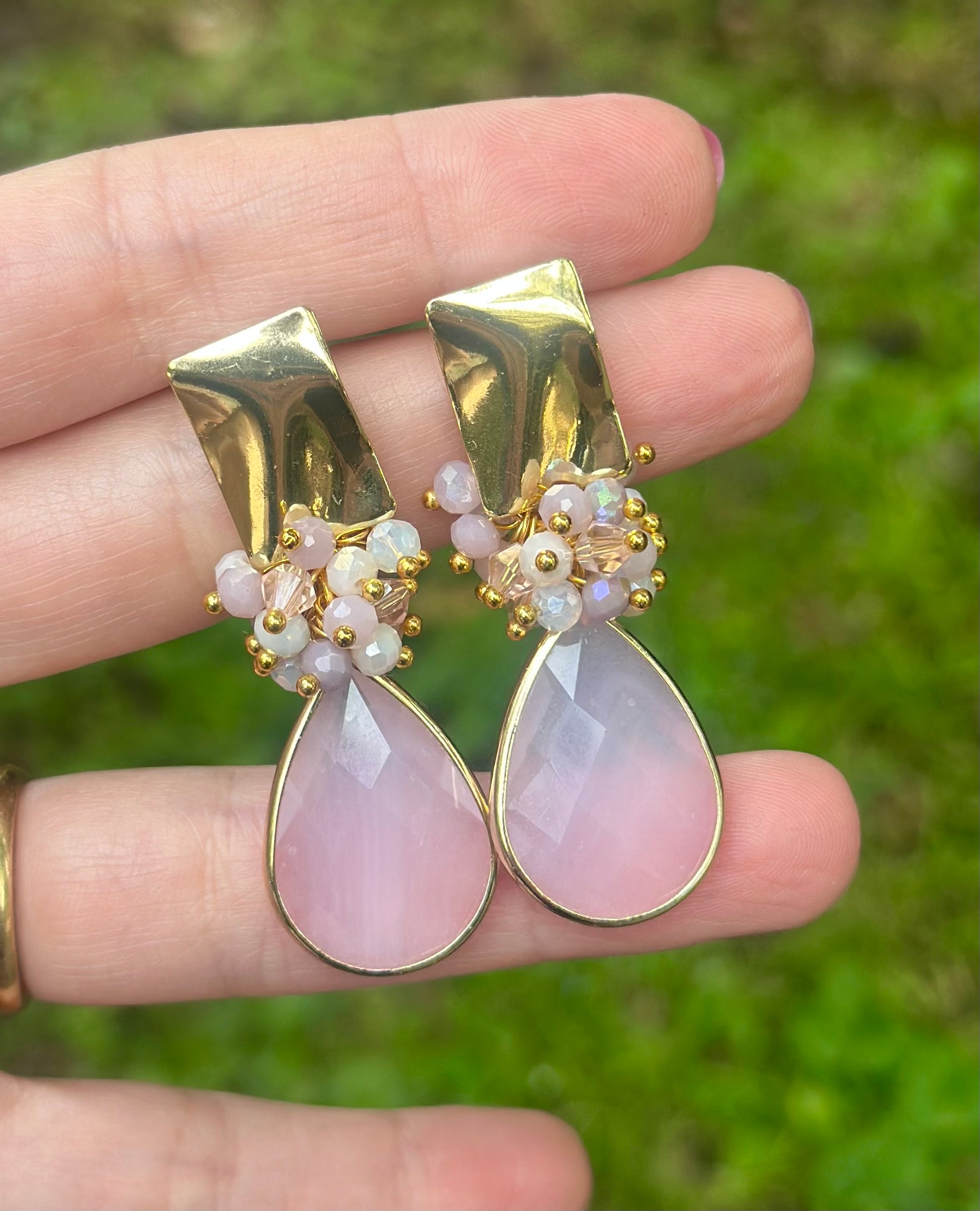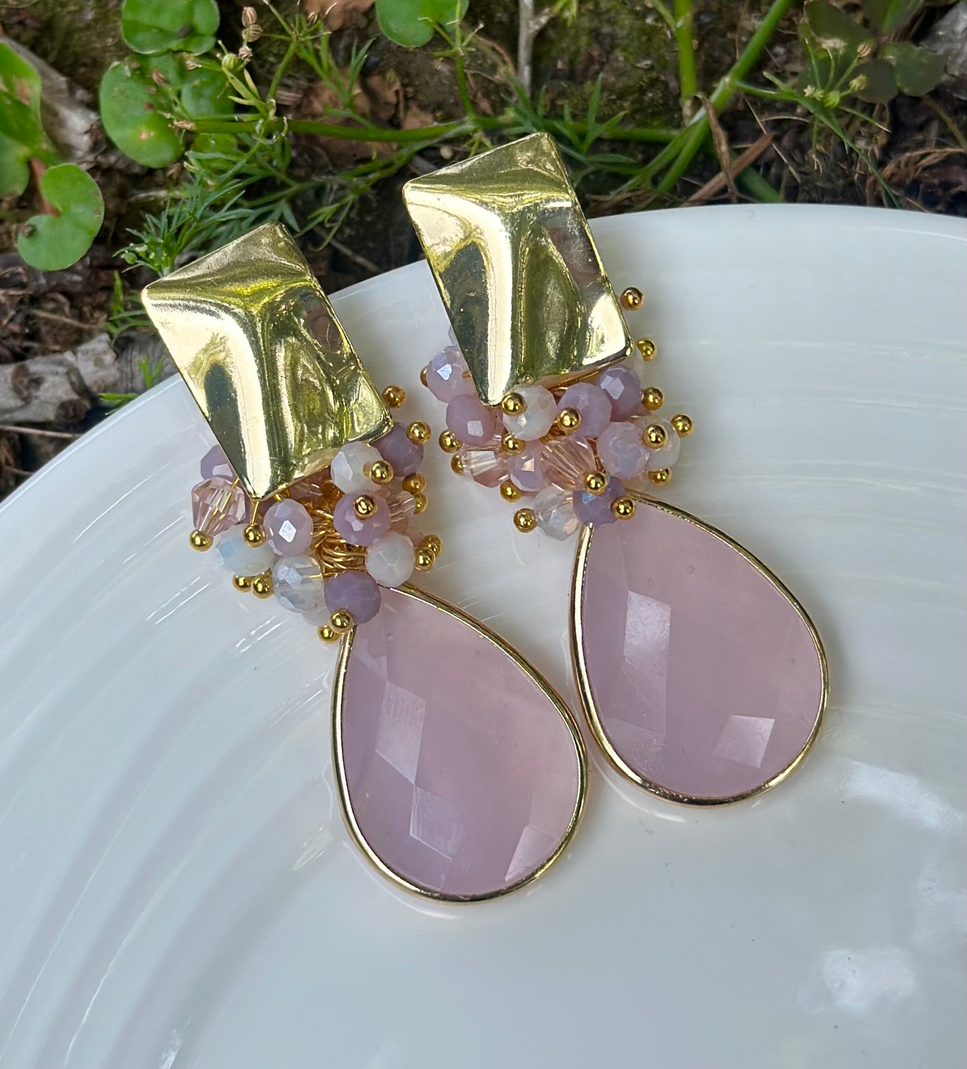 Maravillosos aros delicados en tonos rosados. Base rectangular dorada, racimo de cristales facetados, cristal final rosado chapado en oro.