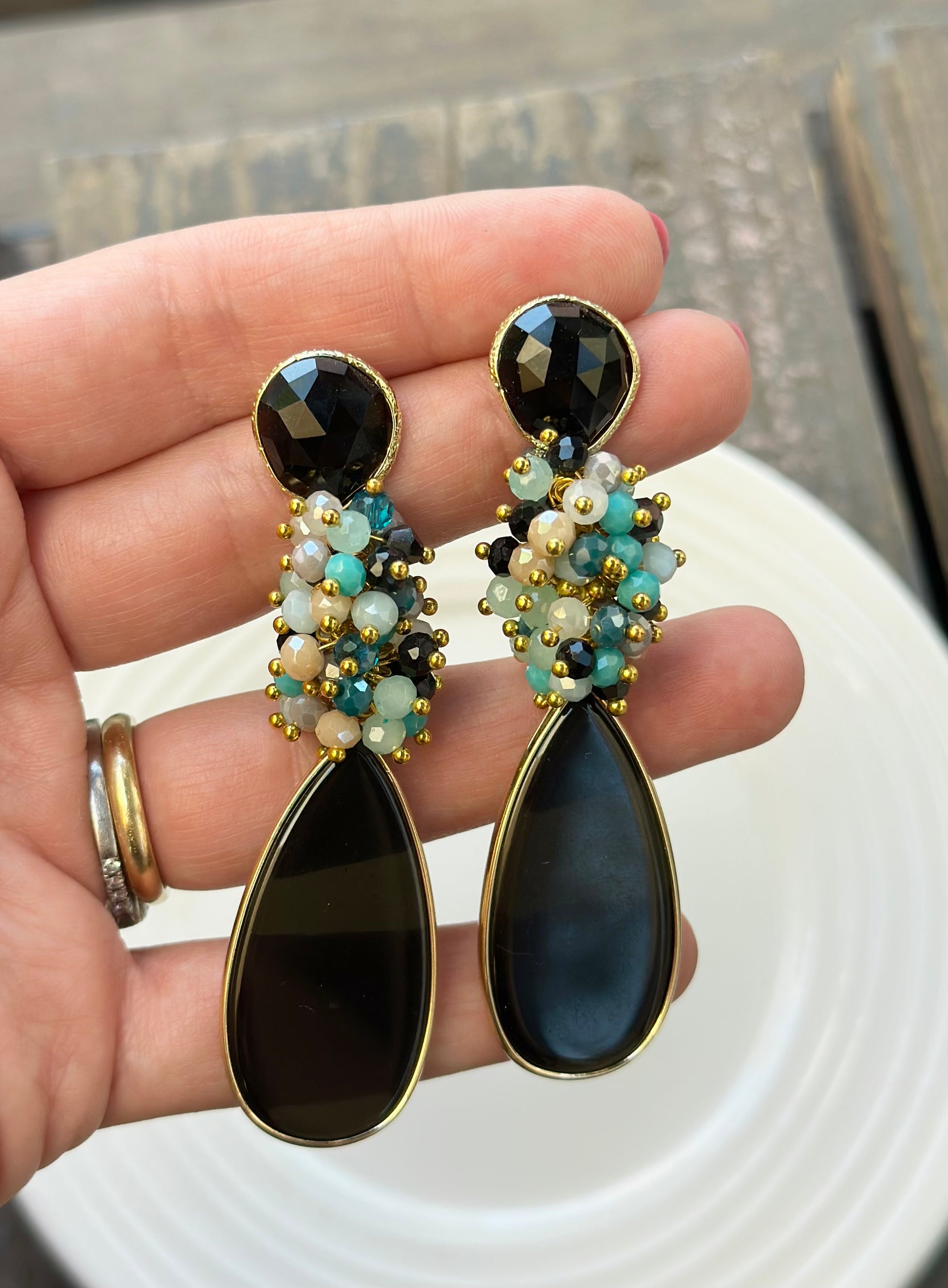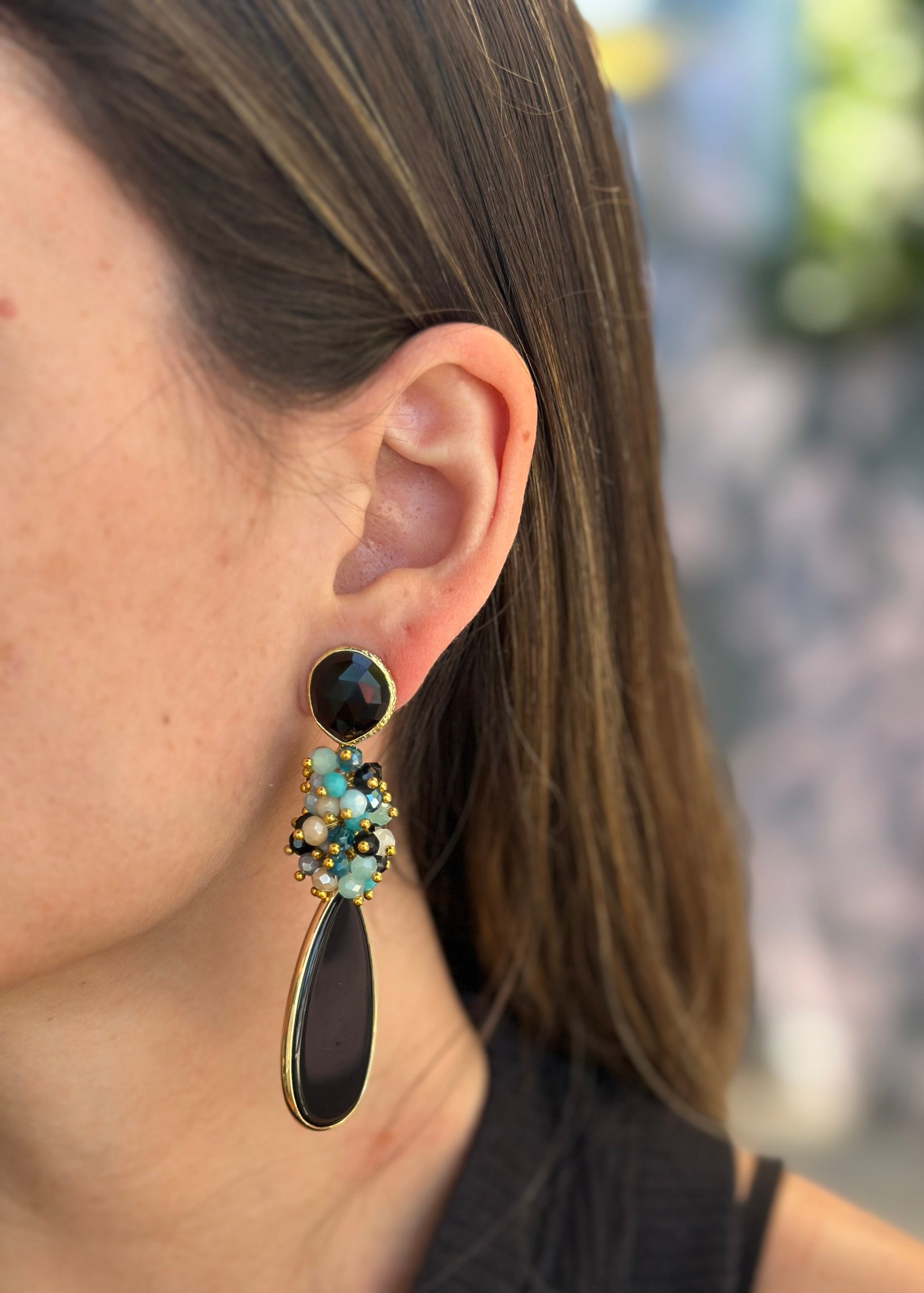 Un aro maravilloso y protagonista. Chapado en oro en su totalidad, base de ónix, racimo de cristales facetados y piedra final ágata negra.