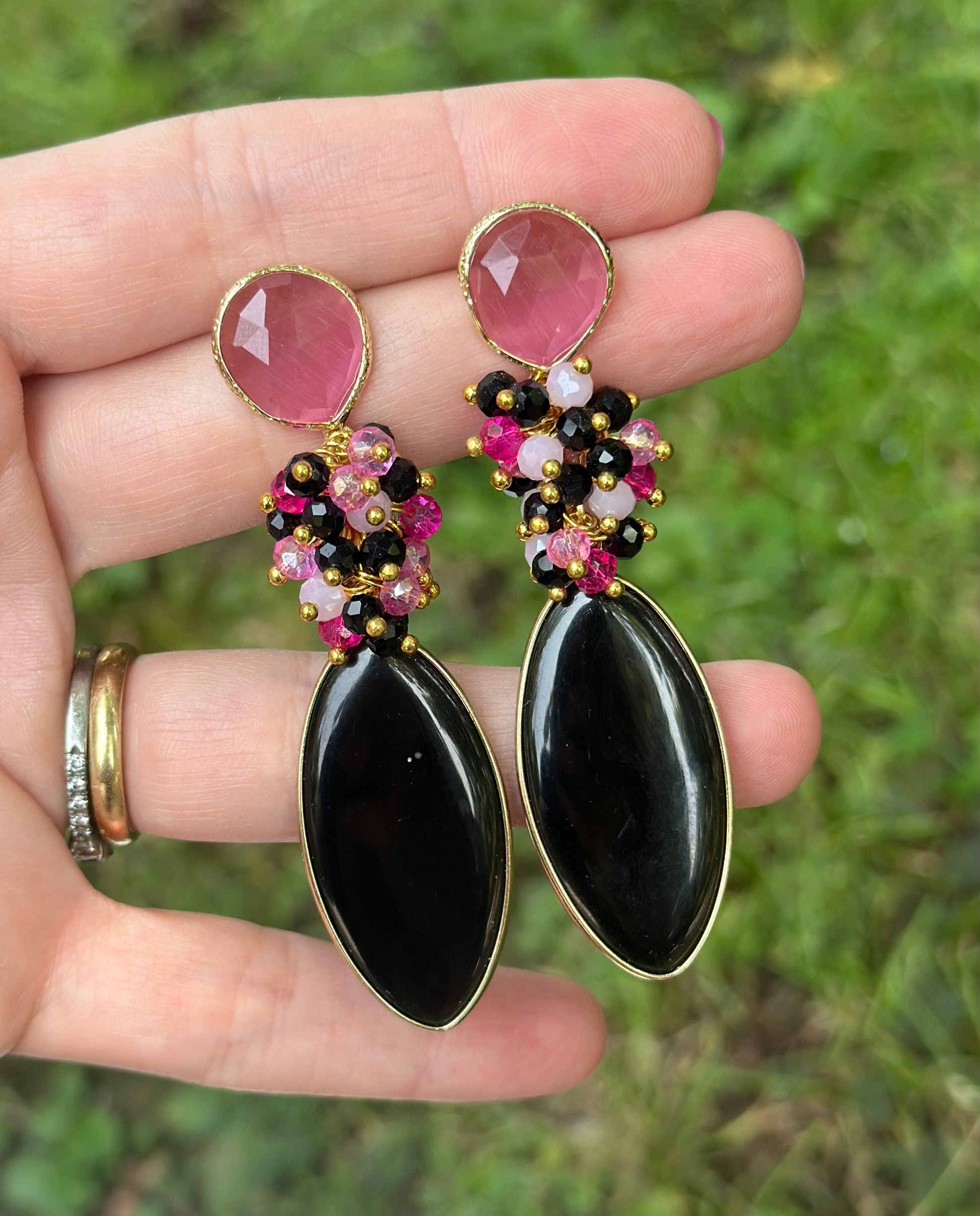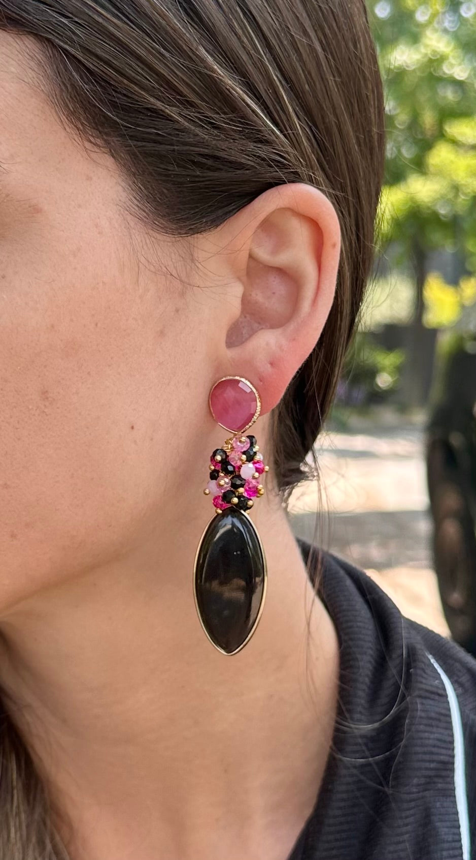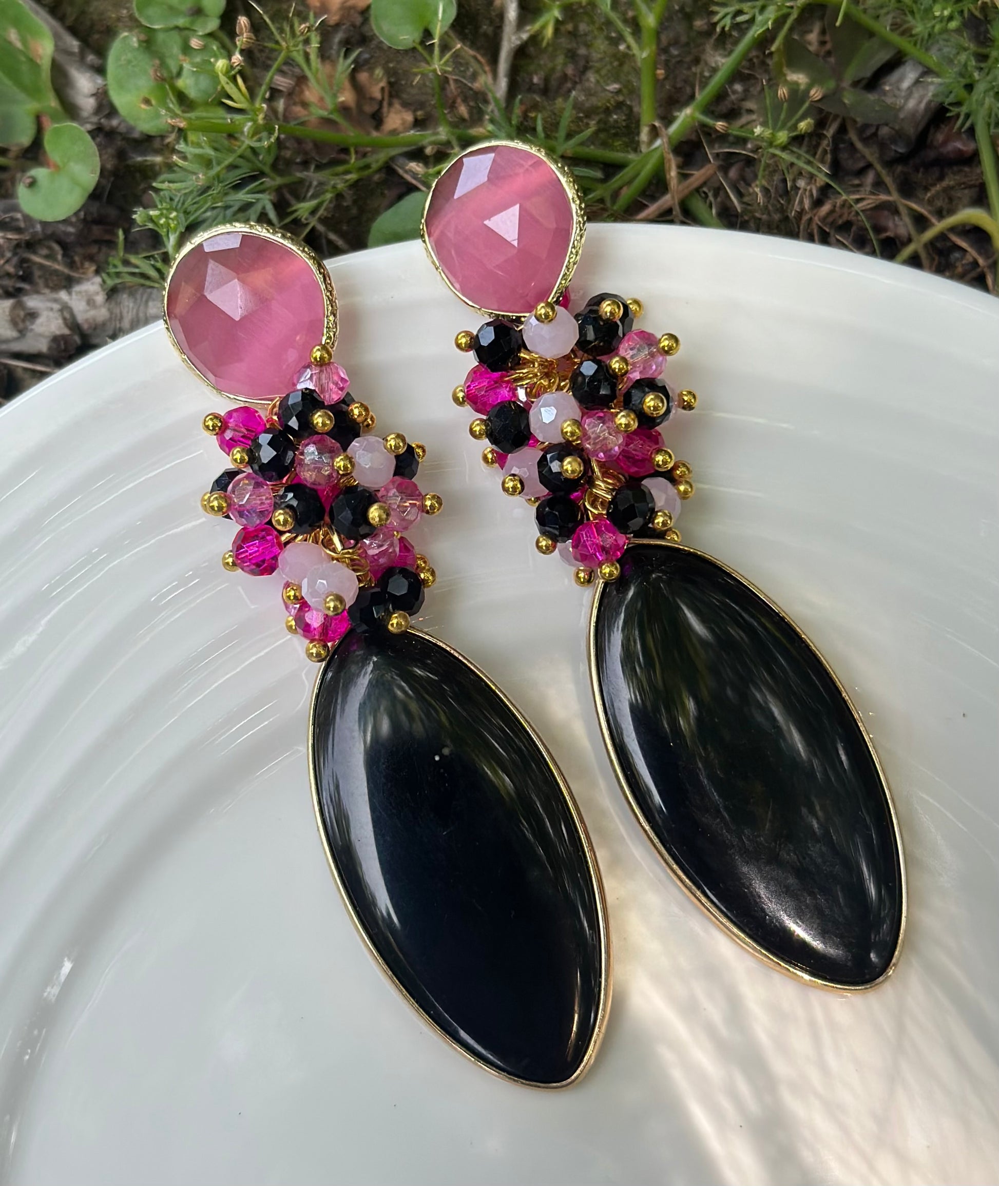 Un aro maravilloso y protagonista. Chapado en oro en su totalidad, base de ojo gato rosado, racimo de cristales facetados y piedra final ágata negra.
