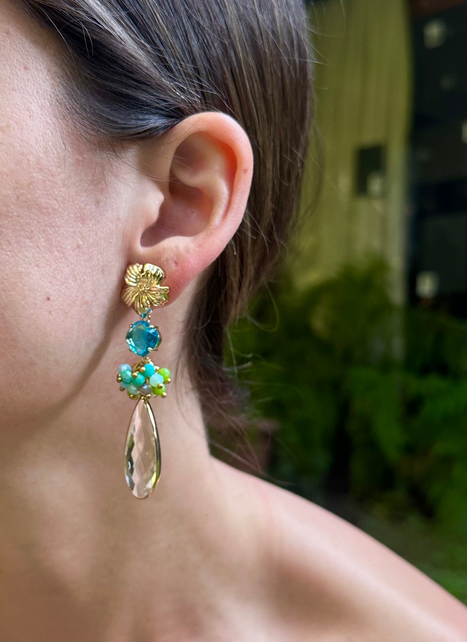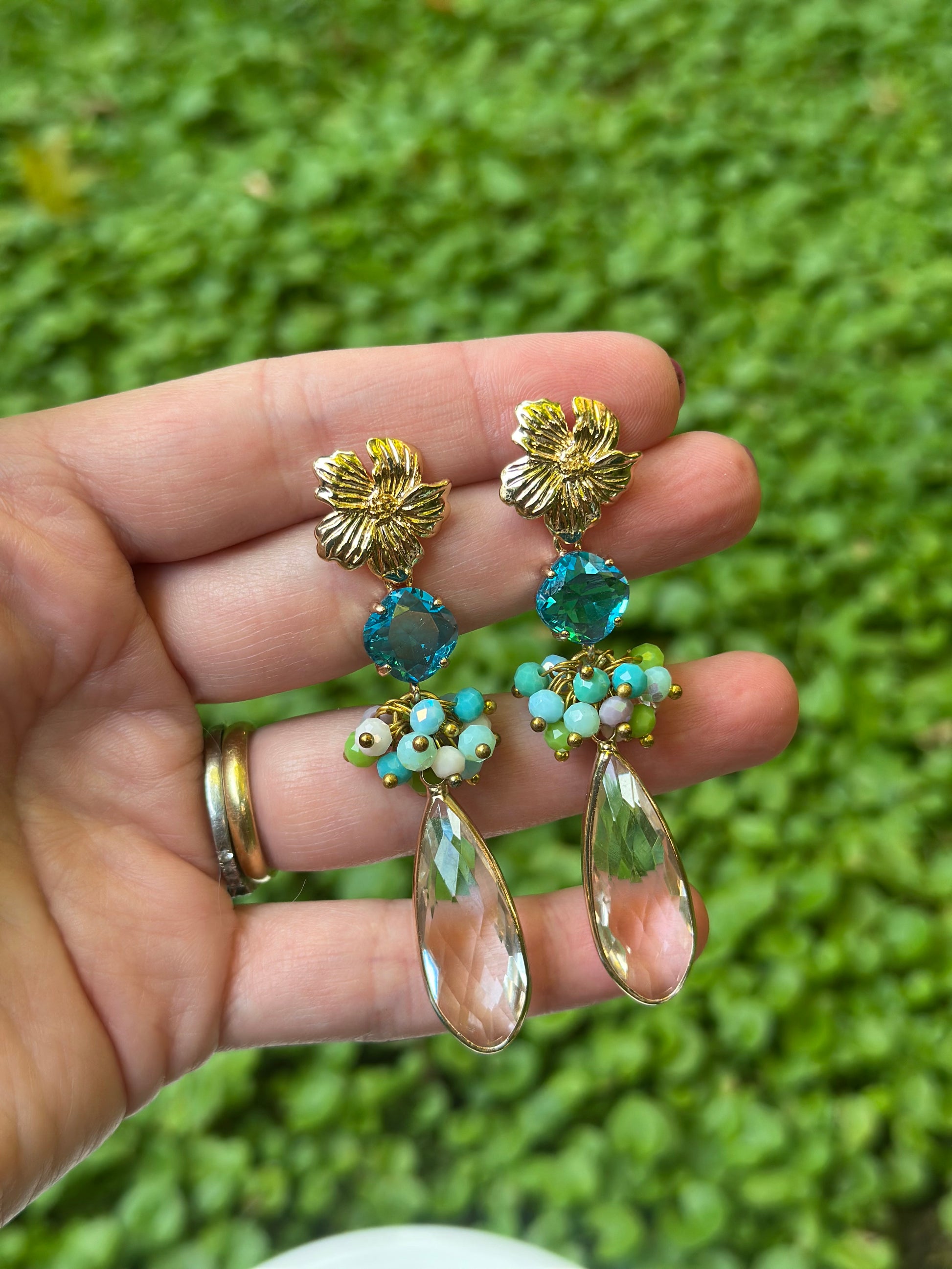 Maravillosos aros que contrastan colores agua. Delicados, elegantes y versátiles. Base de flor chapada en oro y cristales facetados, con un cristal final color transparente en forma de gota. Chapados en oro.