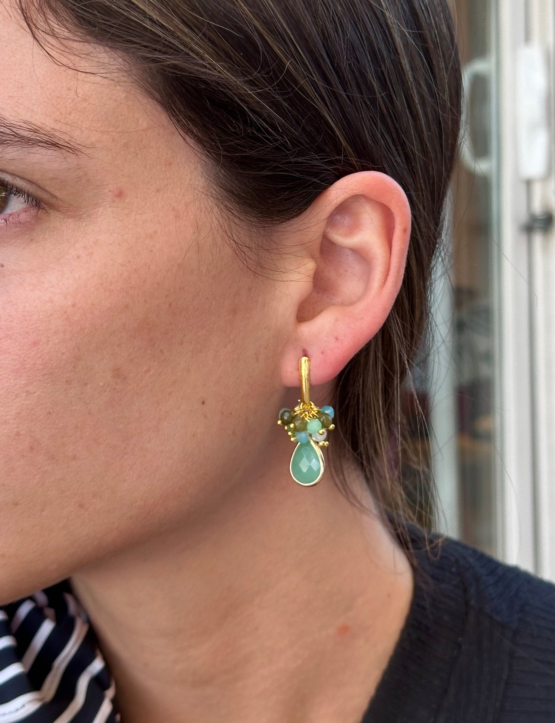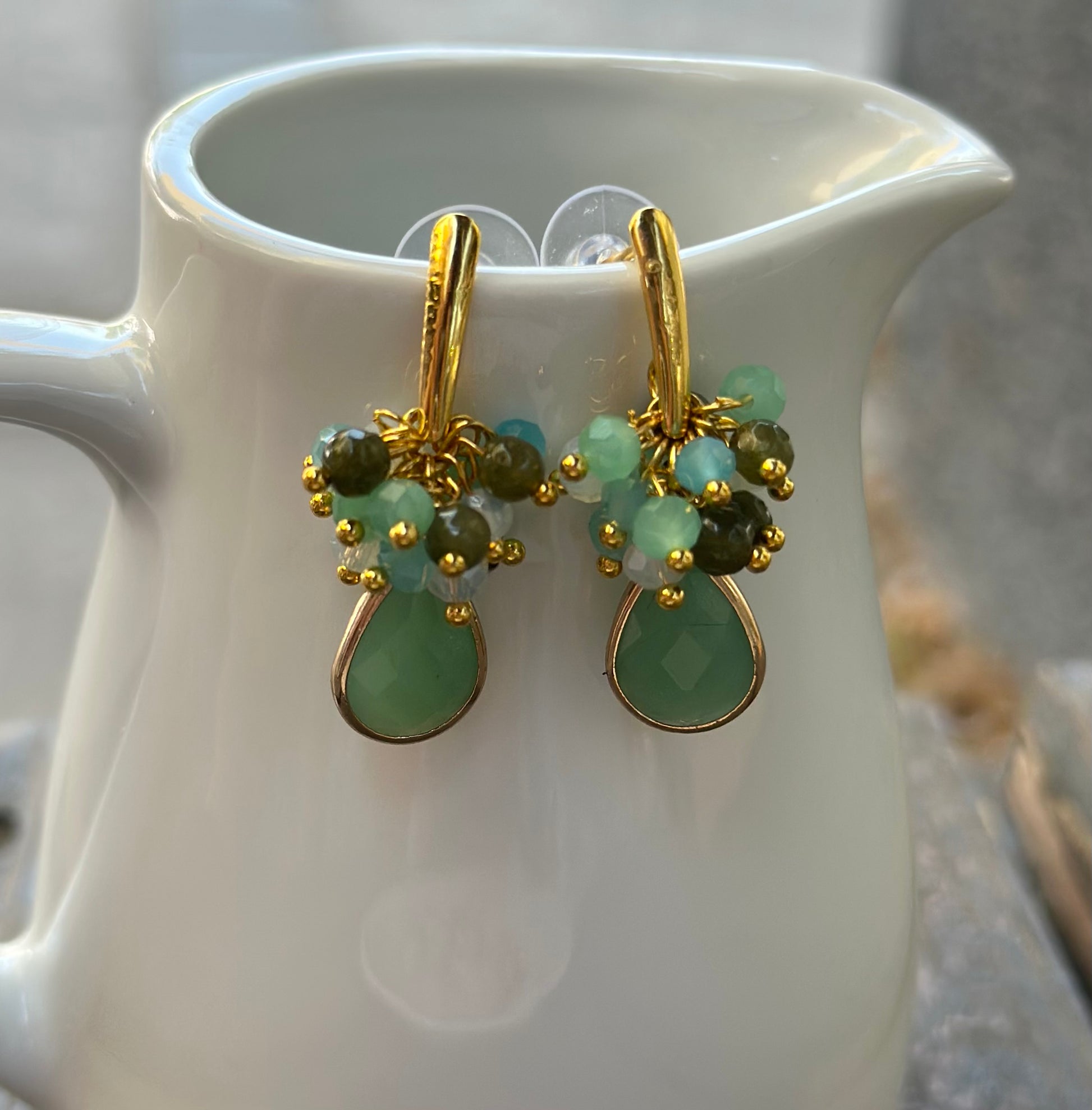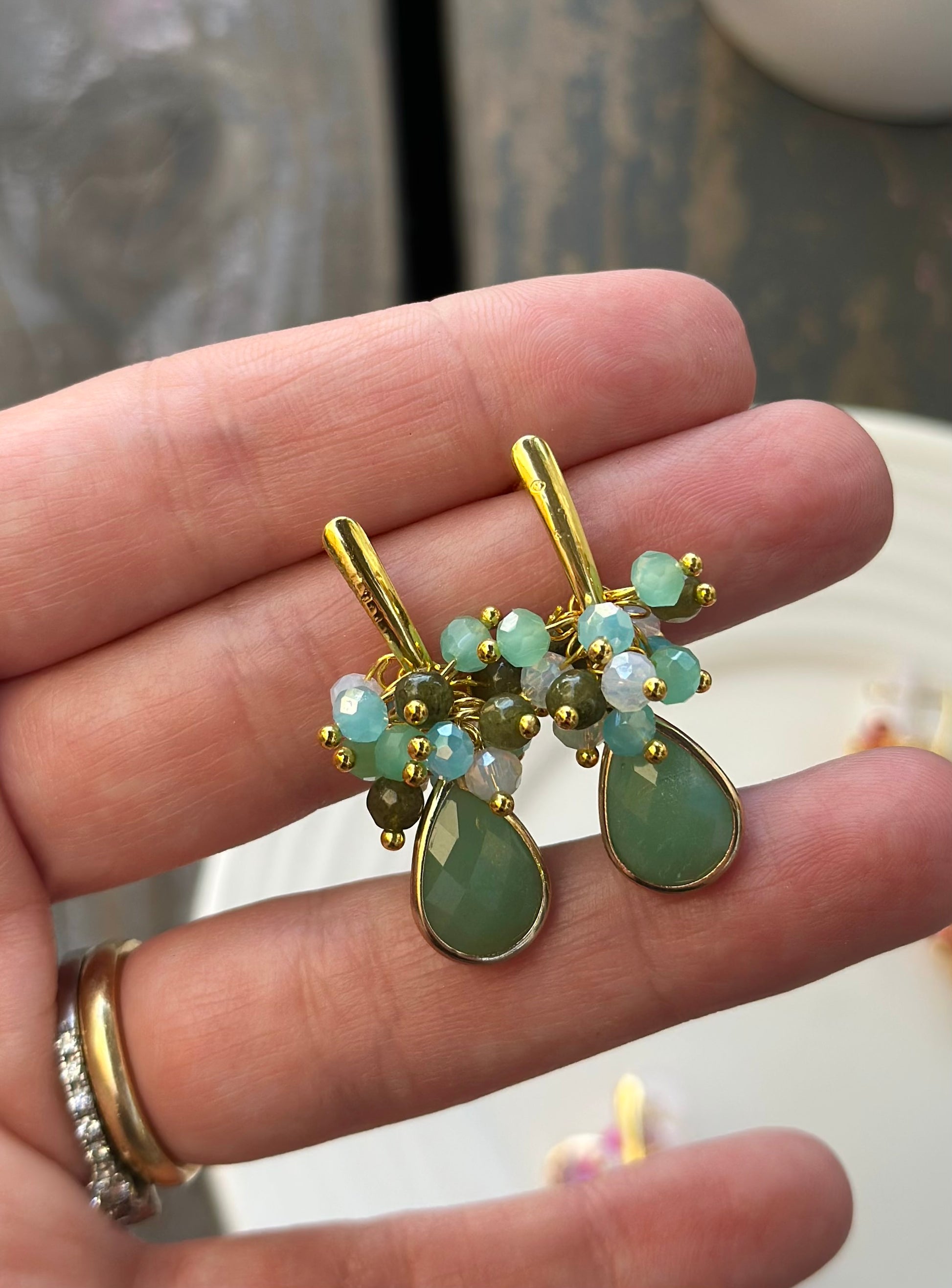 Aros delicados de cristales facetados montados en base dorada chapada en oro. Piedra final jade verde.