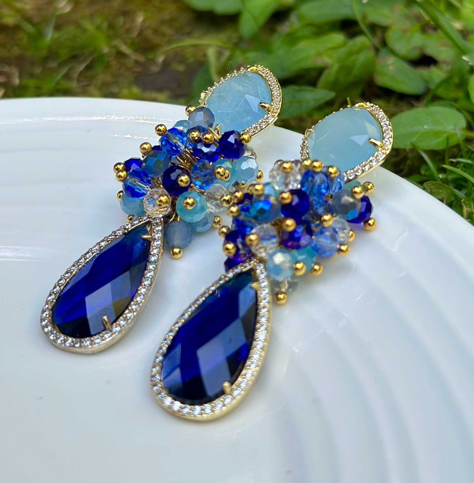 Aro con base de cuarzo celeste chapada en oro, rodeado de circones, racimo de cristales facetados y cristal final azul intenso, chapado en oro rodeado de circones.