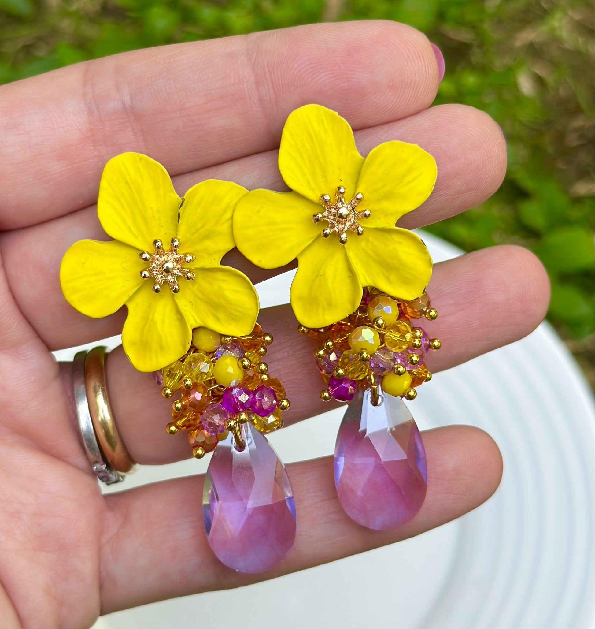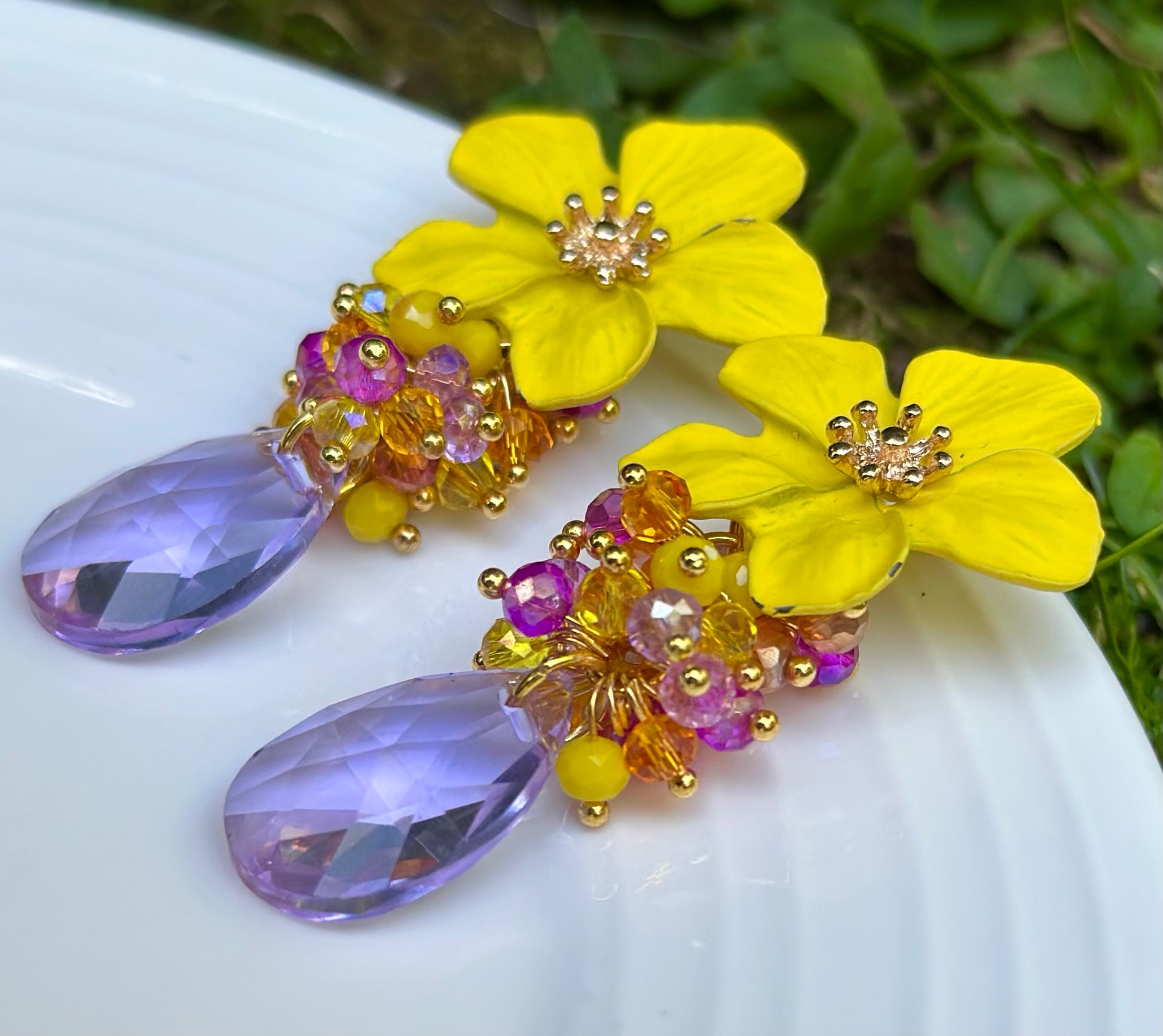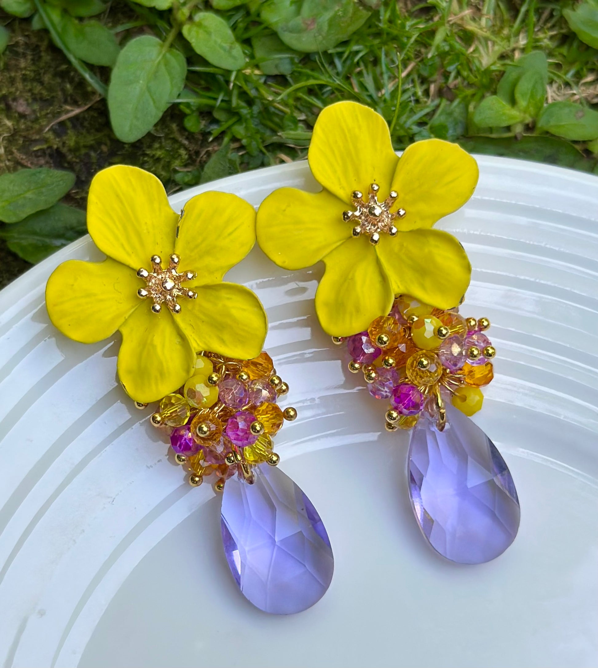 Un aro maravilloso y alegre, ideal para levantar cualquier look! Base de flor acrílica, racimo de cristales facetados y gota final de cristal lila.