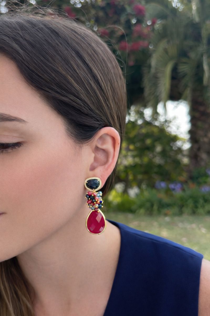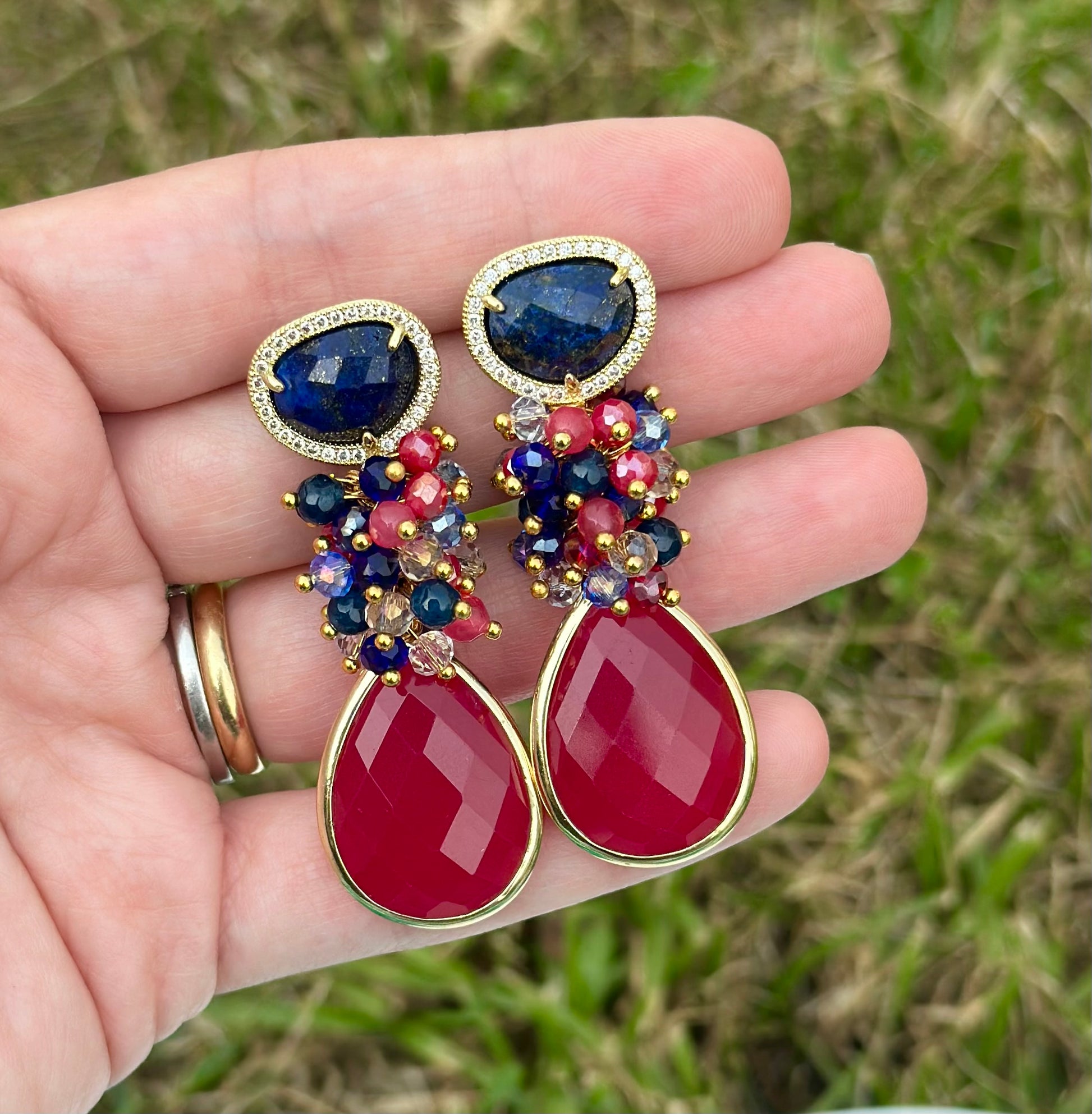 Un aro único e intenso. Azul, rojo, frambuesa, una combinación para robarse todas las miradas. Base piedra lapis y piedra final jade rojo, ambas chapadas en oro y racimo de cristales facetados.