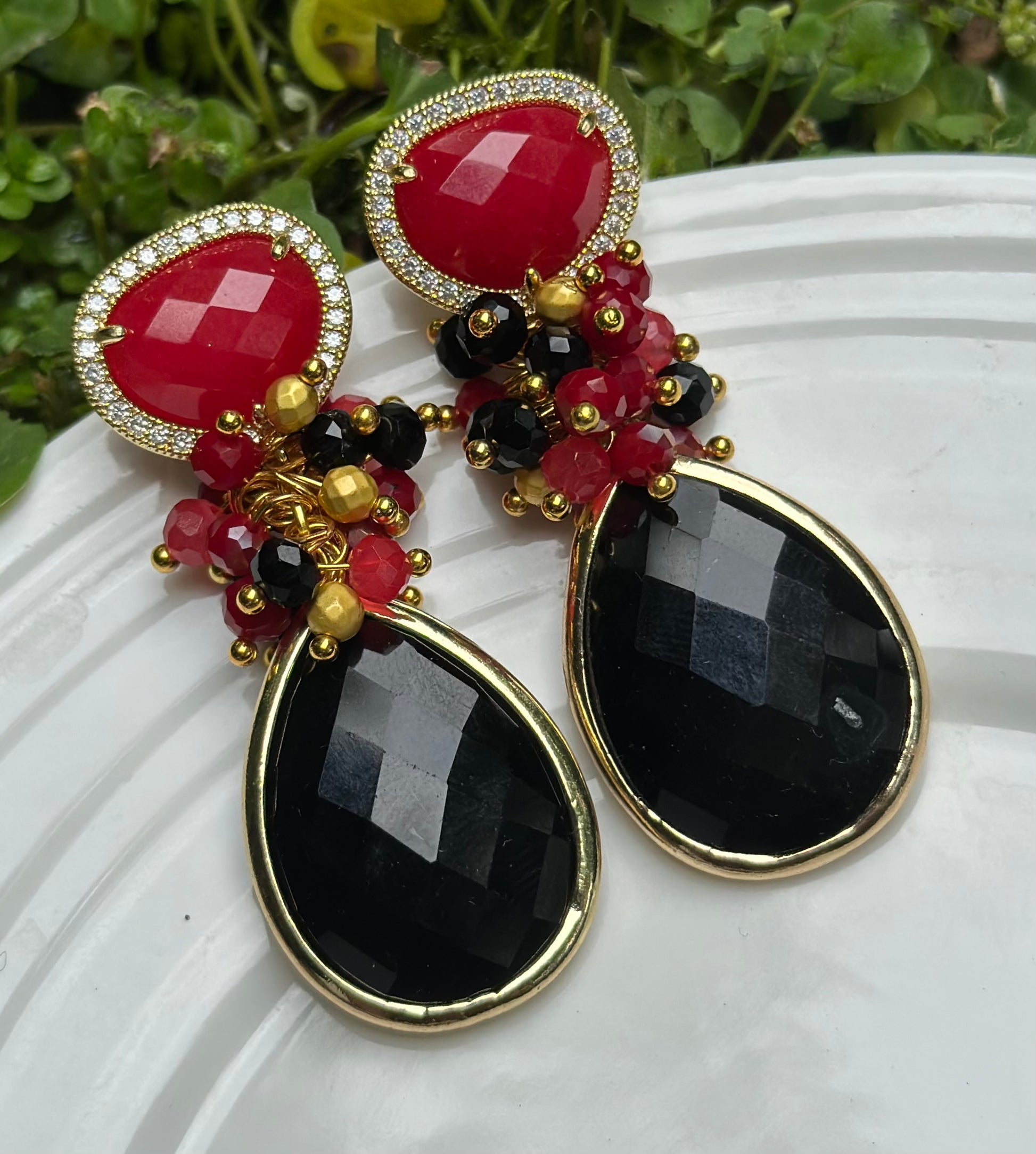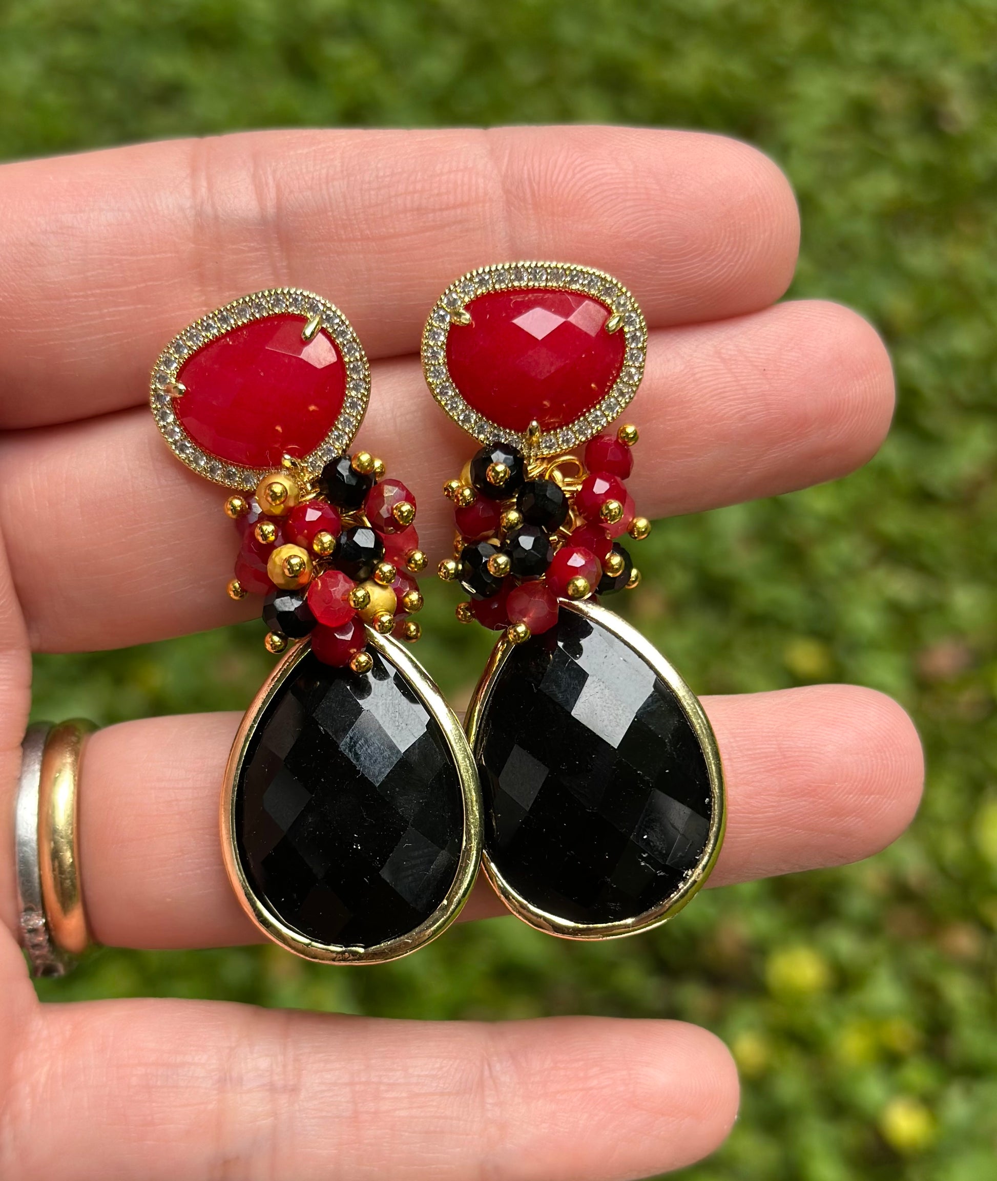 Base jade roja chapada en oro y rodeada de circones, racimo de cristales fascetados y piedra final en ágata negra. Un aro que contrasta con personalidad e intensidad, pero sin perder la elegancia.