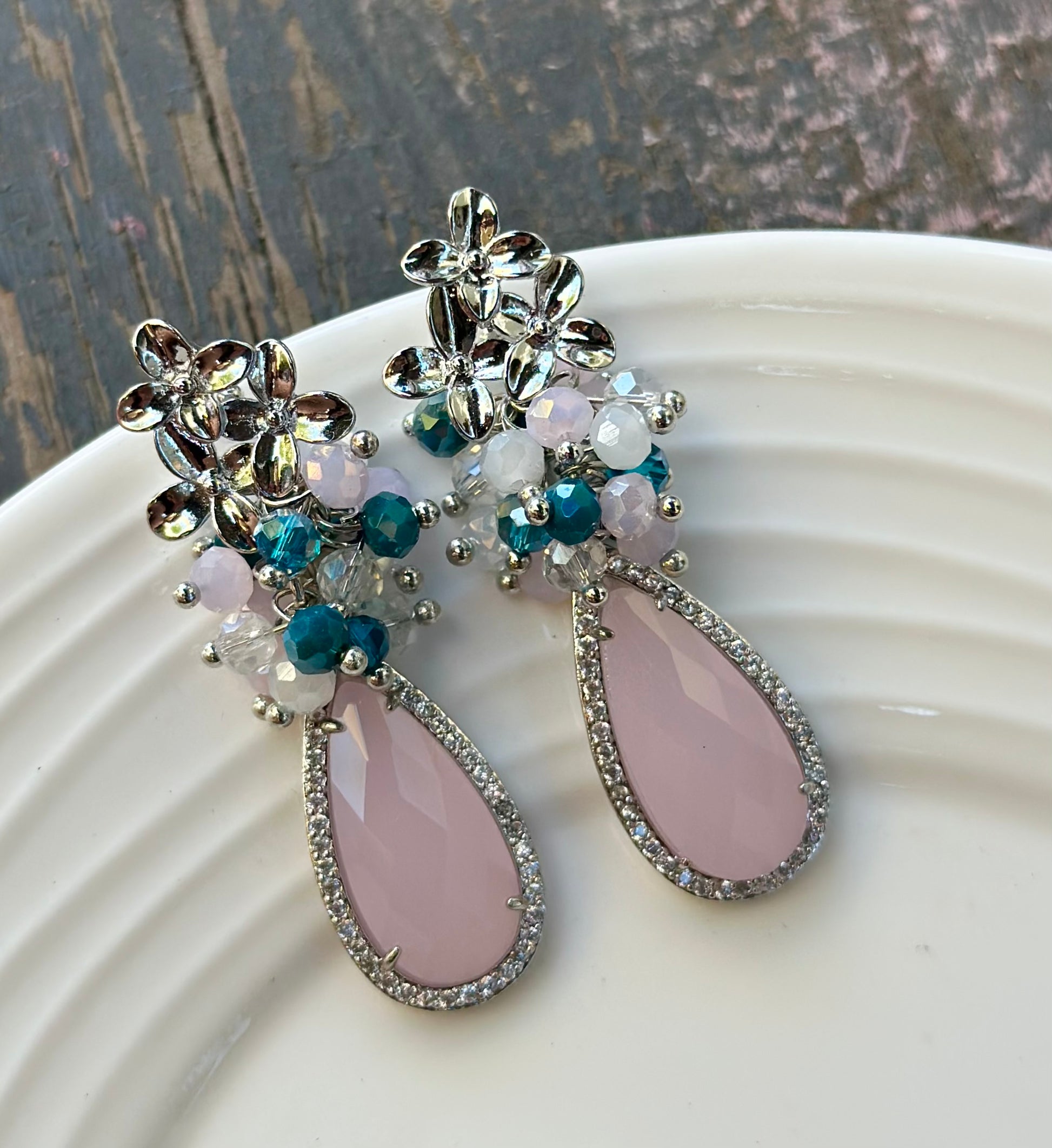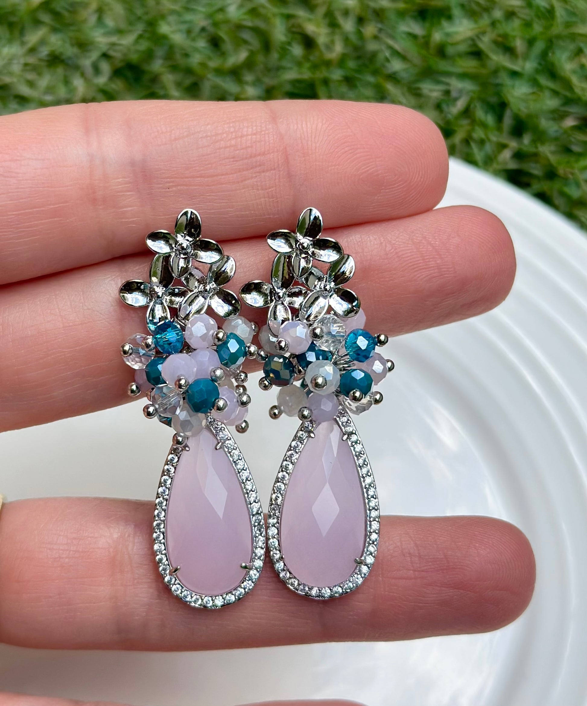 Aros delicados de cristales facetados montados en base de triple flor plateada, chapada en plata. Piedra final chapada en plata rodeada de circones.