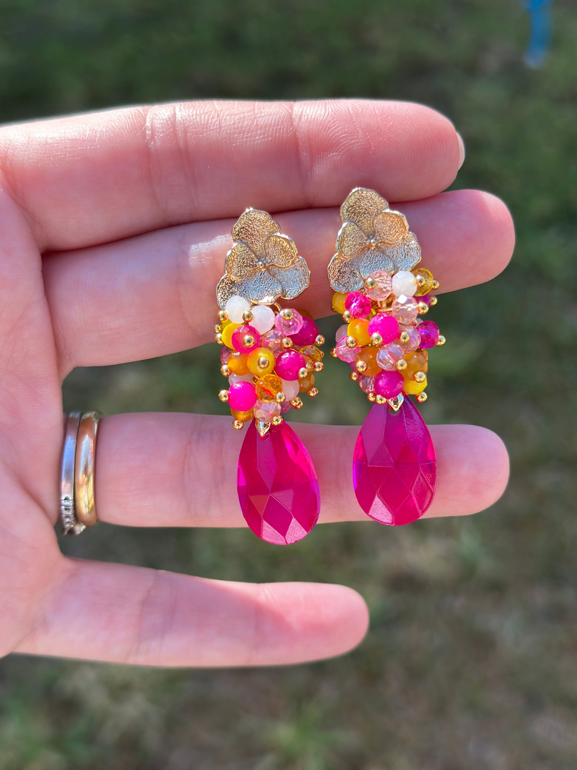 Aros con base chapada en oro, racimo de cristales y ágatas facetados en tonalidades fucsia/rosa/amarillo, cristal final fucsia en forma de gota. Clásicos, elegantes y armónicos.