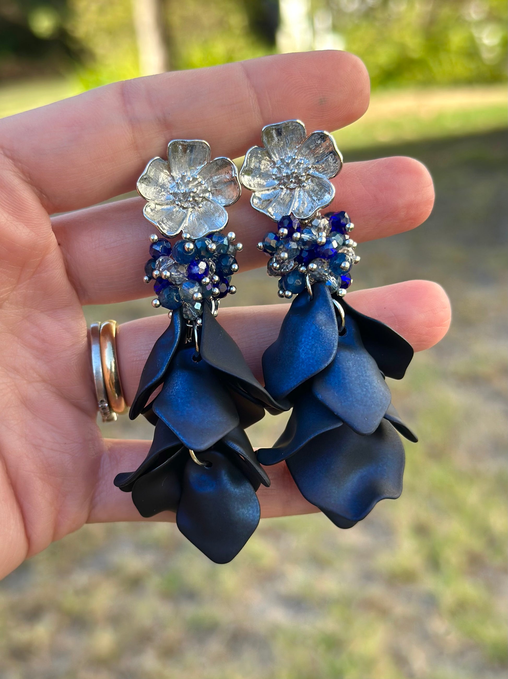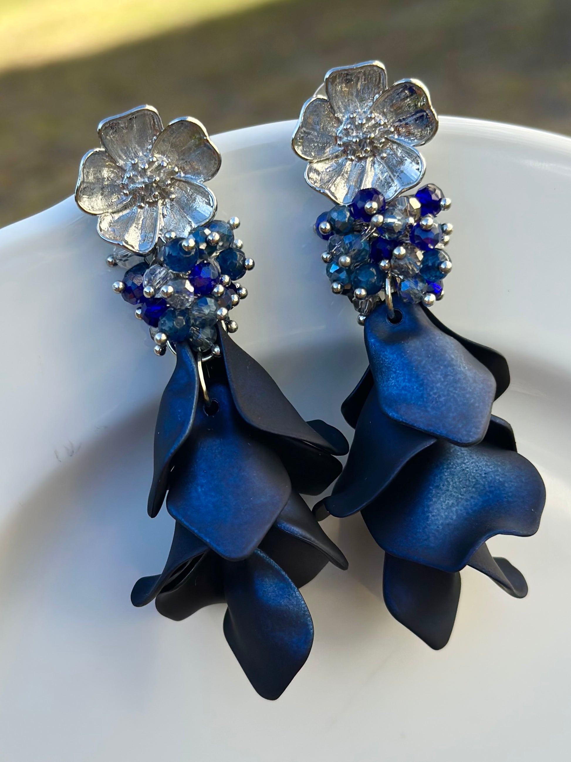 Maxi aros de pétalos azul marino, con flor chapada en plata y un racimo de cristales facetados. Con una caída femenina y elegante, estos aros no pasarán desapercibidos. Lo mejor? Son muy livianos!