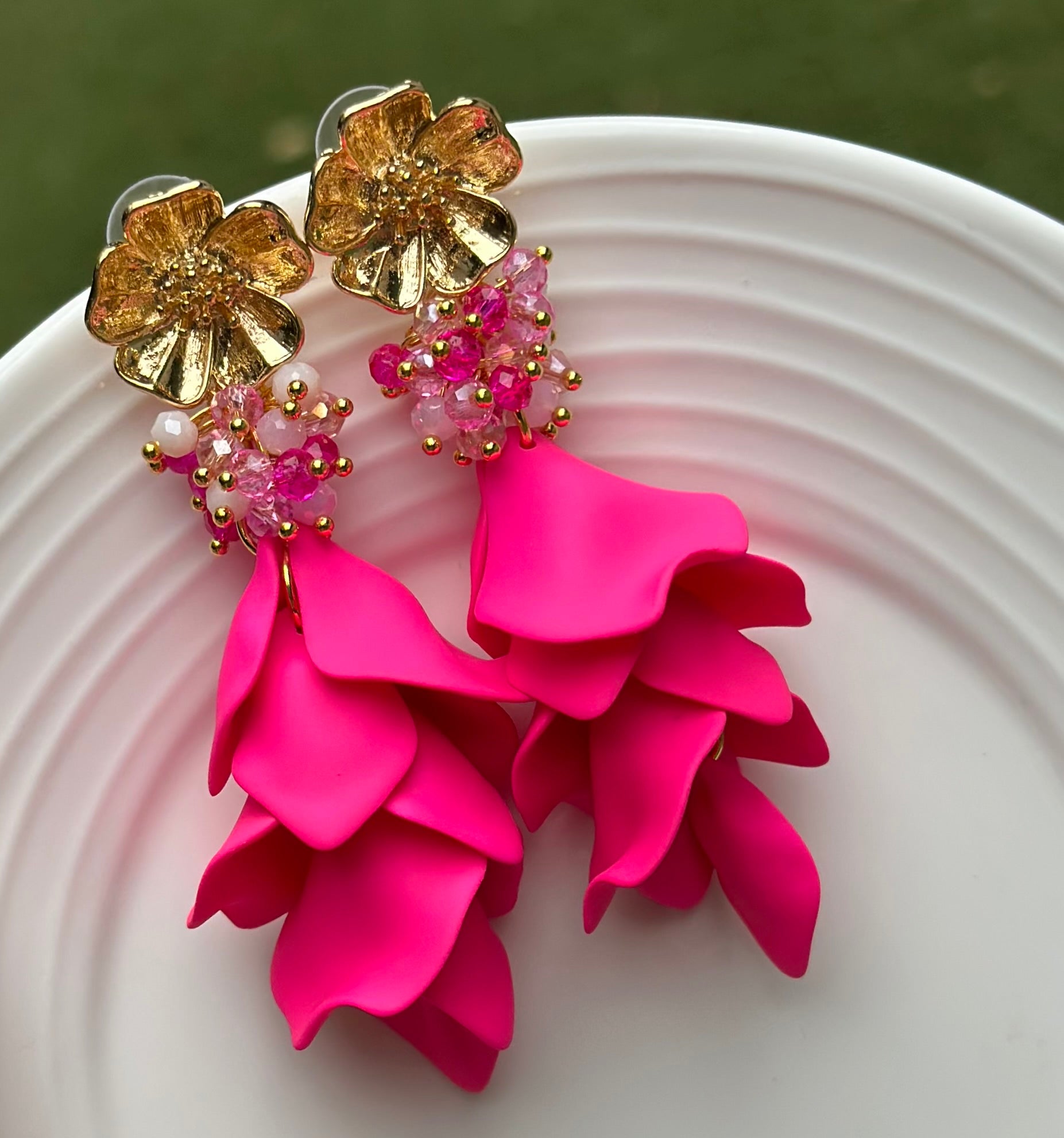 Uno de los favoritos de la temporada! Maxi aros de pétalos fucsia, con flor chapada en oro y un racimo de cristales facetados en tonos rosa. Con una caída femenina y elegante, estos aros no pasarán desapercibidos. Lo mejor? Son muy livianos!