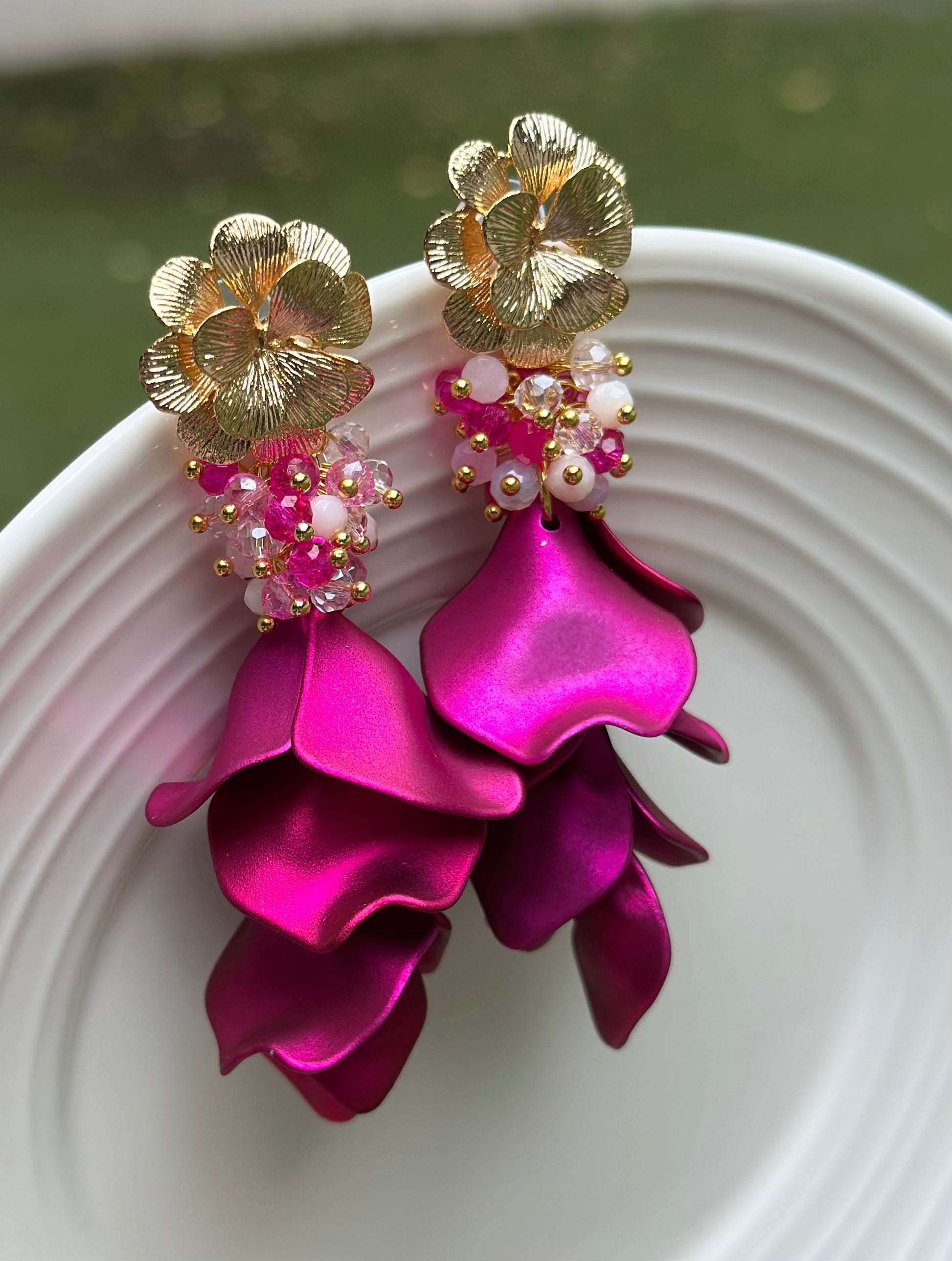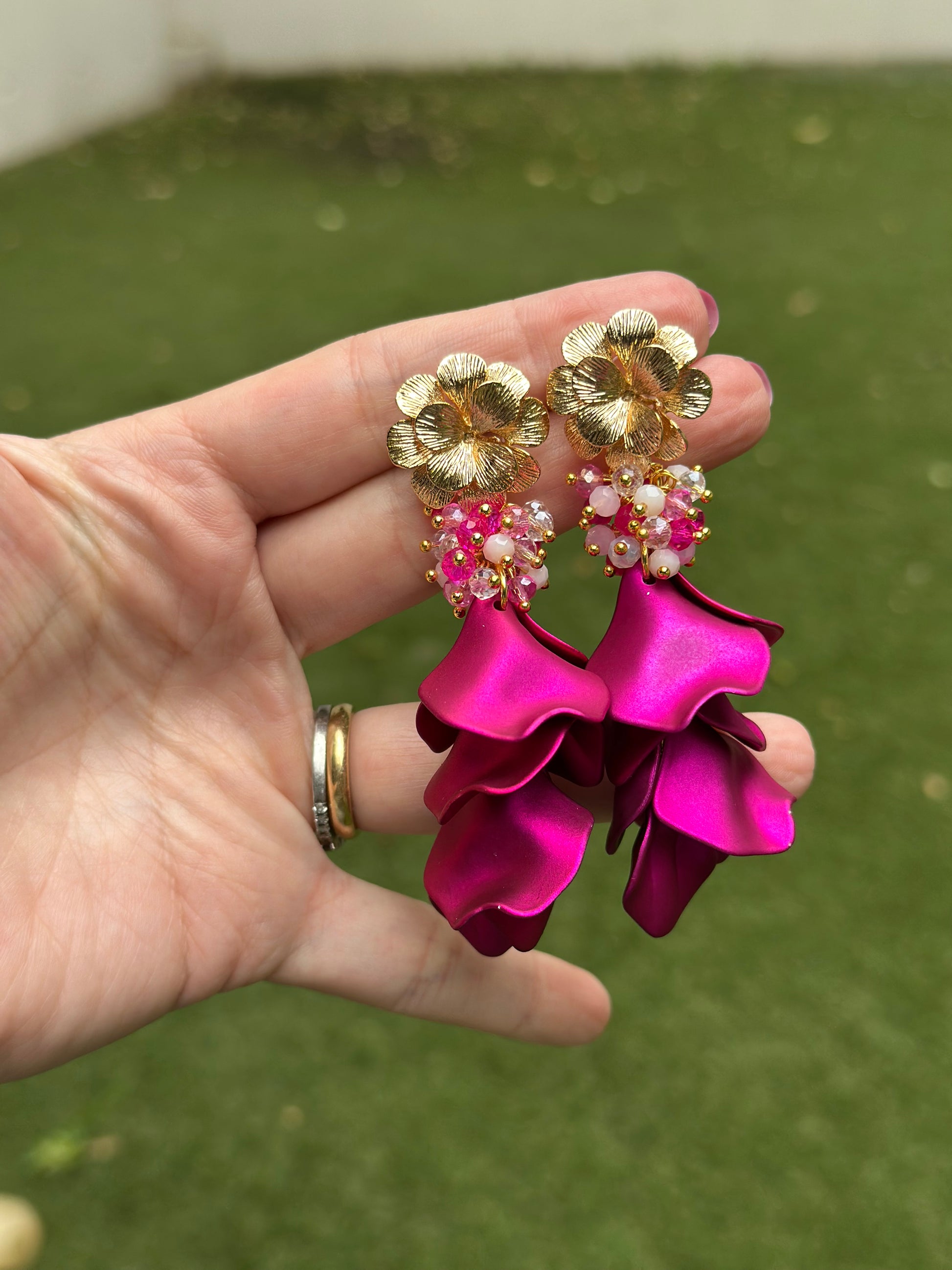 Uno de los favoritos de la temporada! Maxi aros de pétalos fucsia metálicos, con flor chapada en oro y un racimo de cristales facetados en tonos rosa. Con una caída femenina y elegante, estos aros no pasarán desapercibidos. Lo mejor? Son muy livianos!