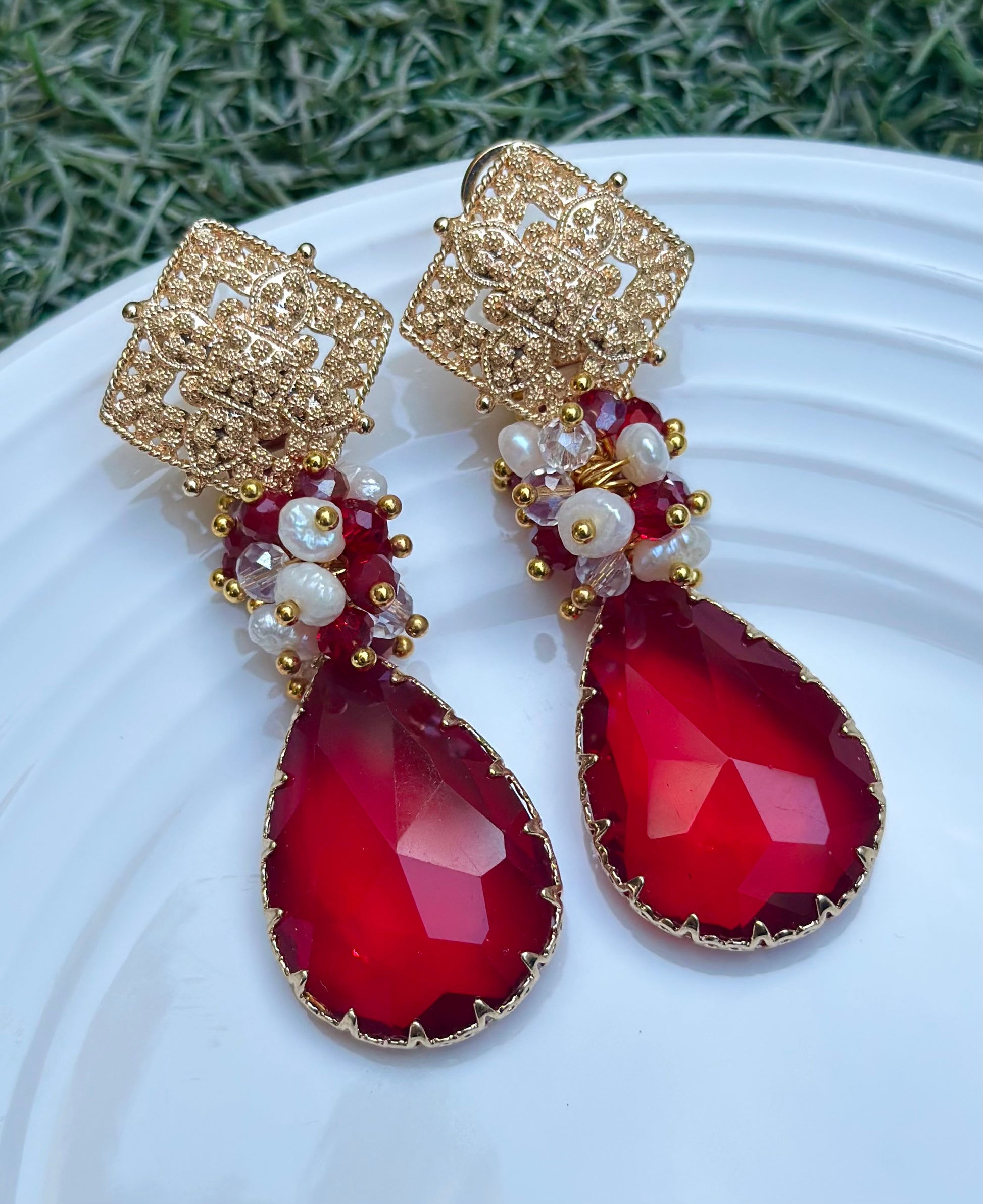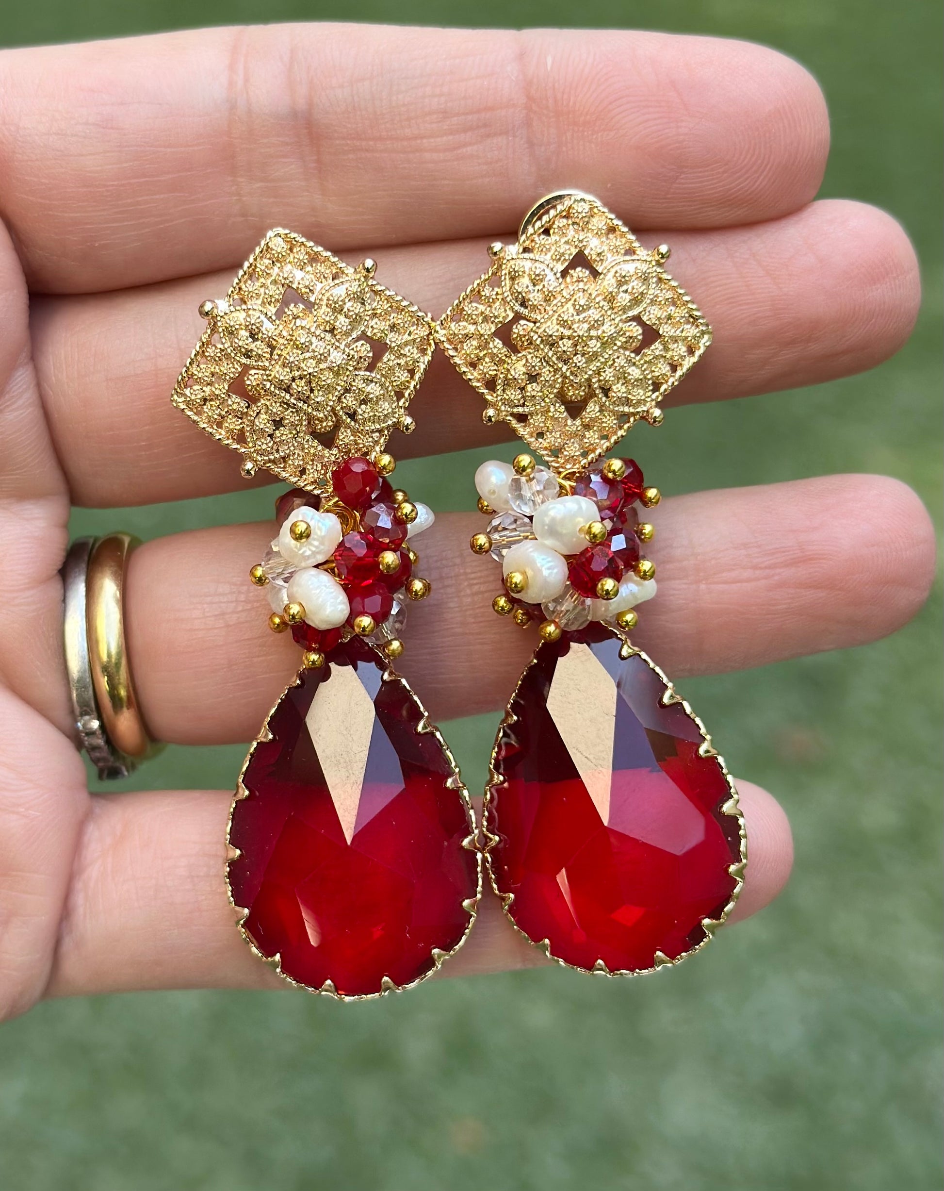 Base chapada en oro, racimo de cristales facetados y perlitas, cristal final rojo.