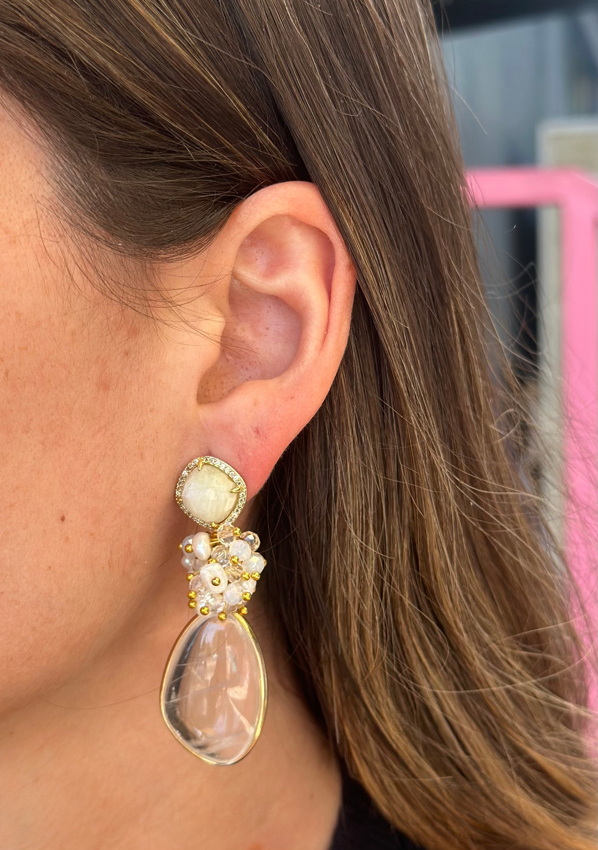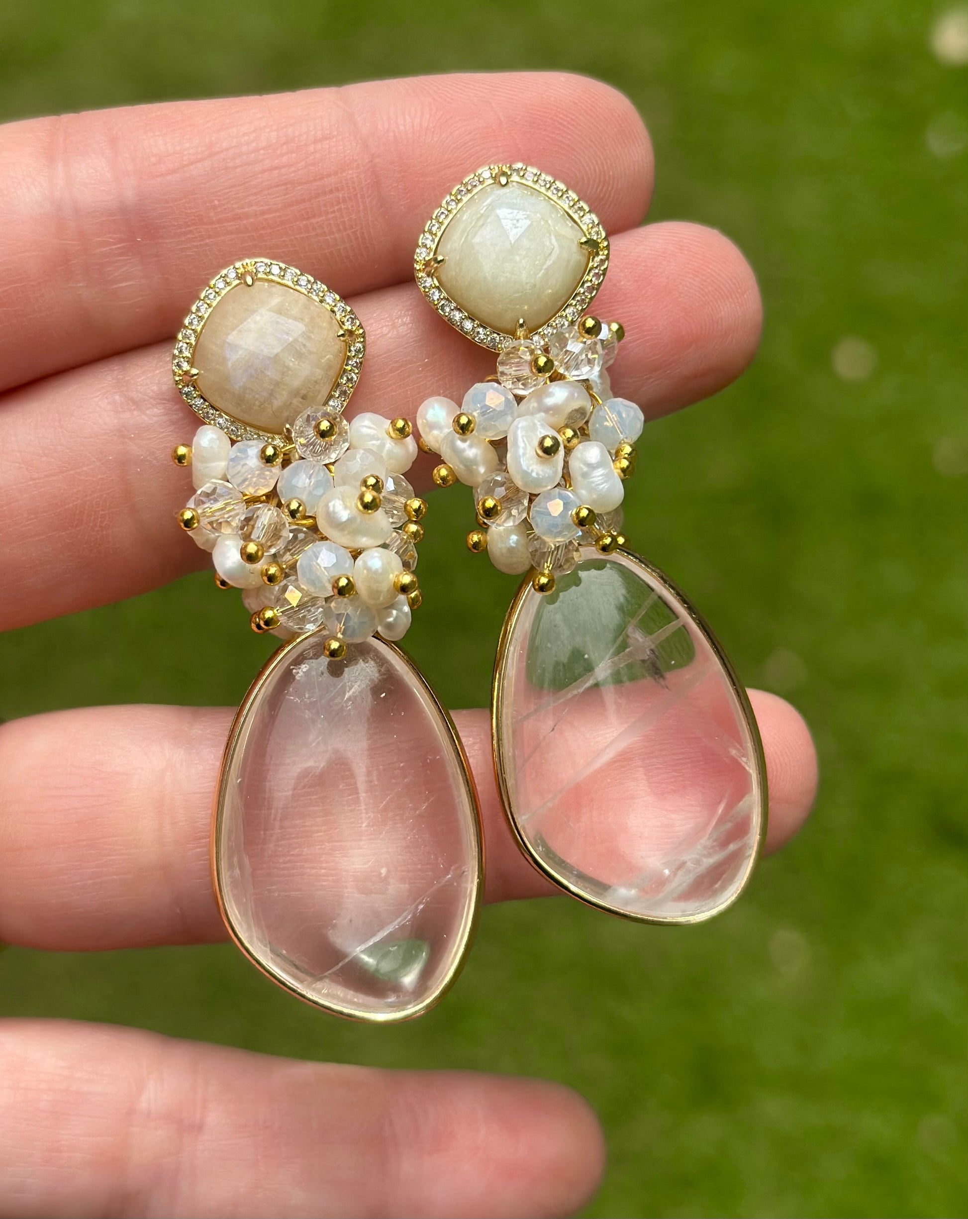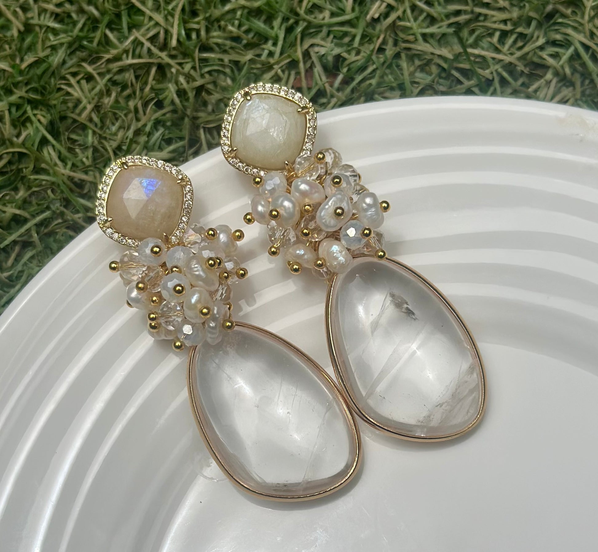 Aro Sabrina fue pensado para novias. Un aro con base de cuarzo blanco chapada en oro y rodeado de circones, racimo de perlas acompañados de cristales y una piedra final de cuarzo transparente.