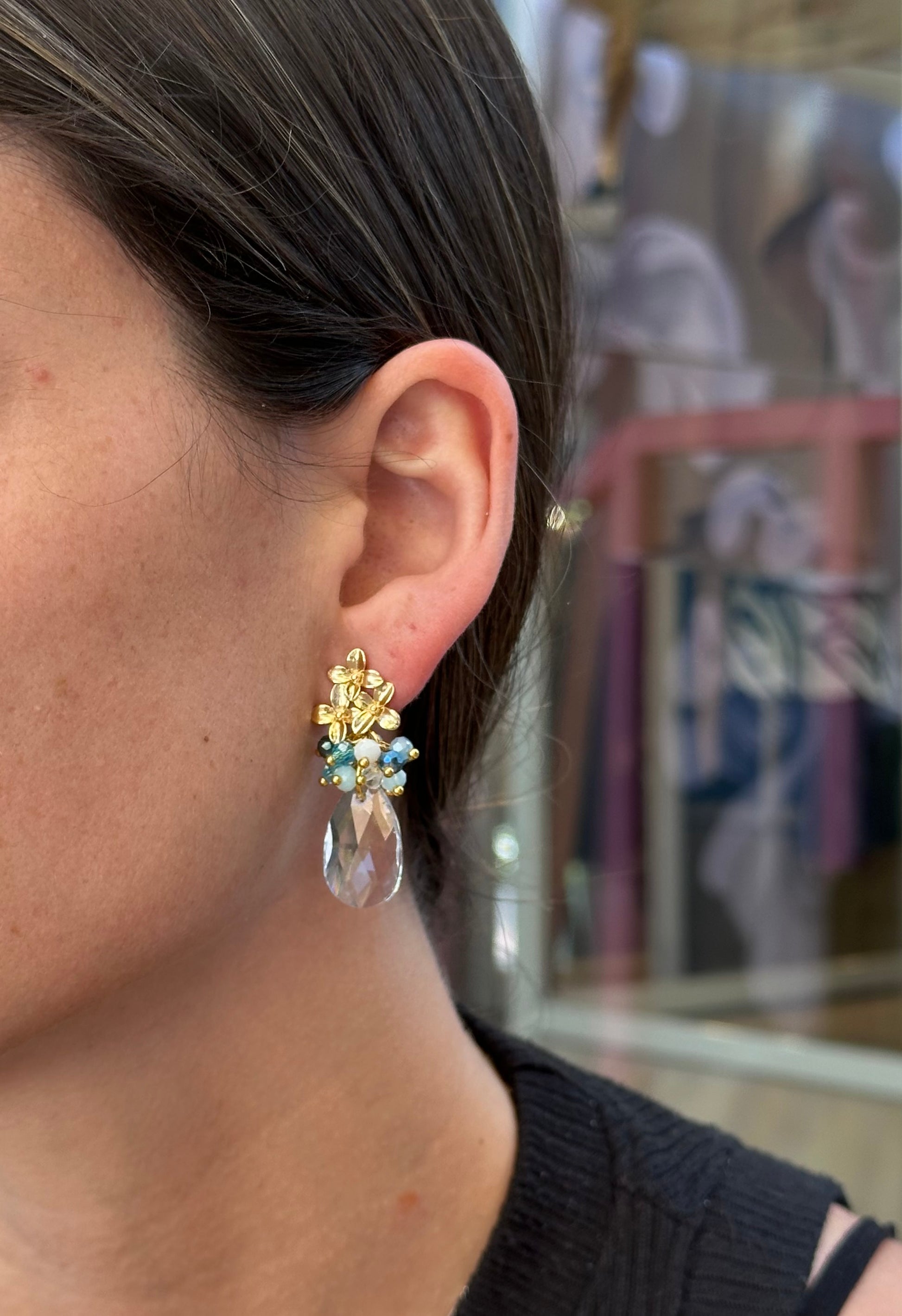 Aros delicados de cristales facetados montados en base de triple flor plateada, chapada en plata, cristal final transparente.
