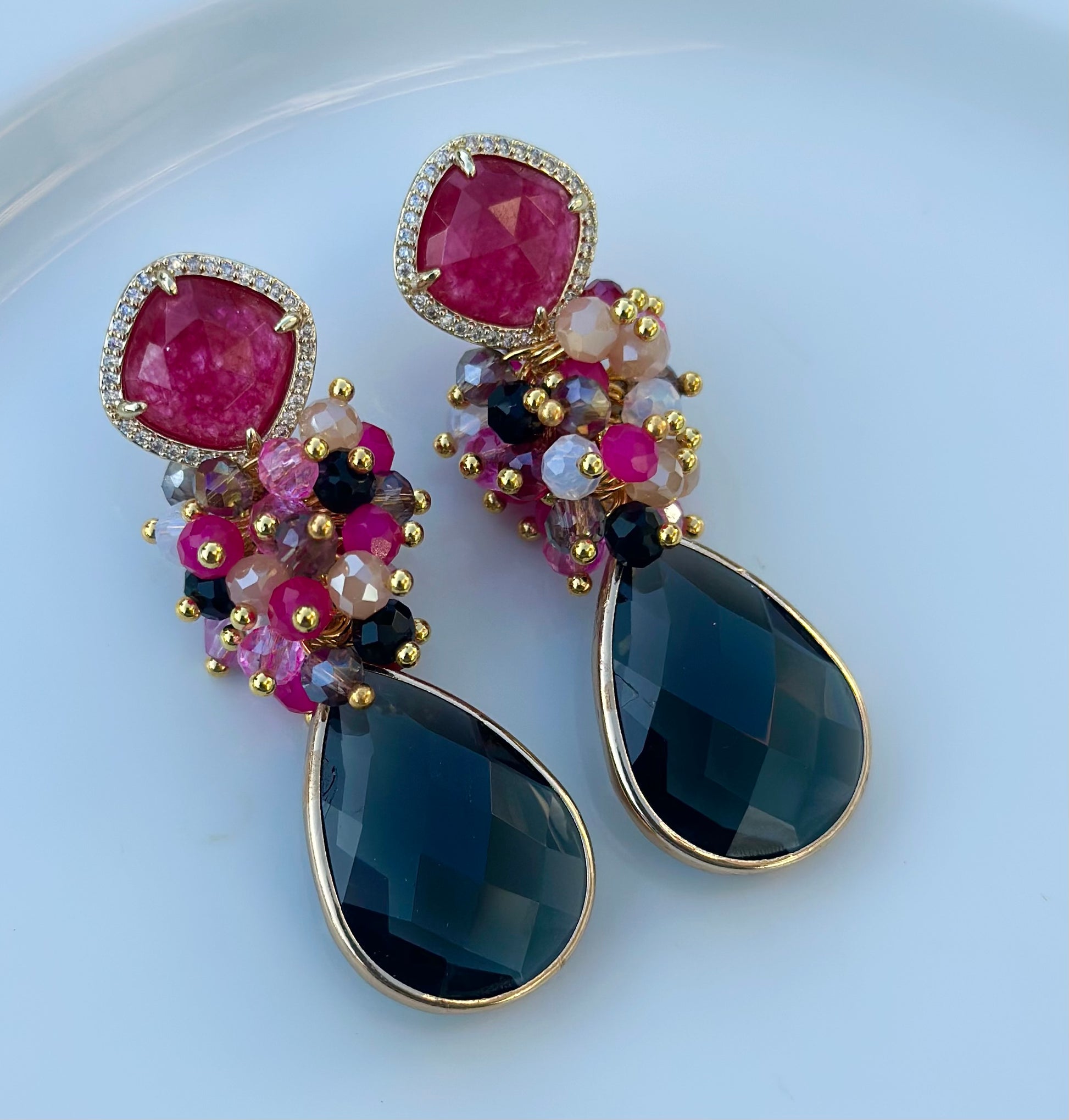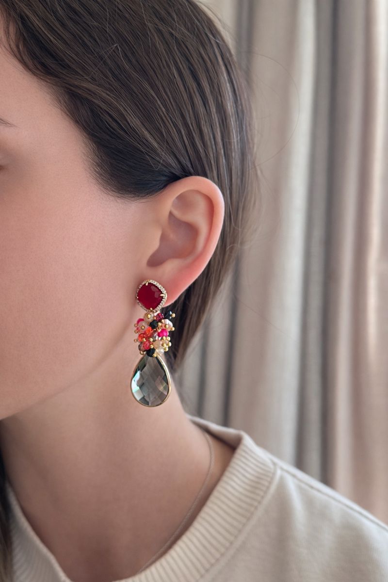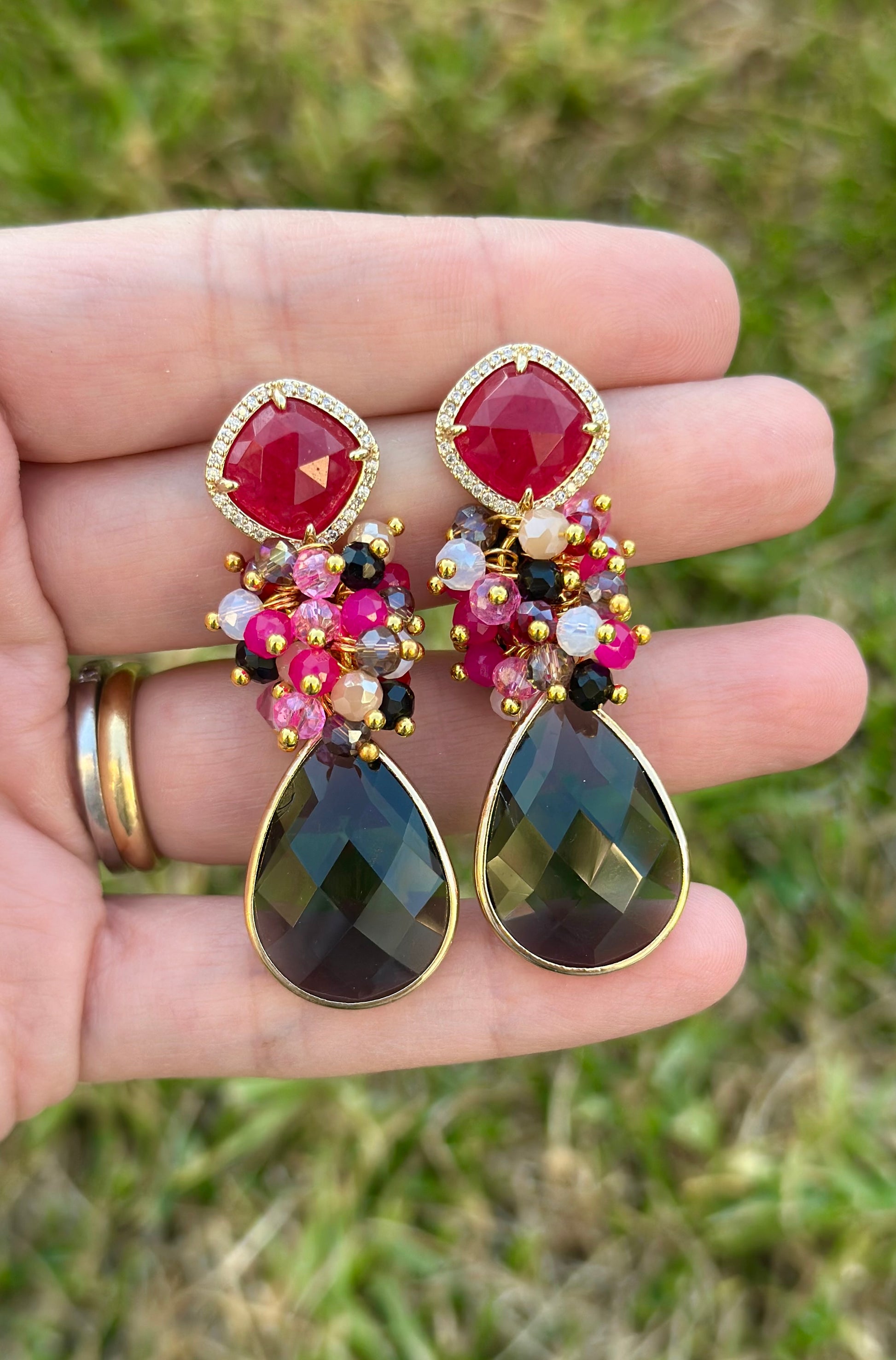 Aro con base en rombo frambuesa, chapada en oro y rodeada de circones, racimo de cristales facetados en tonos humo/negro/fucsias/rojos y piedra final humo. Un diseño con carácter y brillo, pensado para looks de fiesta y ocasiones especiales donde quieres que el accesorio sea protagonista.