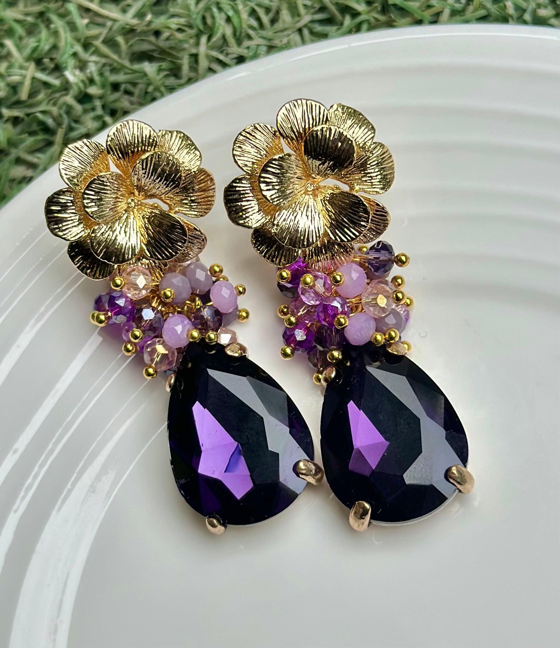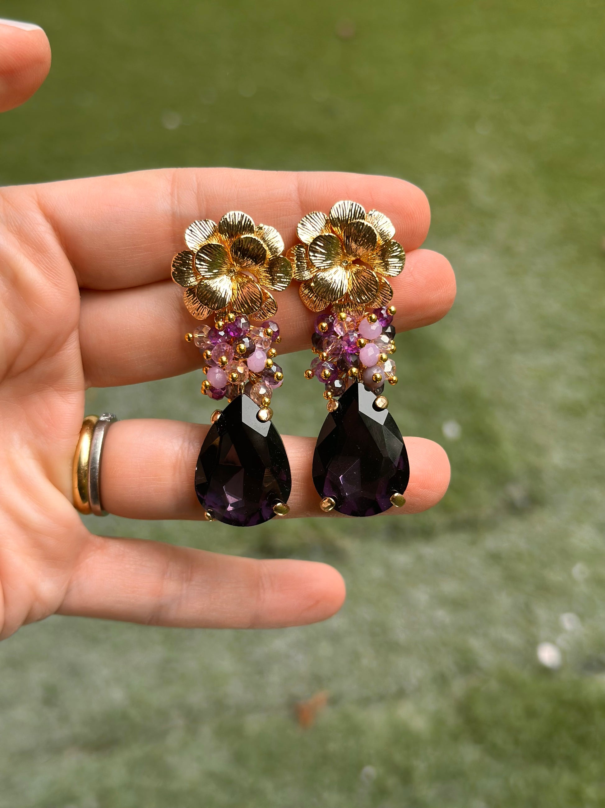 Base de flor chapada en oro, racimo de cristales fascetados y cristal final violeta.
