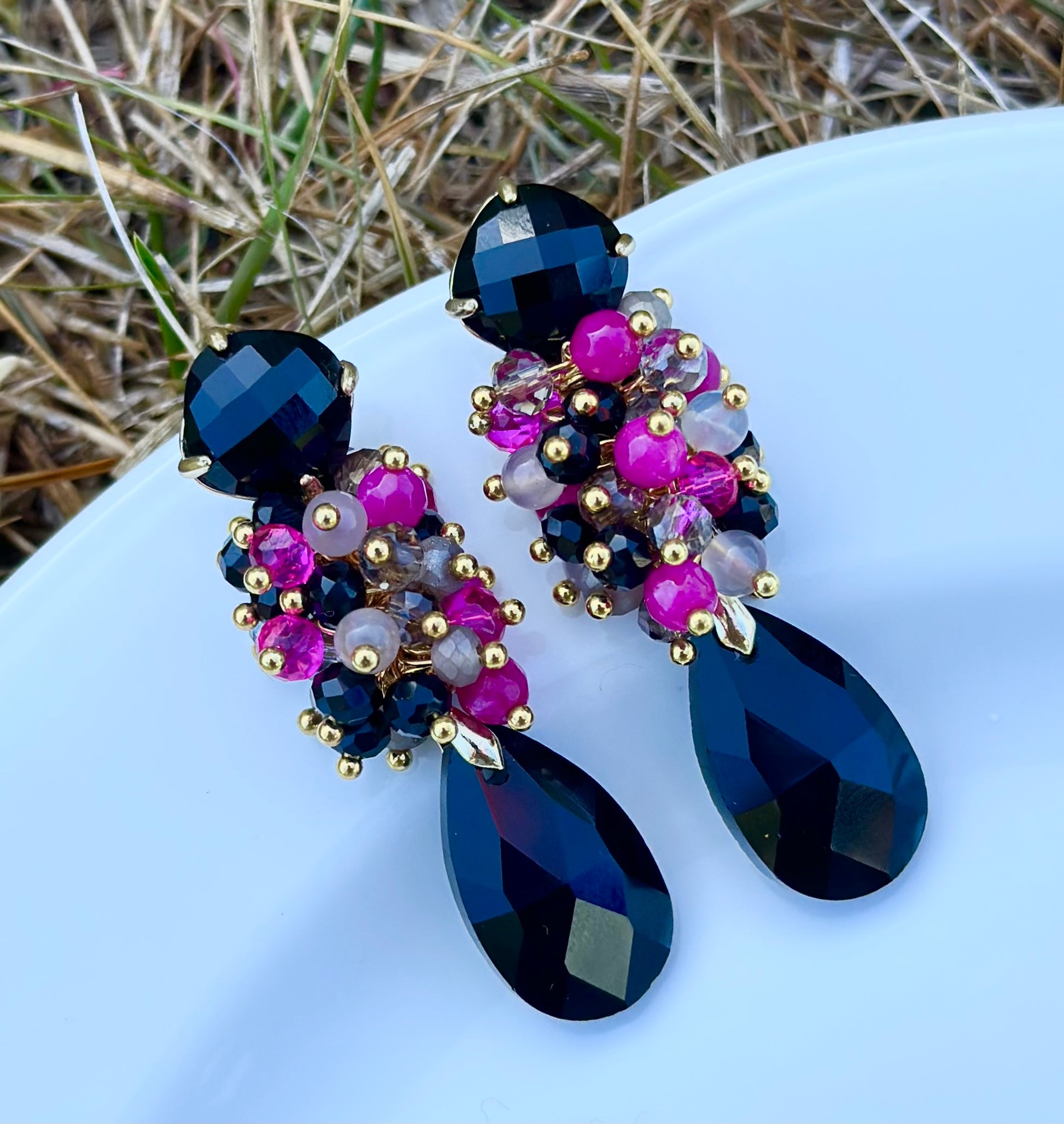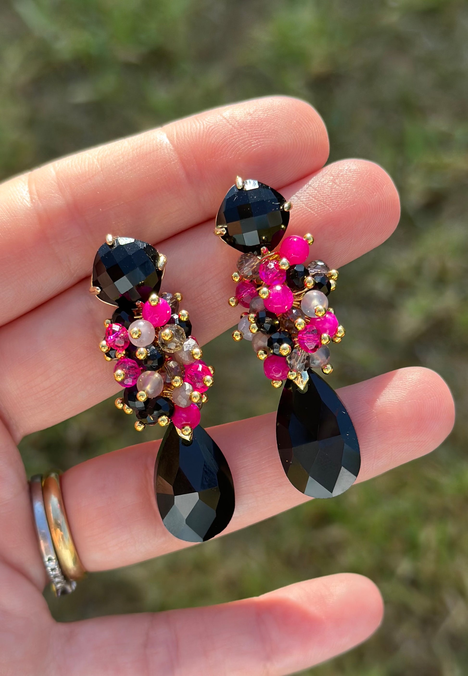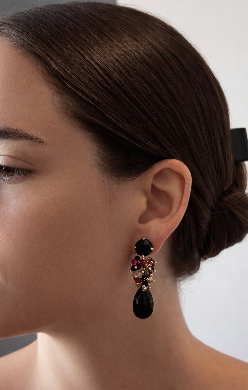 Unos aros armónicos, protagonistas, elegantes, ideales para un evento especial. Creados con base de ágata negra y chapado en oro, racimo de cristales y ágatas facetadas, cristal final negro en forma de gota.
