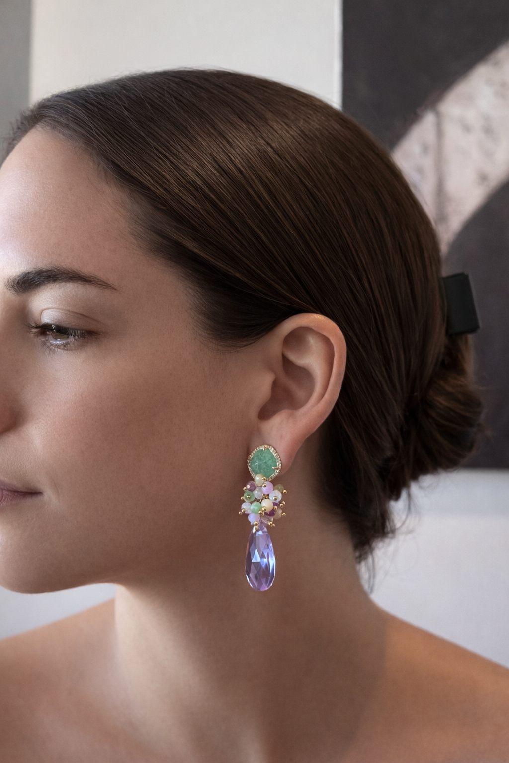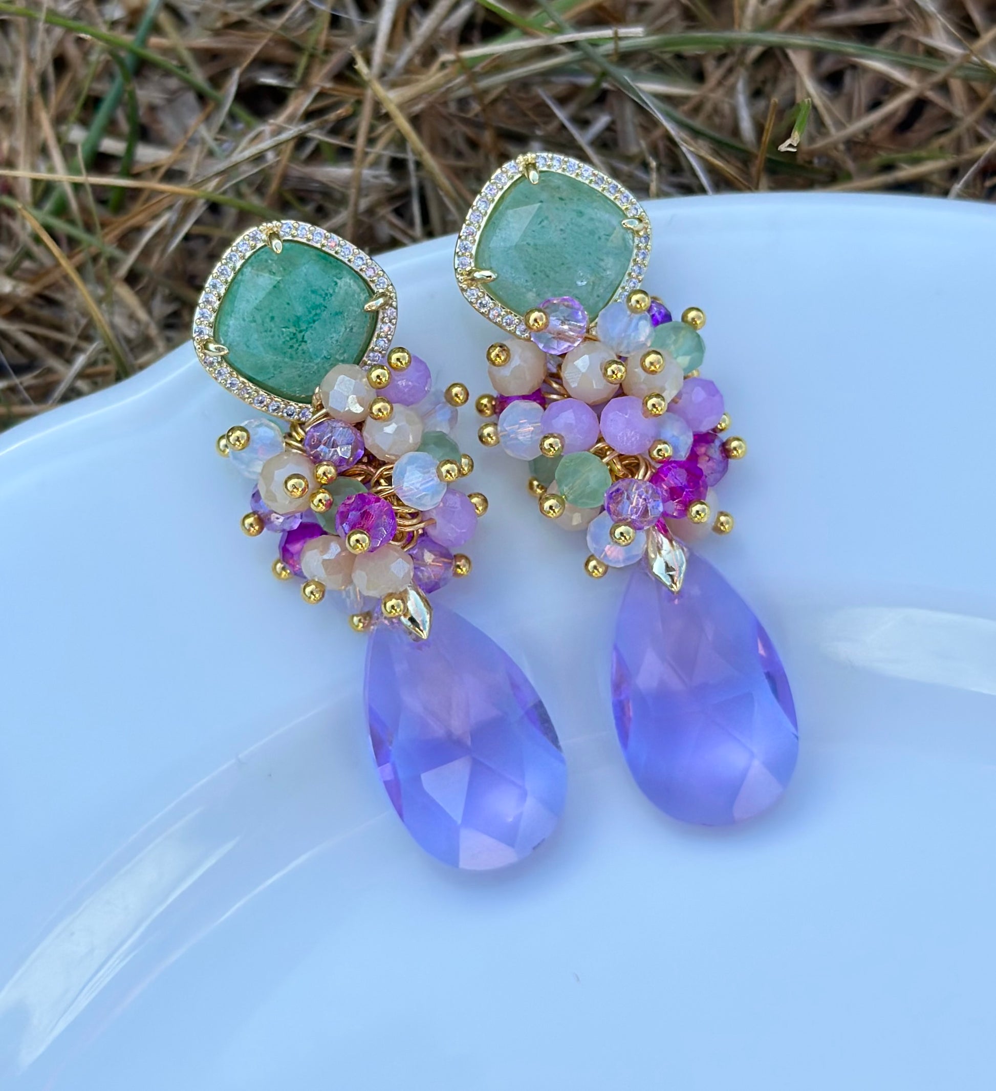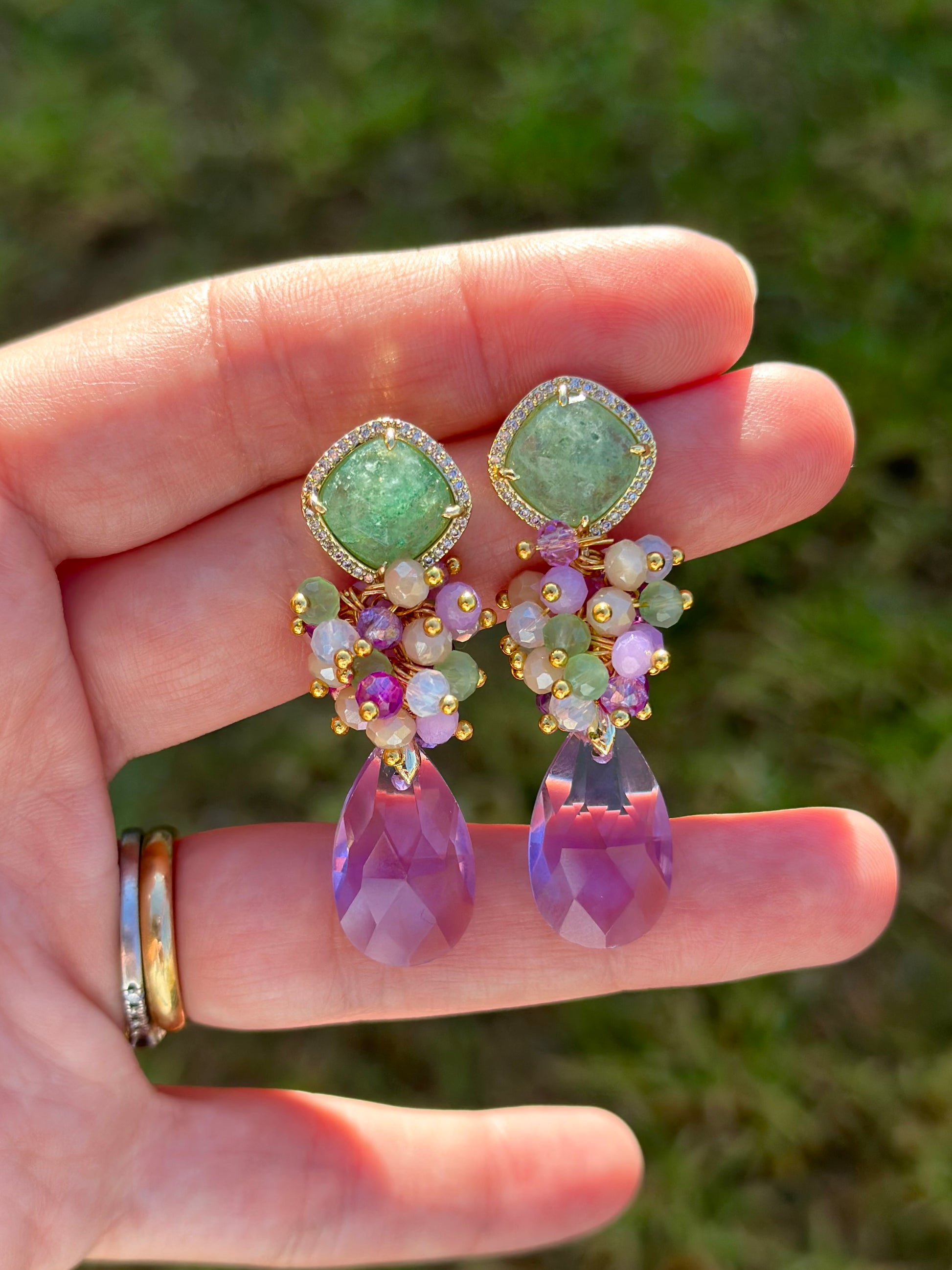 Unos aros contrastantes, protagonistas, elegantes, ideales para un evento especial. Creados con base de cuarzo verde rodeado de circones y chapado en oro, racimo de cristales y ágatas facetadas, cristal final lila en forma de gota.
