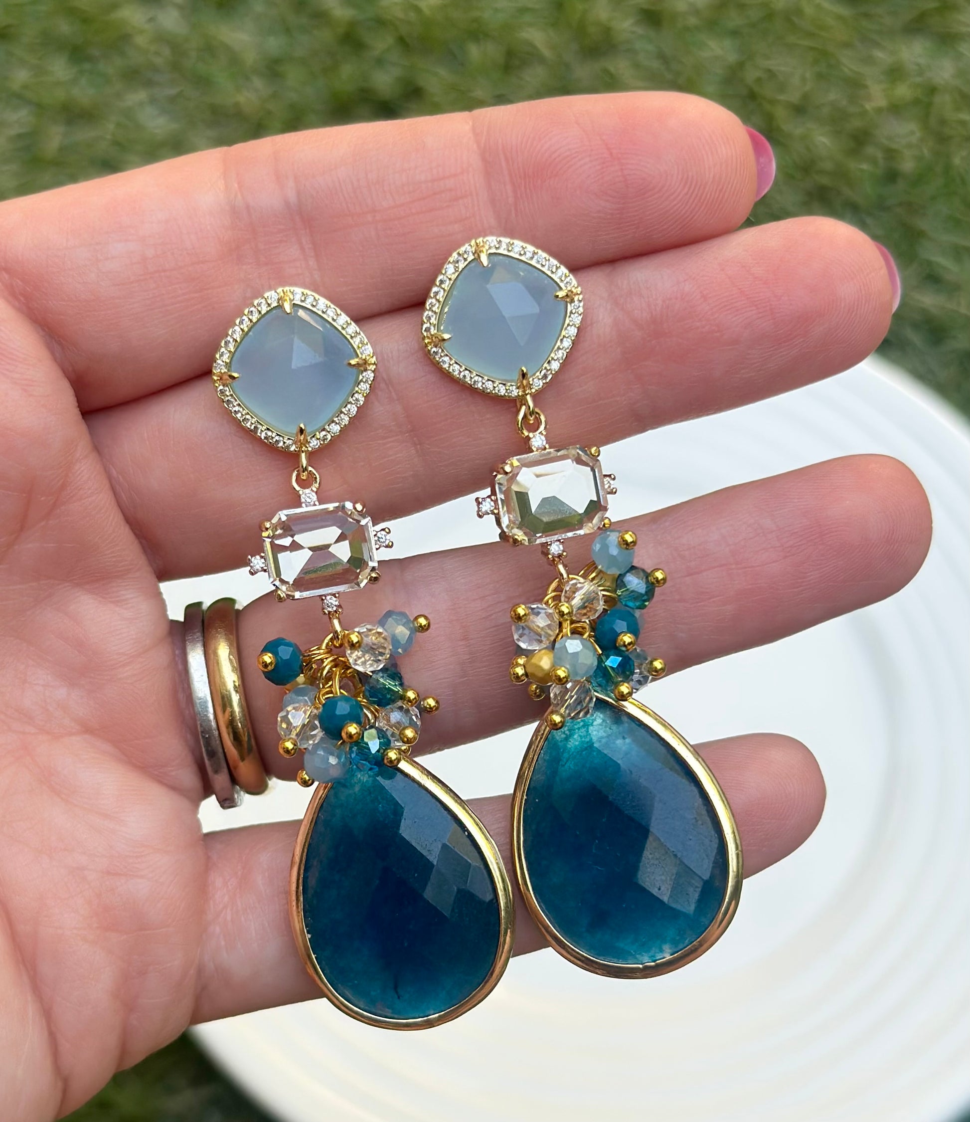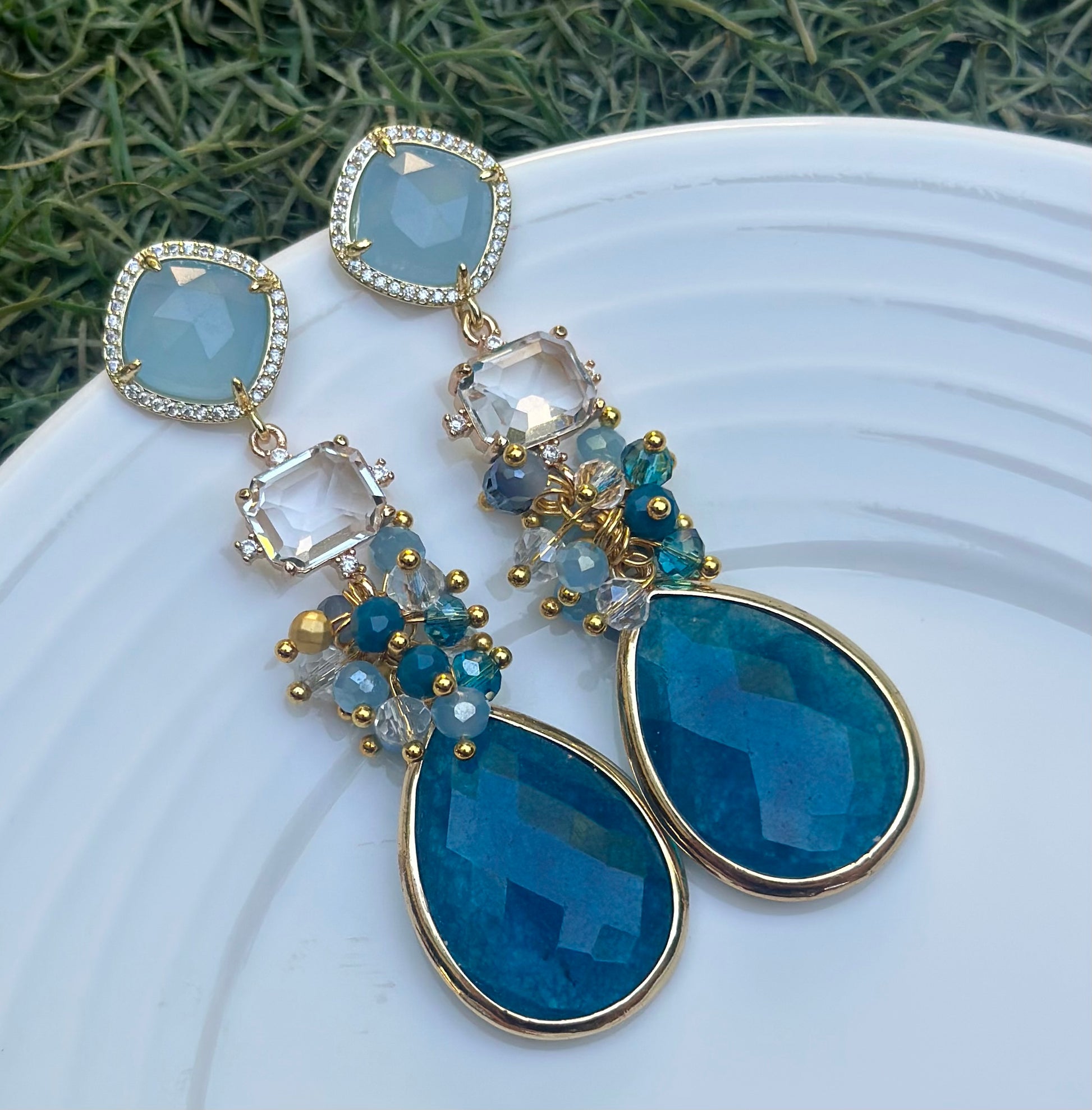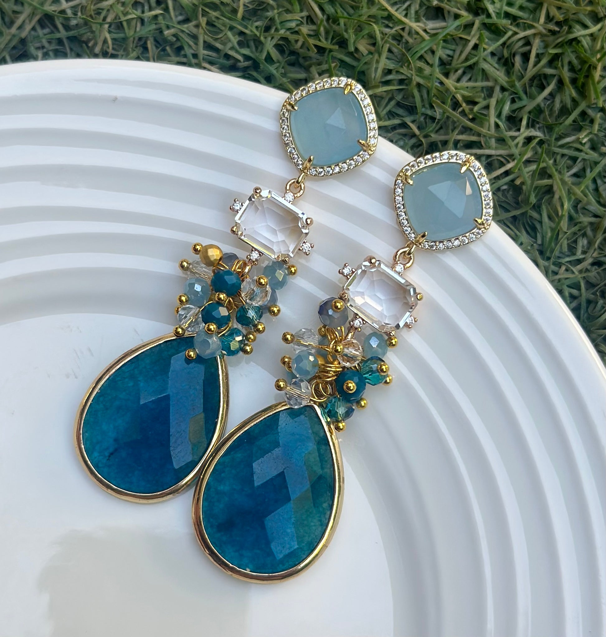 Un aro maravilloso, protagonista, armónico. Tonalidades celeste y turquesa, completamente chapado en oro con cristales y piedras naturales.