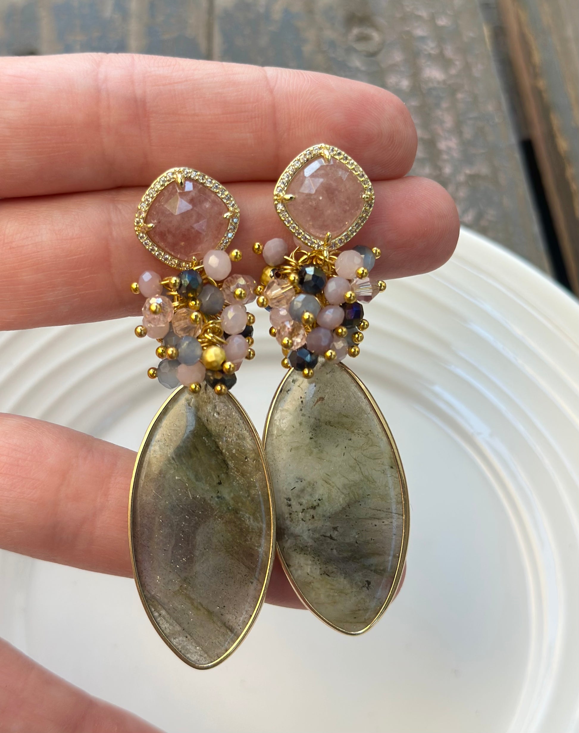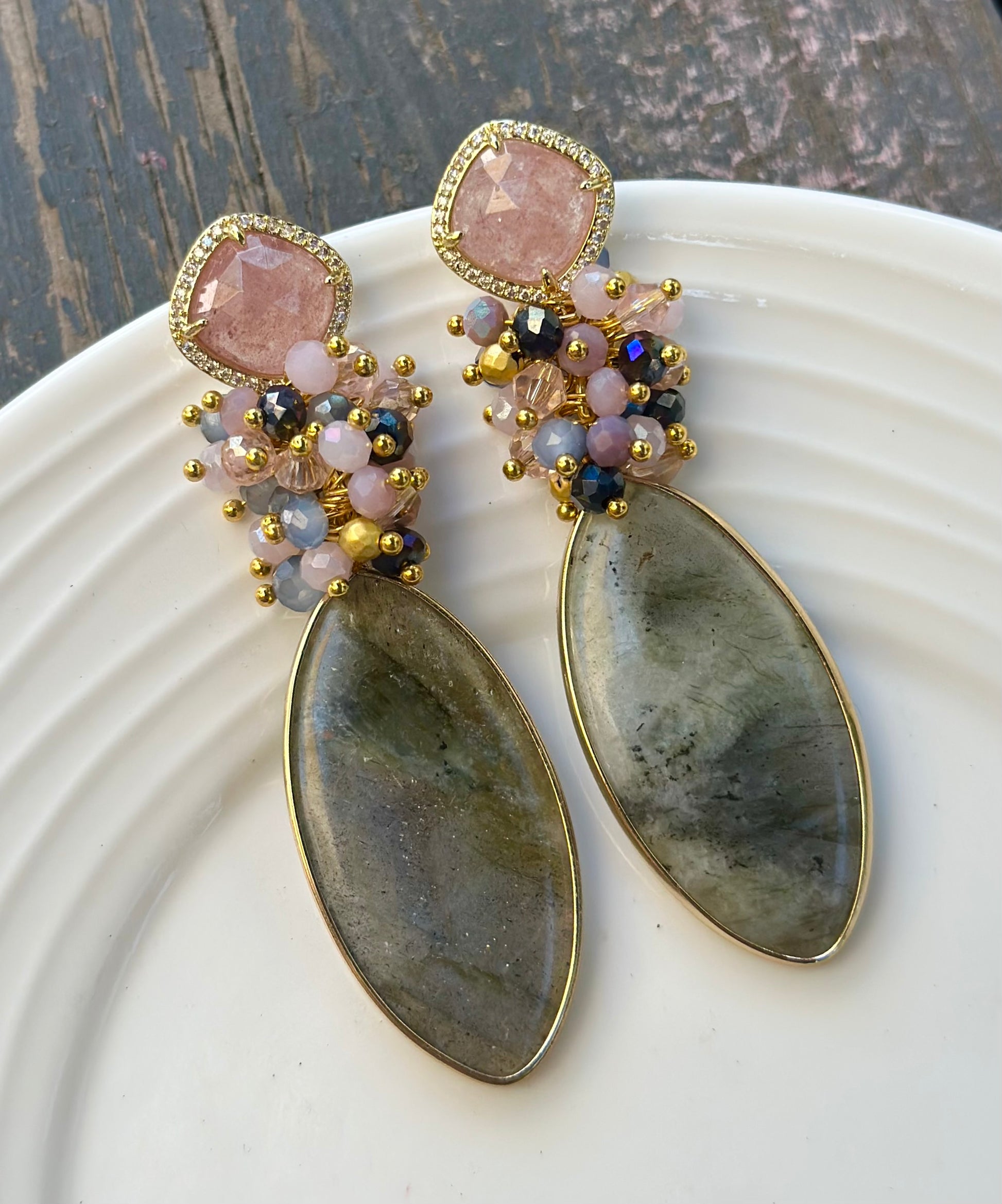 Un aro maravilloso y protagonista. Chapado en oro en su totalidad, base de cuarzo rosado, racimo de cristales fascetados y piedra final labradorita.
