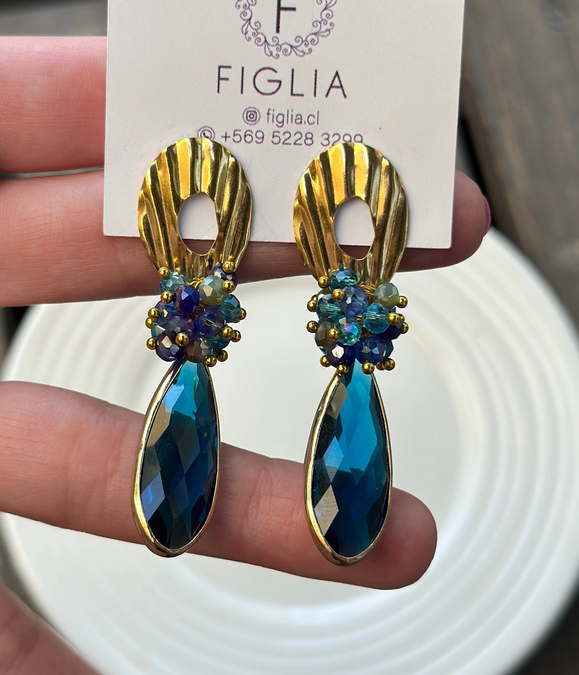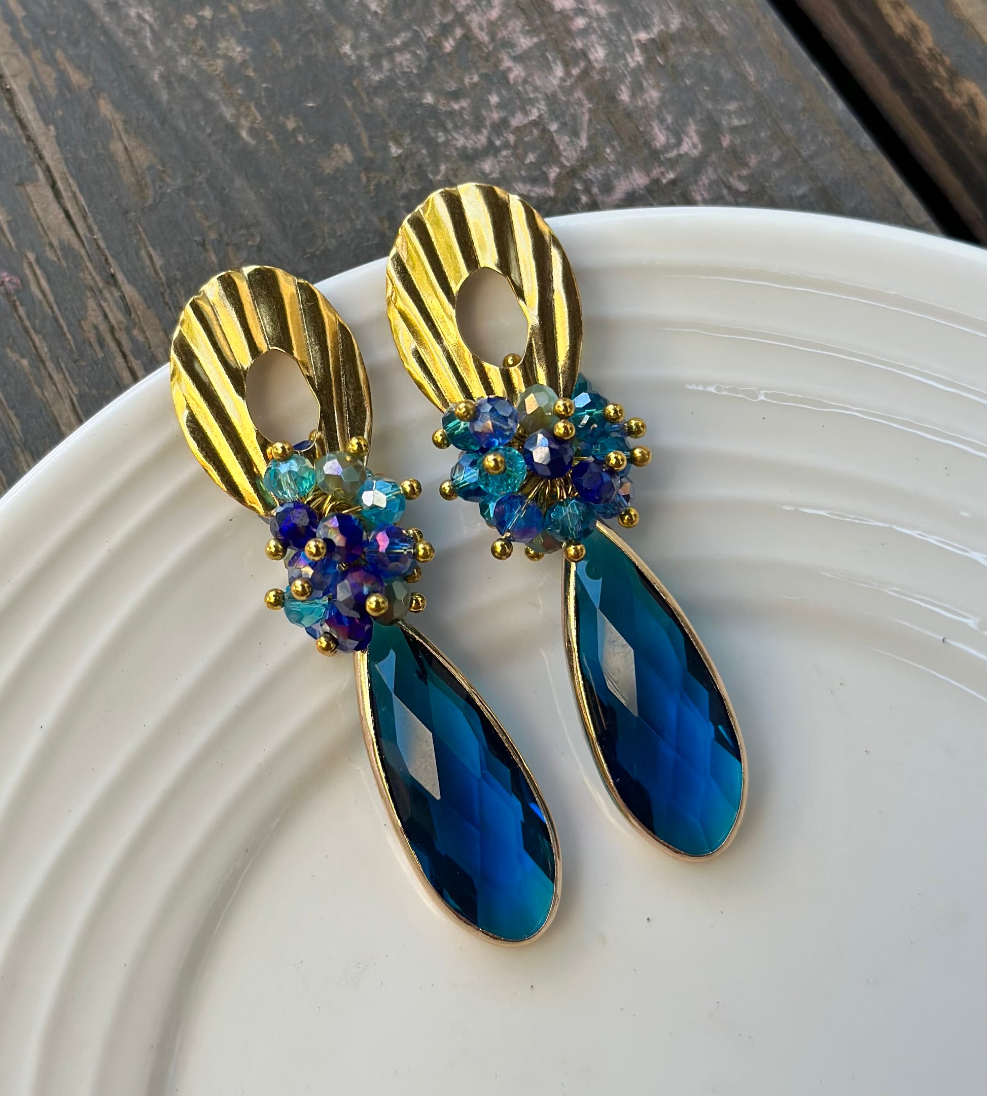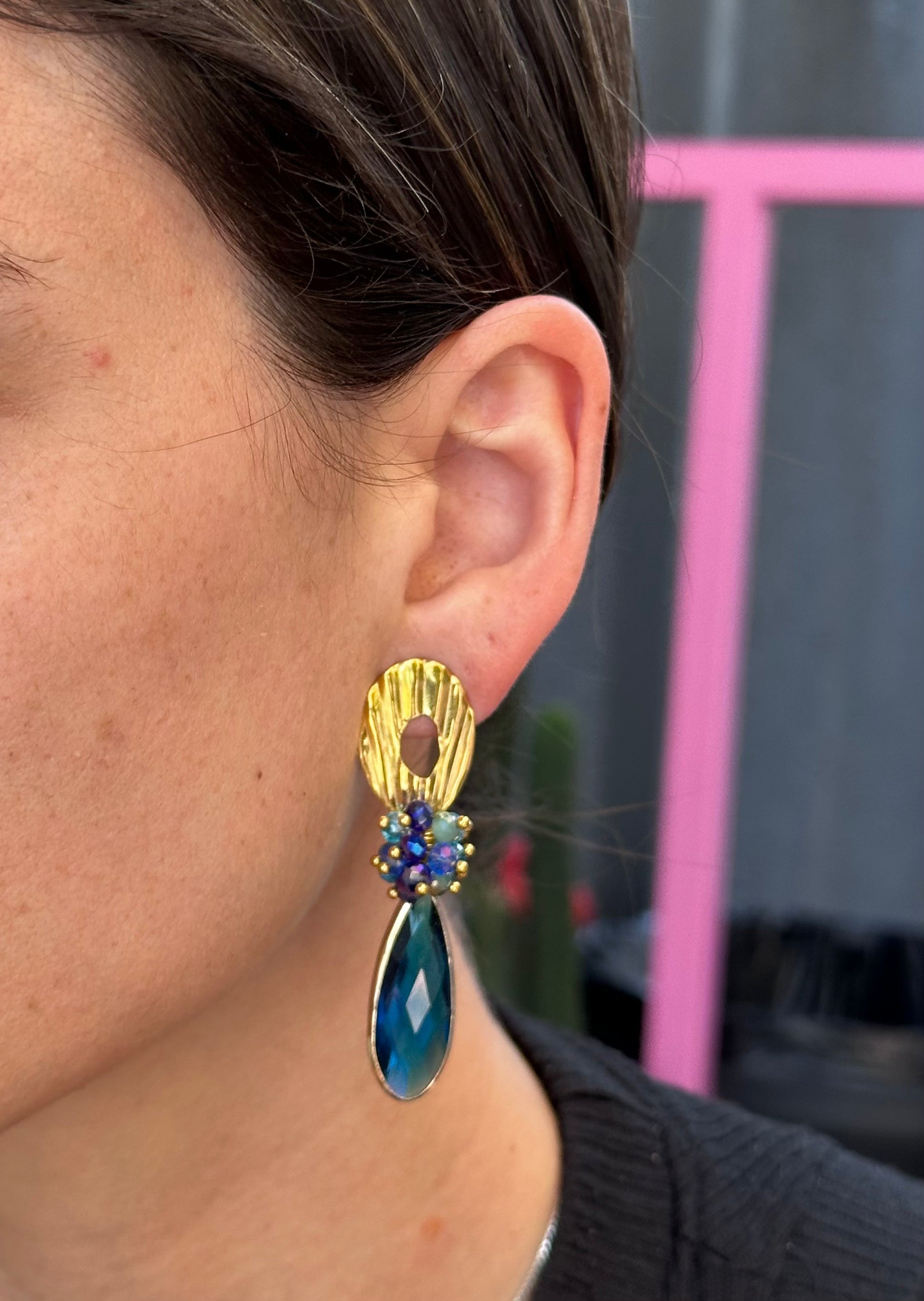 Un aro delicado y elegante, con caída en cristal de gota. Base chapada en oro y racimo de cristales facetados.