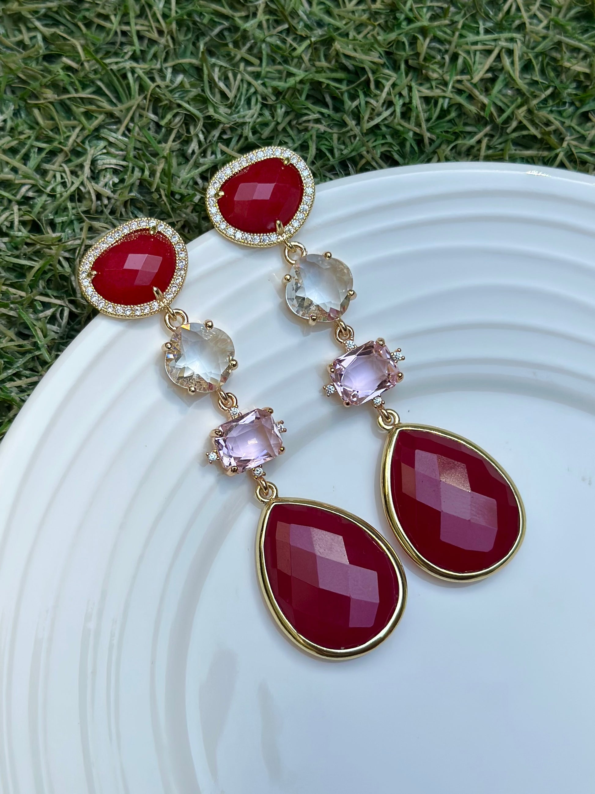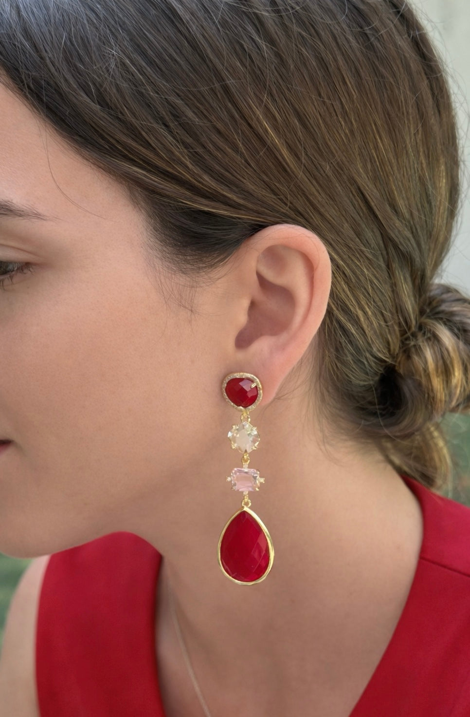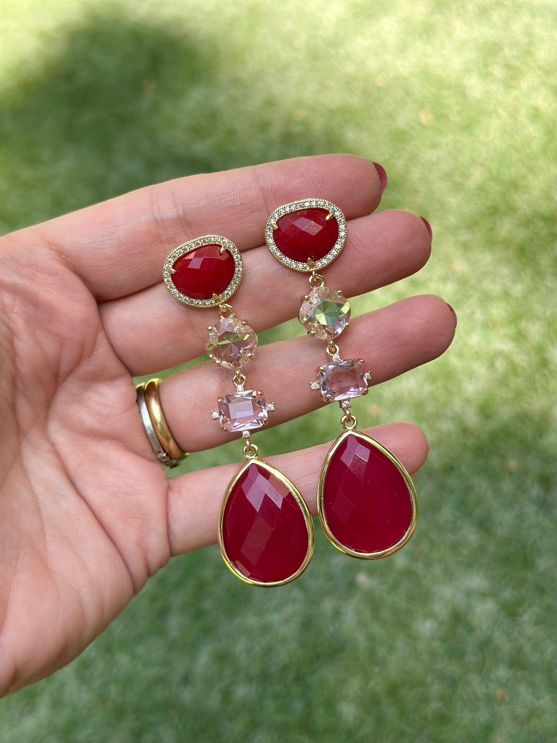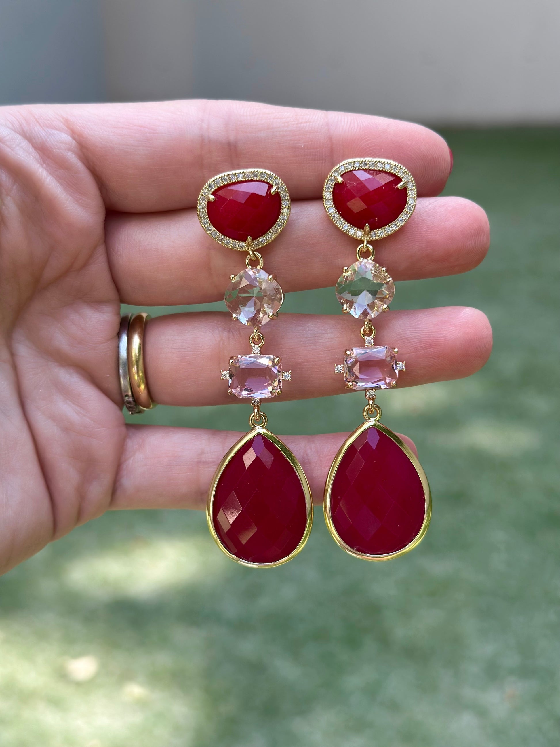 Unos aros armónicos, protagonistas, elegantes, ideales para un evento especial. Creados con base y piedra final de jade rojo y chapado en oro, conectores de cristal transparente y rosado.